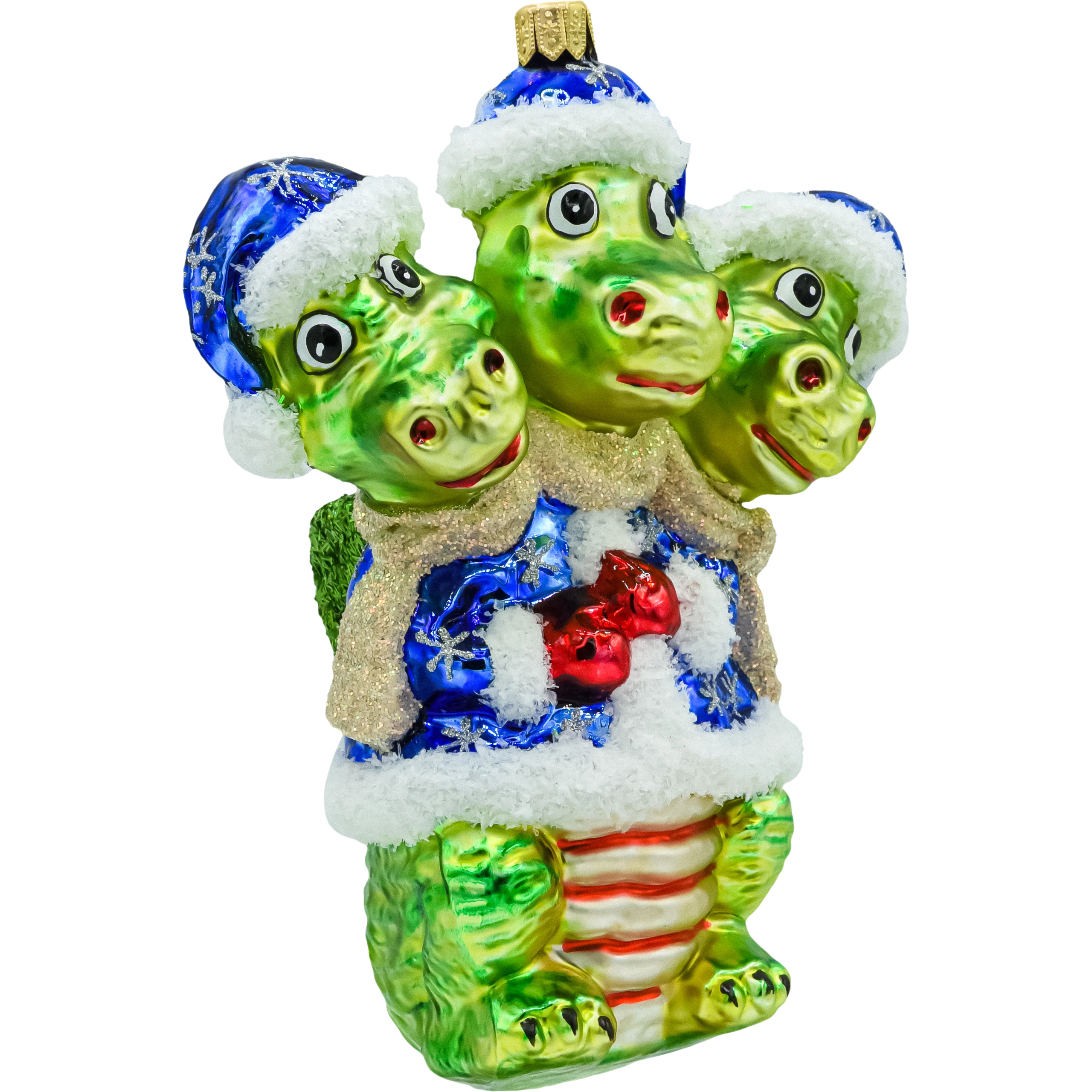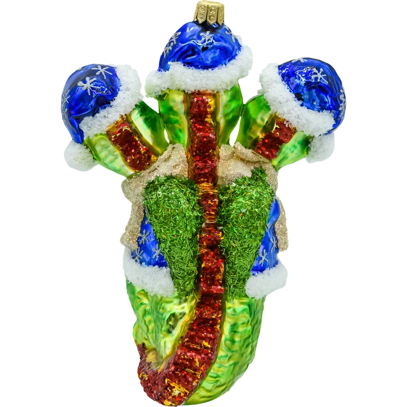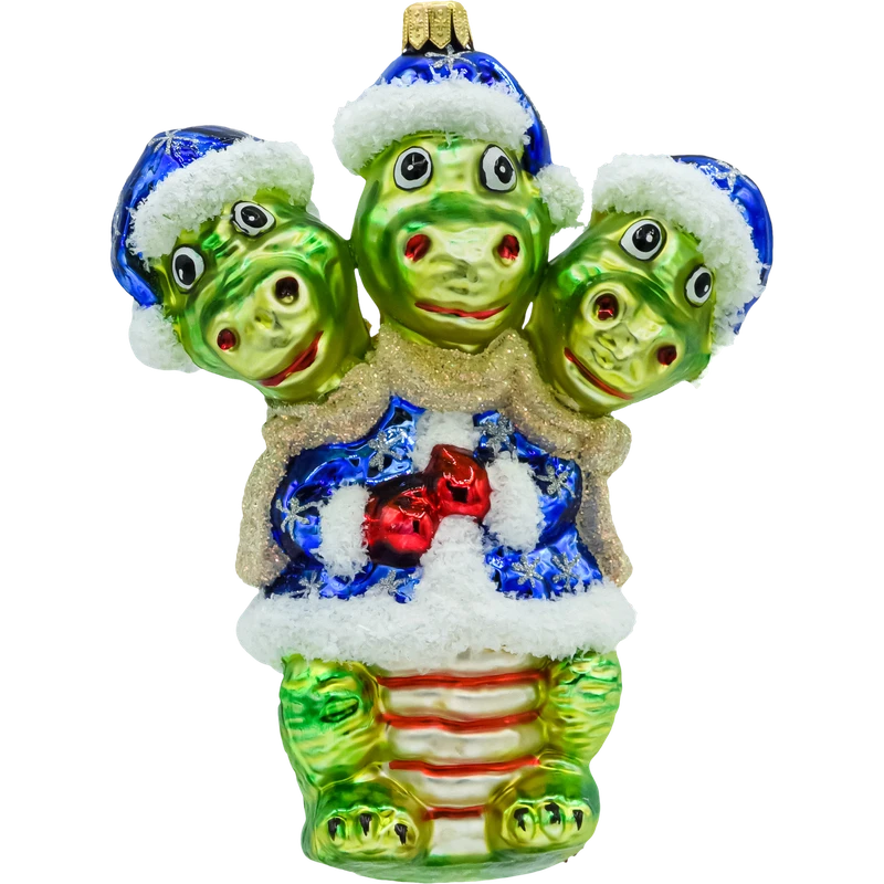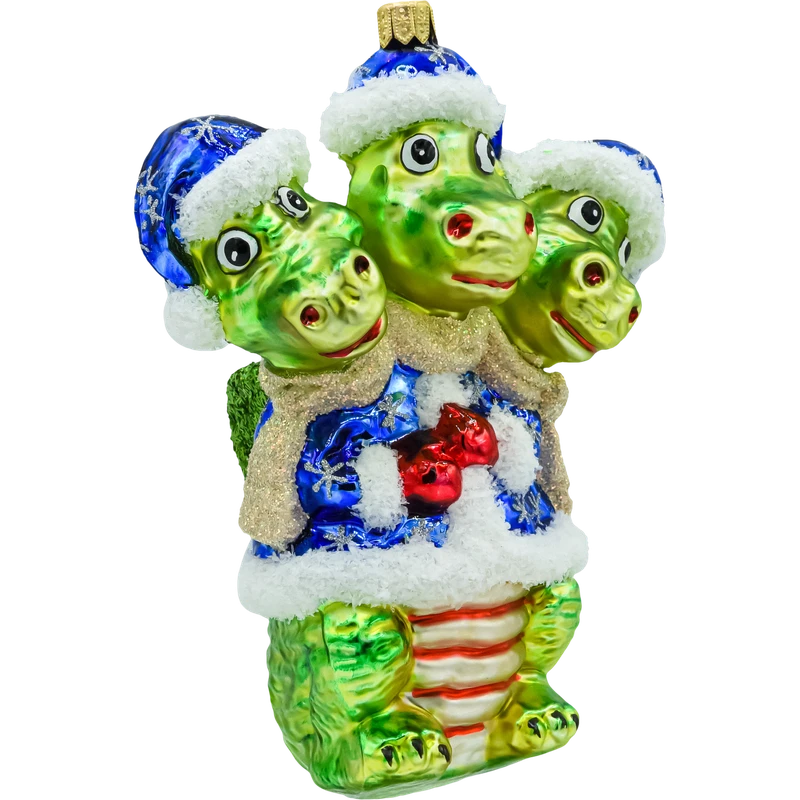 Fantazja i świąteczny humor w jednym! Szklana bombka „Smok trzygłowy” przedstawia sympatycznego, zielonego smoka z trzema uśmiechniętymi głowami w granatowych czapkach Mikołaja ze „śnieżnym” futerkiem. Smok ma na sobie błękitny, zimowy kubraczek wyszywany srebrnymi śnieżynkami, złoty szalik, a na piersi połyskują czerwone dzwoneczki. Grzbiet i ogon zdobią łuski z czerwonego brokatu, a skrzydła mają głęboką, igiełkową fakturę w butelkowej zieleni. Całość mieni się metalicznym połyskiem – to radosna bombka figuratywna dla fanów bajek, fantasy i niebanalnych dekoracji.