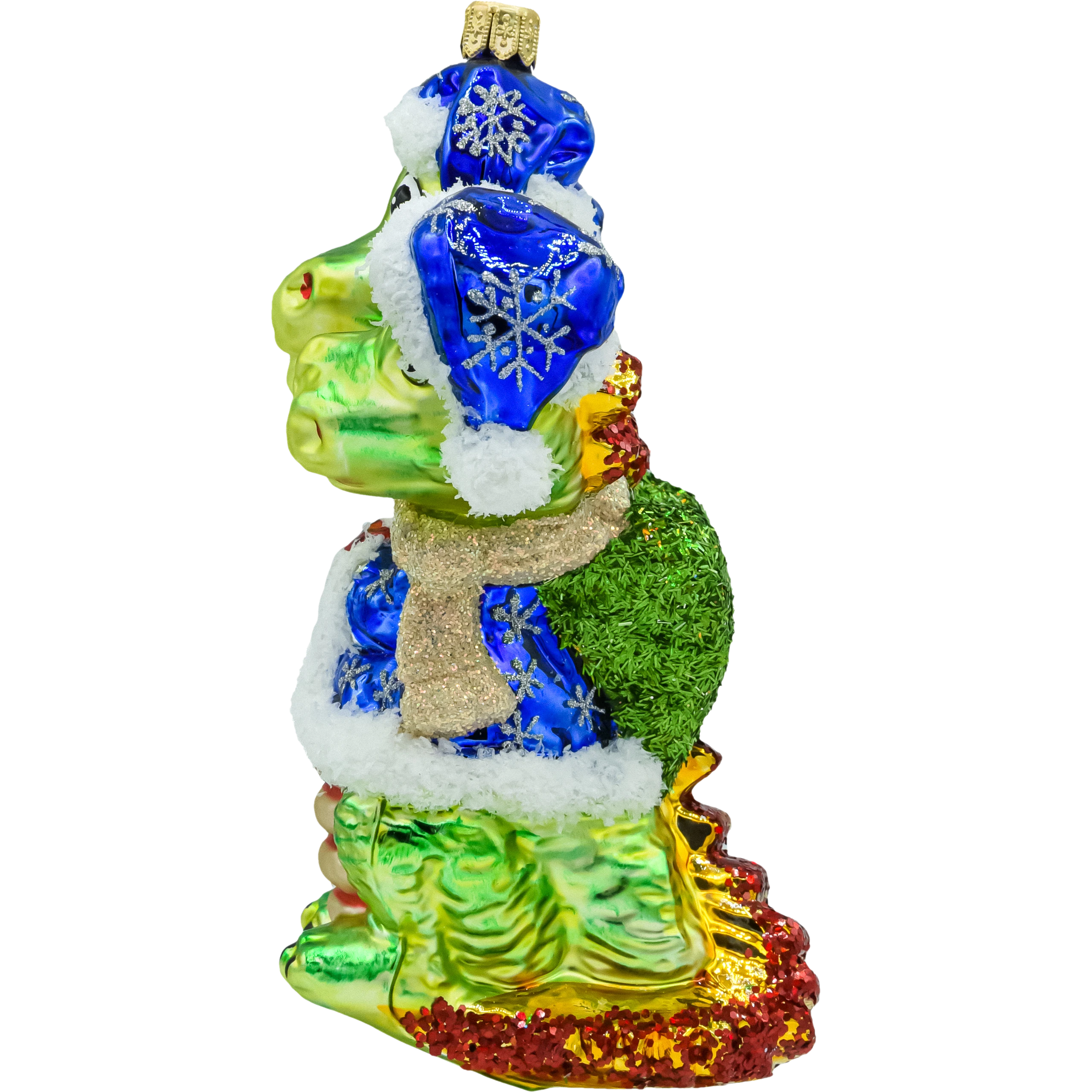 • Design 360°: dopracowany z każdej strony – trzy czapki z płatkami śniegu, teksturowane skrzydła, grzbiet i ogon z czerwonym brokatem.