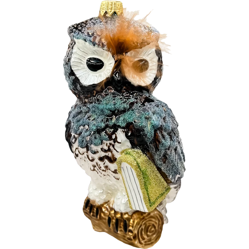 Bombka została stworzona z dbałością o każdy detal. Czarne, błyszczące oczy pięknej, brązowej sowy są otoczone brokatowym wykończeniem, a realistycznie oddane pióra nadają jej naturalnego wyglądu. W jednej łapie sowa trzyma złotą księgę, co symbolizuje wiedzę i mądrość – doskonały motyw na świąteczny czas refleksji i rodzinnych spotkań.