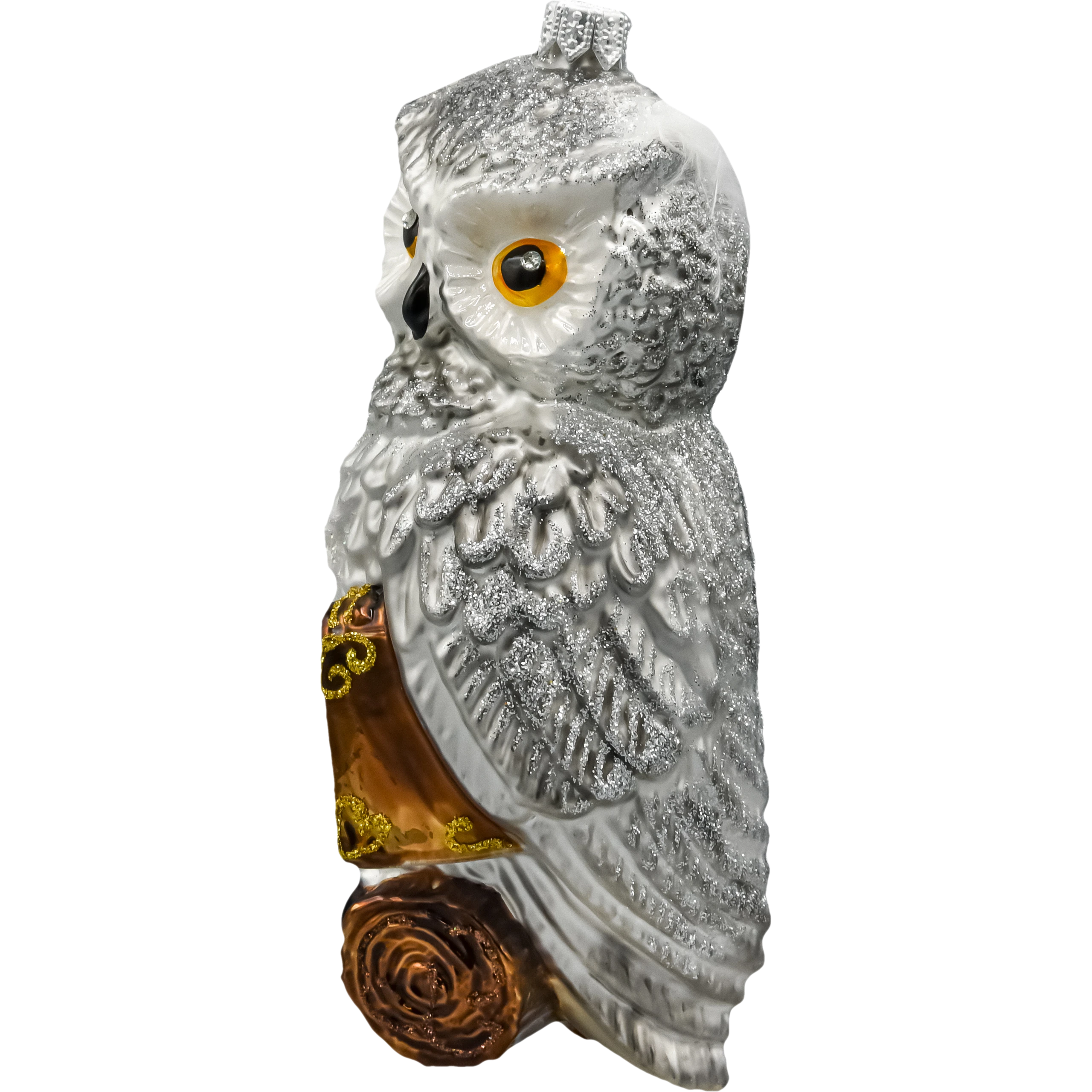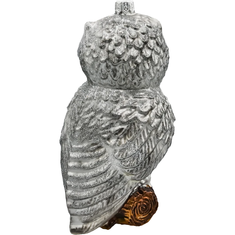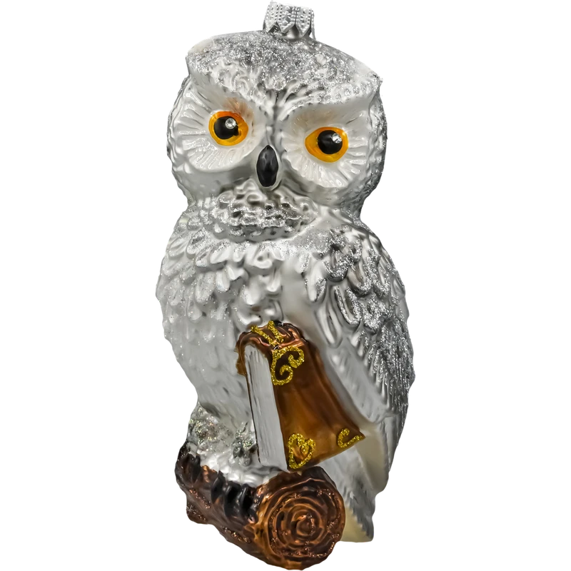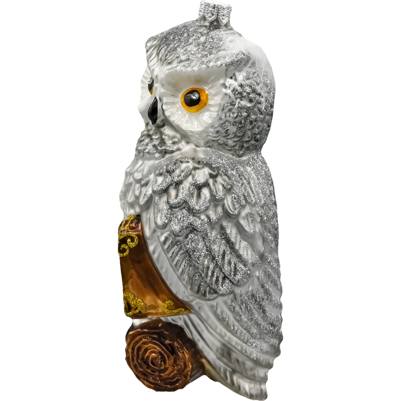 Szklana bombka w kształcie sowy to niezwykle oryginalna i efektowna ozdoba choinkowa, która zachwyca kunsztem wykonania i bogactwem detali. Ta ręcznie malowana figurka przedstawia majestatyczną białą sowę z intensywnie błyszczącymi oczami w kolorze bursztynu, siedzącą na książce spoczywającej na drewnianym konarze. Brokatowe akcenty, misternie oddane pióra oraz prawdziwe, delikatne piórka przy uszach nadają bombce trójwymiarowego uroku i lekkości.