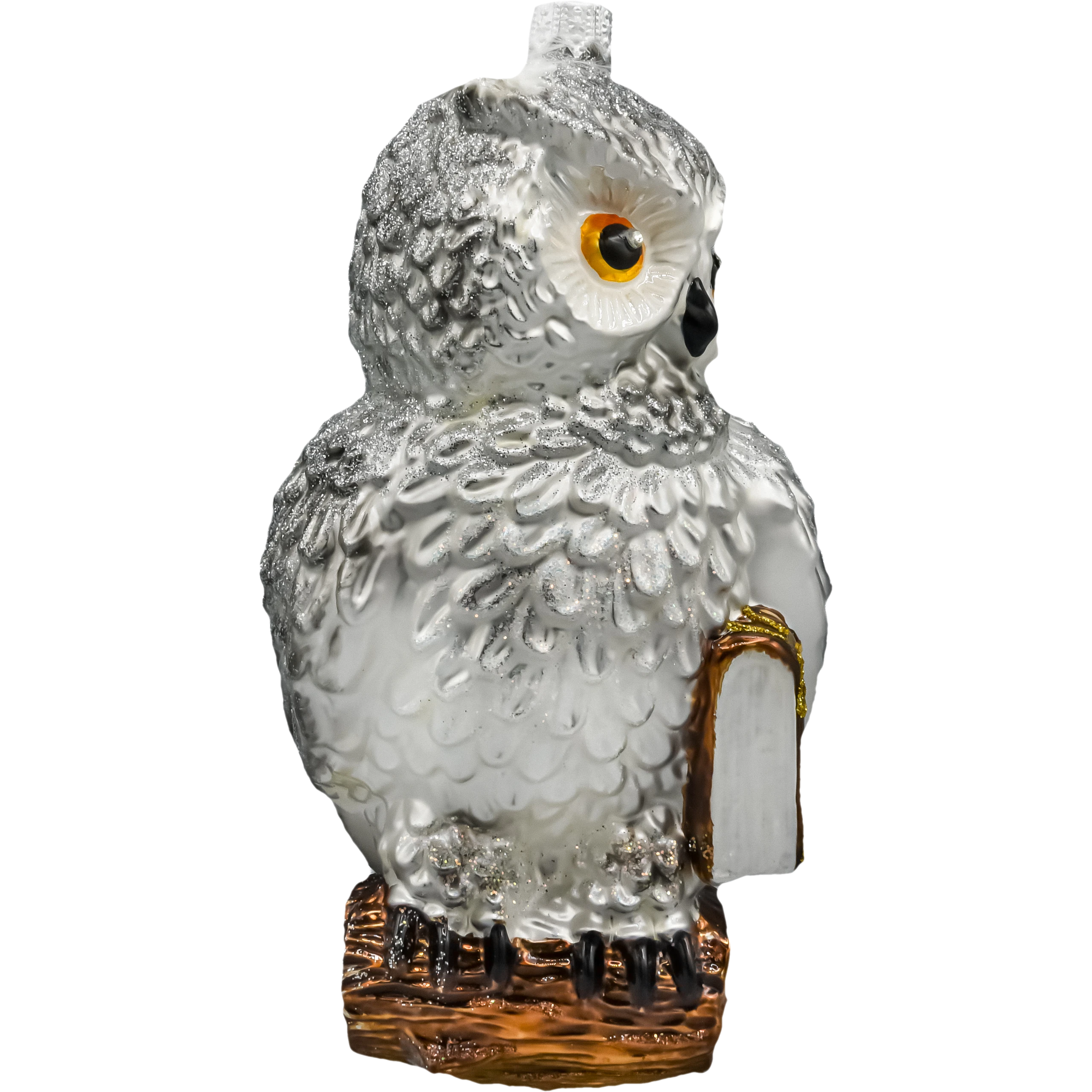 Szklana bombka sowa z książką i piórami – ręcznie malowana ozdoba choinkowa z brokatem. Wyjątkowa dekoracja świąteczna dla miłośników zwierząt i baśniowych akcentów.