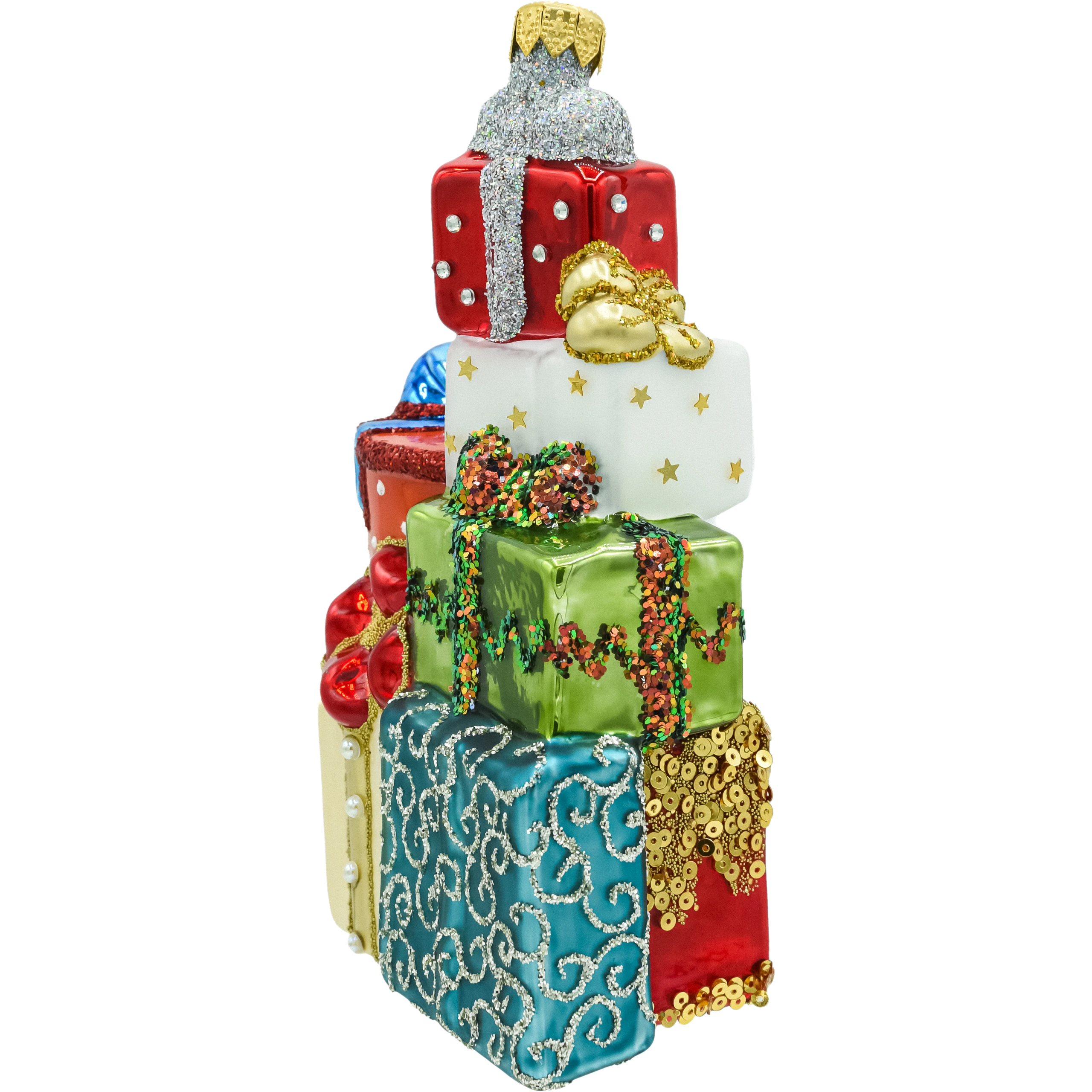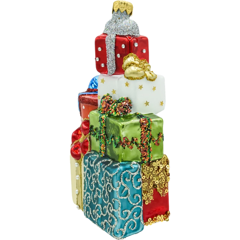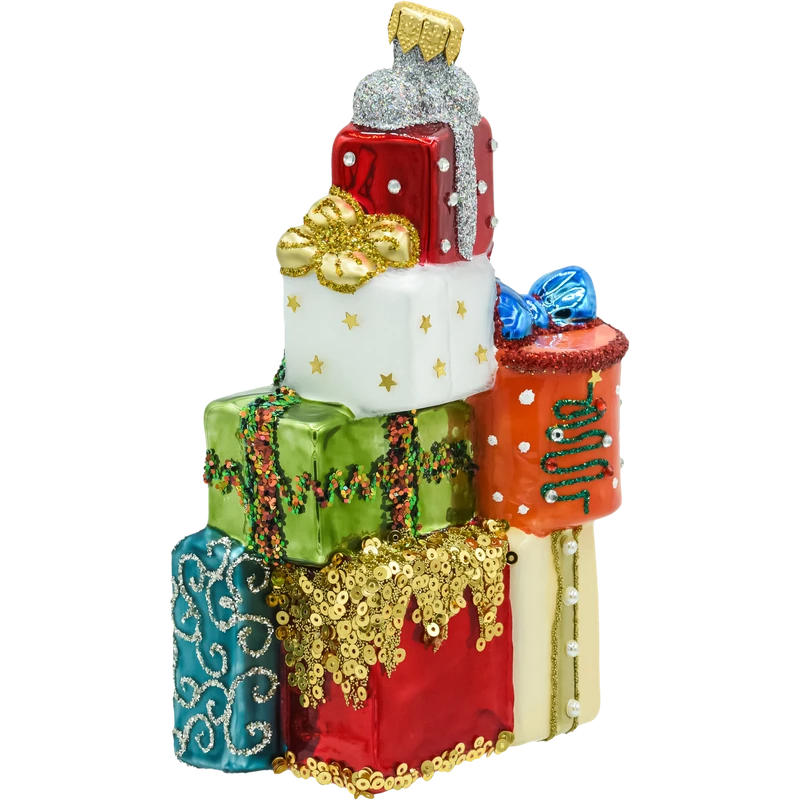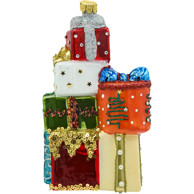 Ręcznie dmuchana i malowana bombka szklana „Stos prezentów” – wielobarwna kompozycja pudełek z kokardami, zdobiona złotym brokatem, cekinami i perełkami. Efektowna ozdoba choinkowa w świątecznej kolorystyce czerwieni, zieleni i złota – idealna do aranżacji glamour i na prezent.