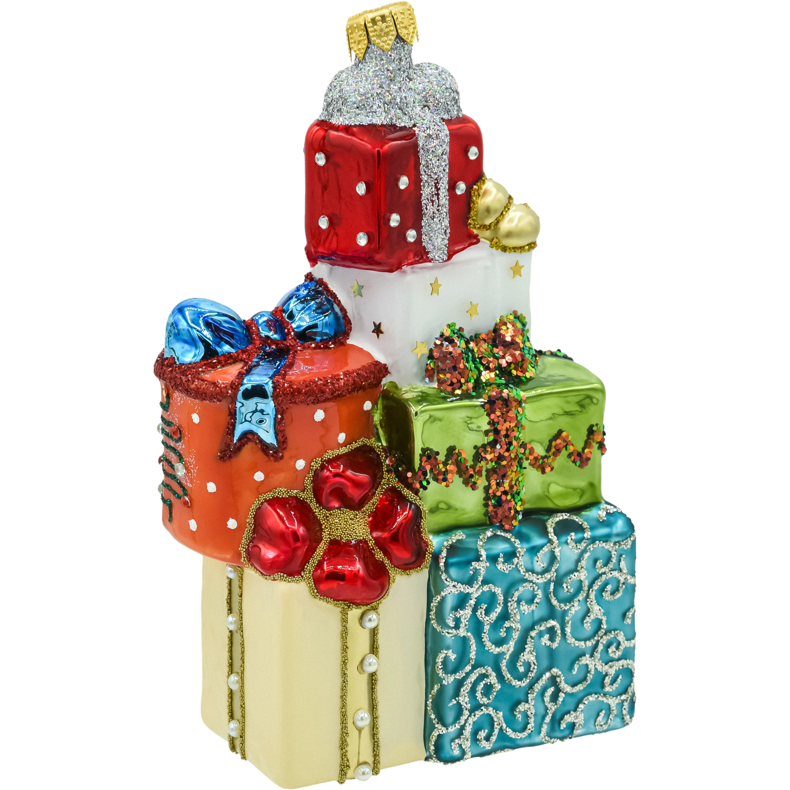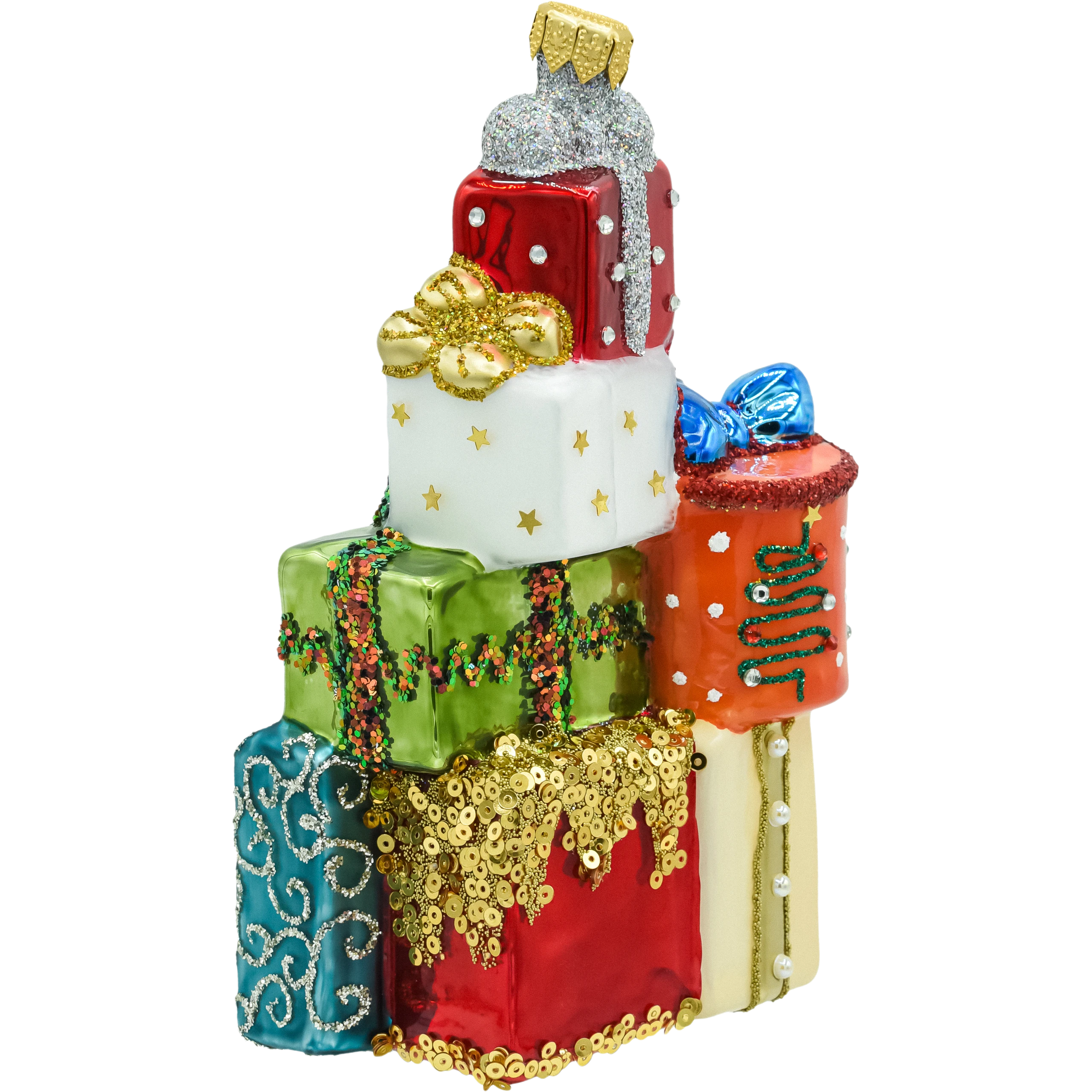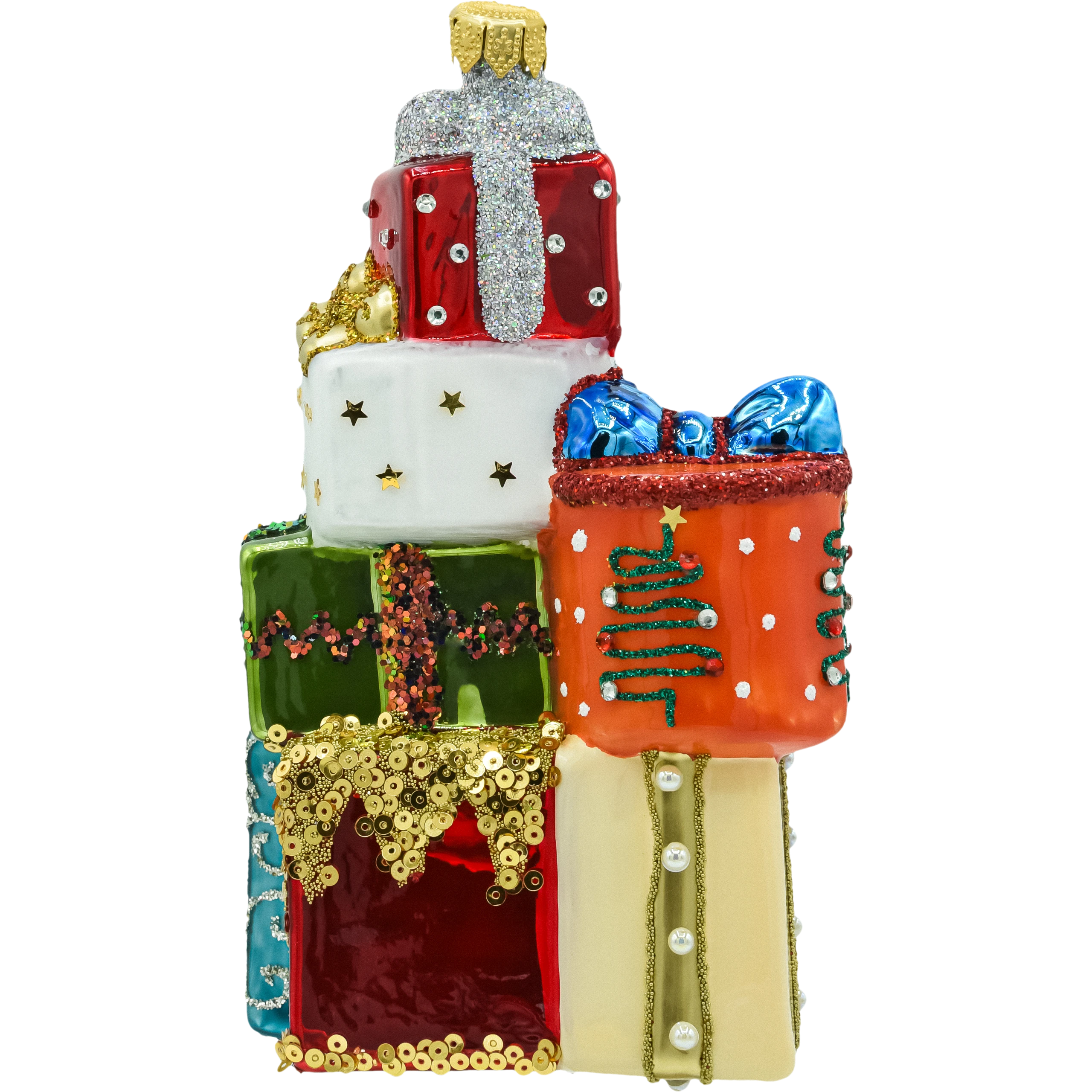Ręcznie dmuchana i malowana bombka szklana „Stos prezentów” – wielobarwna kompozycja pudełek z kokardami, zdobiona złotym brokatem, cekinami i perełkami. Efektowna ozdoba choinkowa w świątecznej kolorystyce czerwieni, zieleni i złota – idealna do aranżacji glamour i na prezent.