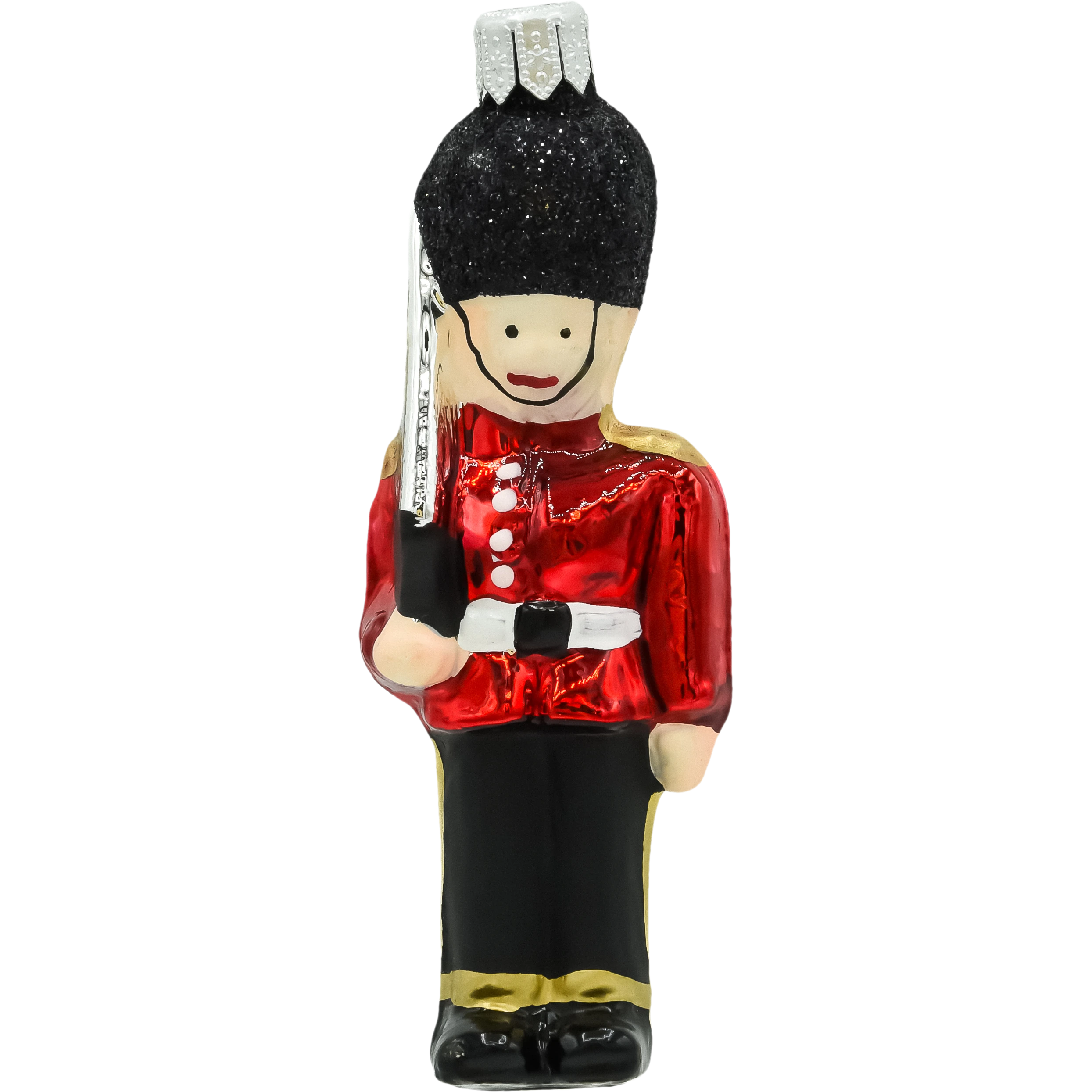 Szklana bombka choinkowa „Strażnik Królowej” to ręcznie malowana ozdoba inspirowana charakterystycznymi członkami Gwardii Królewskiej, strzegącymi Pałacu Buckingham w Londynie. Figurka została wykonana z najwyższej jakości szkła i przedstawia strażnika ubranego w tradycyjny czerwony mundur z czarnymi spodniami, złotymi lampasami oraz charakterystycznym futrzanym czarnym czako ozdobionym brokatem. W jednej ręce żołnierz trzyma błyszczący karabin z detalami oddającymi realistyczny wygląd broni ceremonialnej.