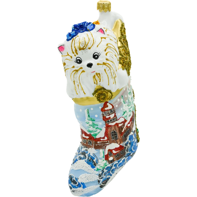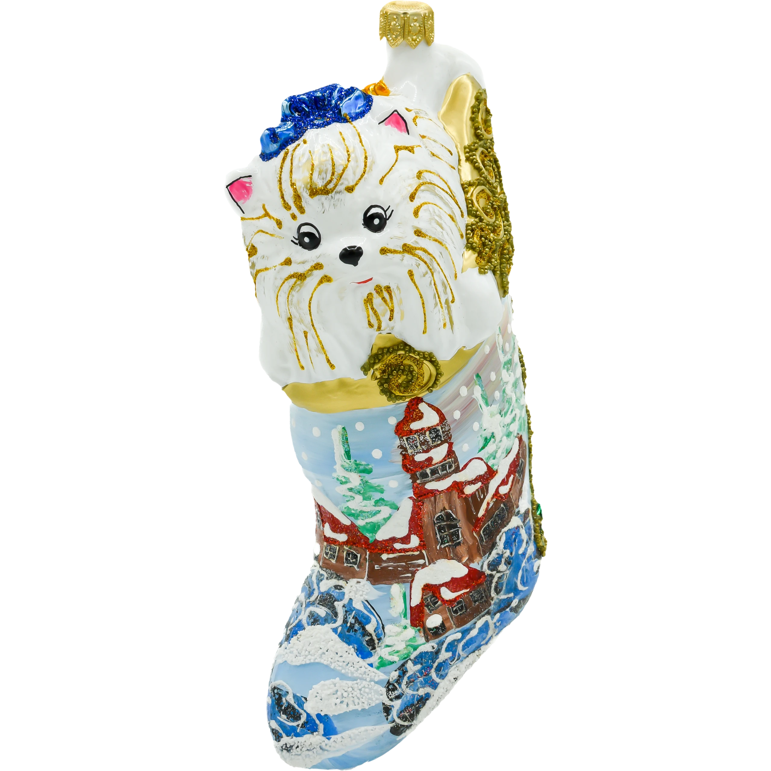 Wyjątkową ozdobą bombki jest uroczy biały piesek, który wygląda, jakby radośnie wystawał z buta.