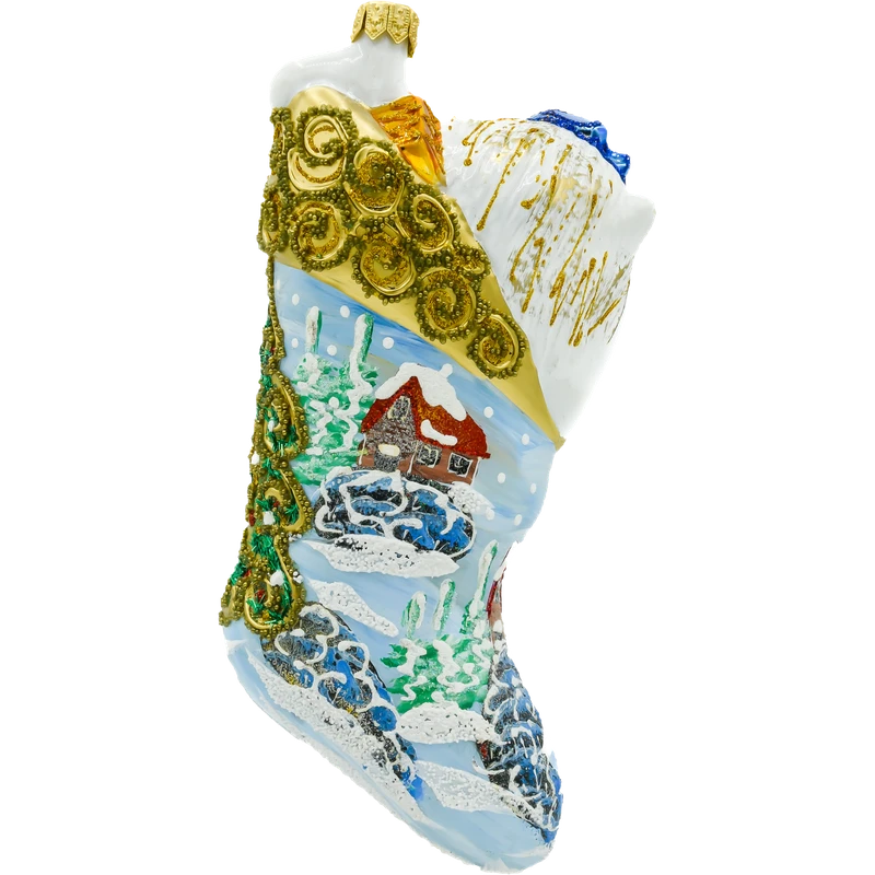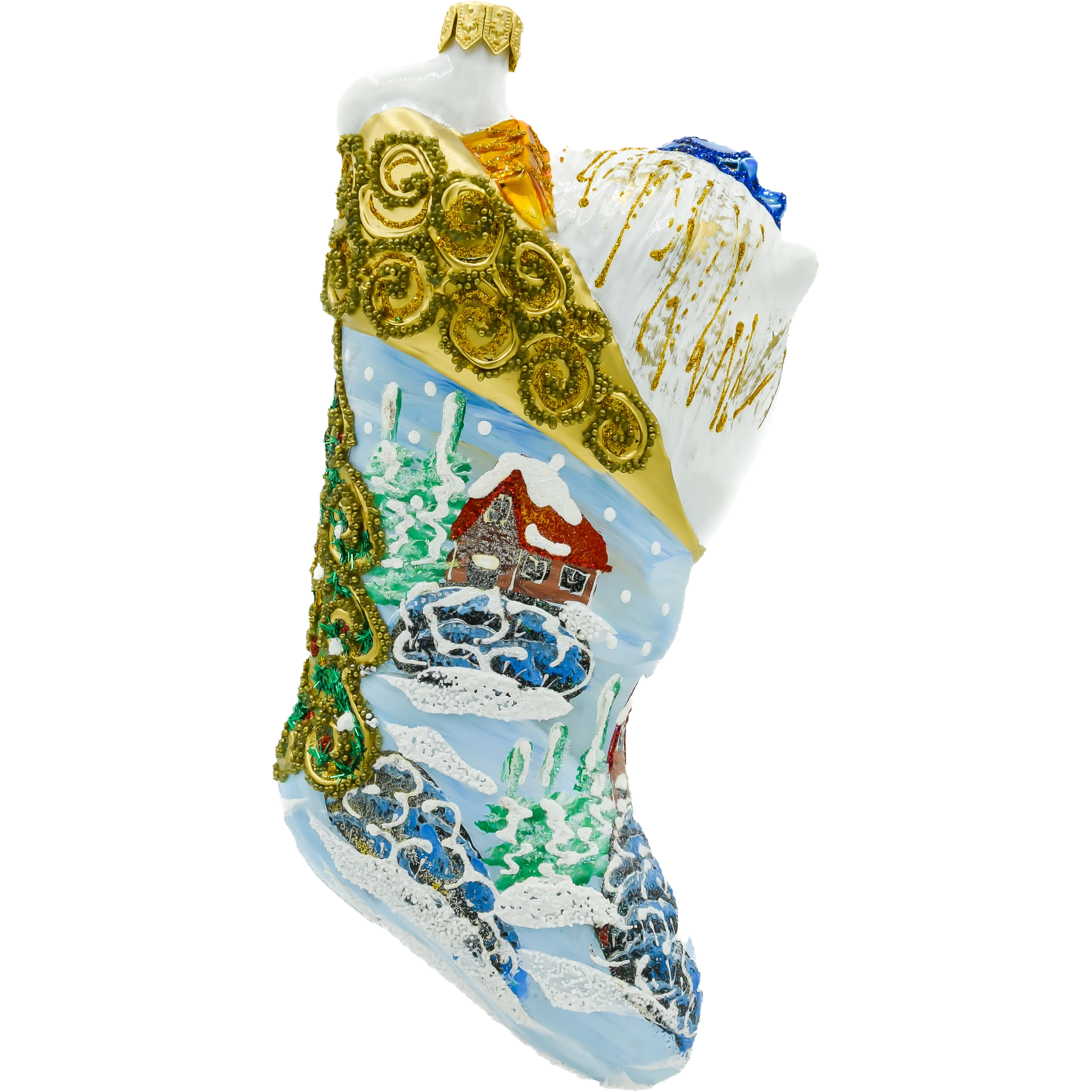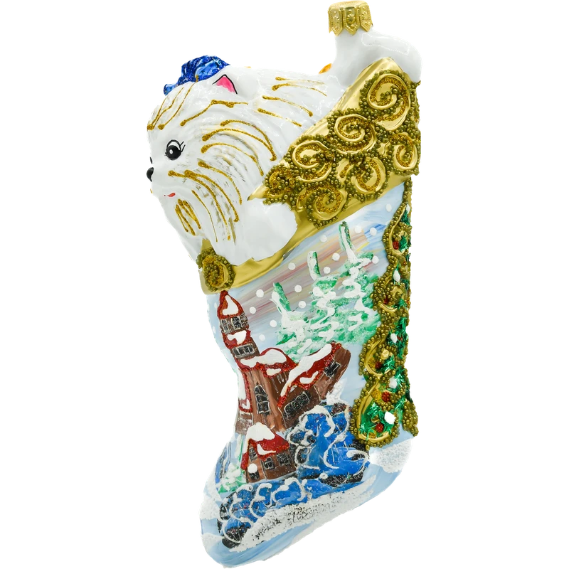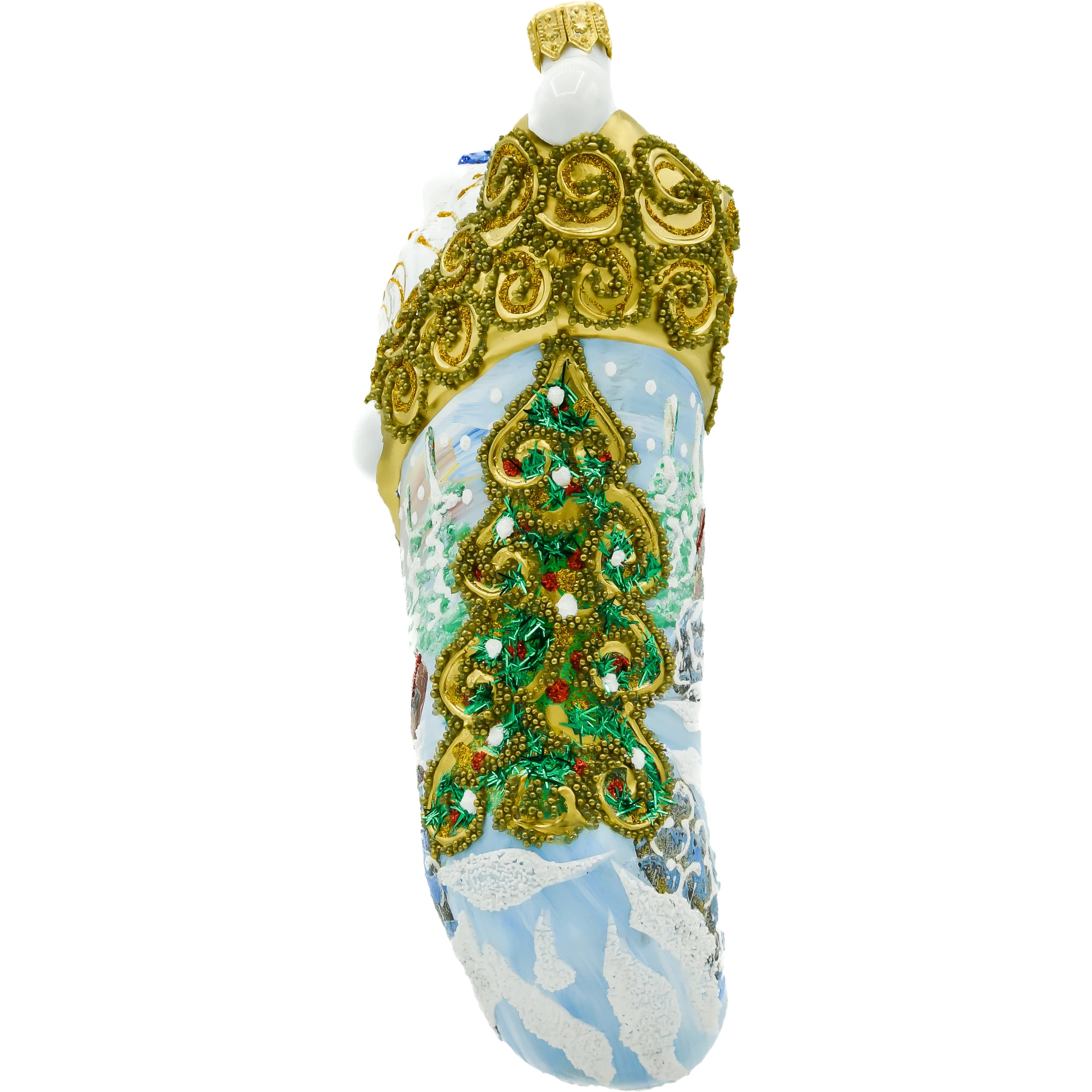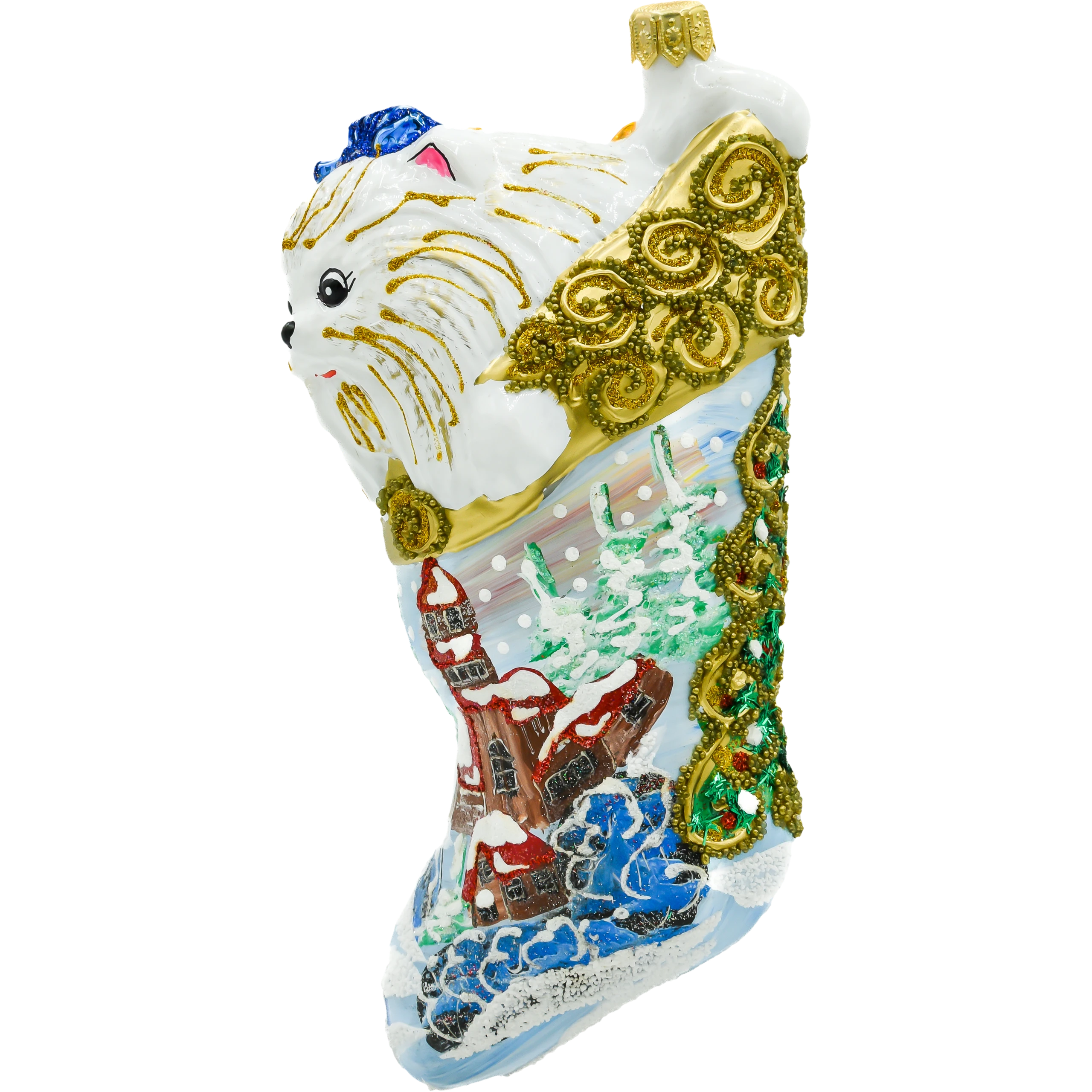 Szklana bombka „Świąteczna skarpeta z pieskiem” to prawdziwe arcydzieło ręcznego rzemiosła. Dzięki swojemu unikalnemu wzornictwu, luksusowym zdobieniom i świątecznemu charakterowi wnosi do wnętrza wyjątkową atmosferę. Jest to idealna ozdoba dla osób, które chcą, by ich choinka zachwycała elegancją i niepowtarzalnością. Spraw, by te Święta były magiczne – wybierz bombkę „But z pieskiem”!