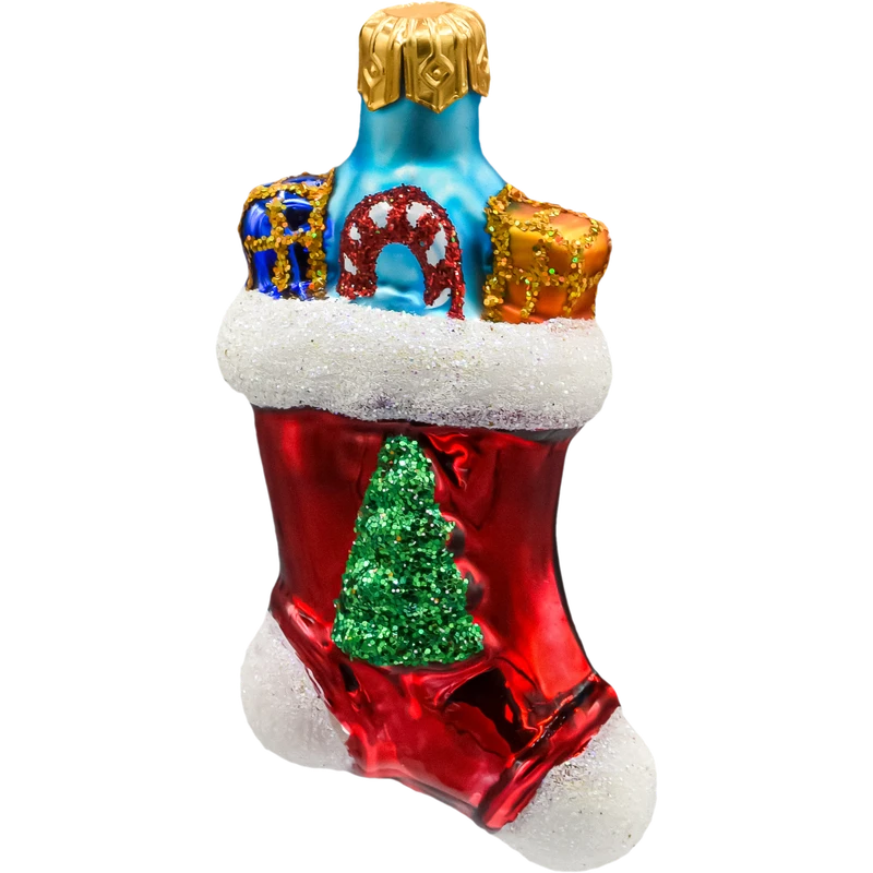 Wprowadź radosny klimat Świąt Bożego Narodzenia do swojego domu dzięki tej wyjątkowej bombce choinkowej w kształcie świątecznej skarpety wypełnionej prezentami. To ręcznie malowana, szklana bombka figurka, która zachwyca nasyconymi barwami, precyzją wykonania i świątecznym urokiem. Skarpeta w intensywnie czerwonym kolorze udekorowana została brokatową choinką, a jej wnętrze wypełniają prezenty w błękitach, złocie i czerwieni – w tym kultowy cukrowy lizak i klasyczne pakunki przewiązane wstążkami.