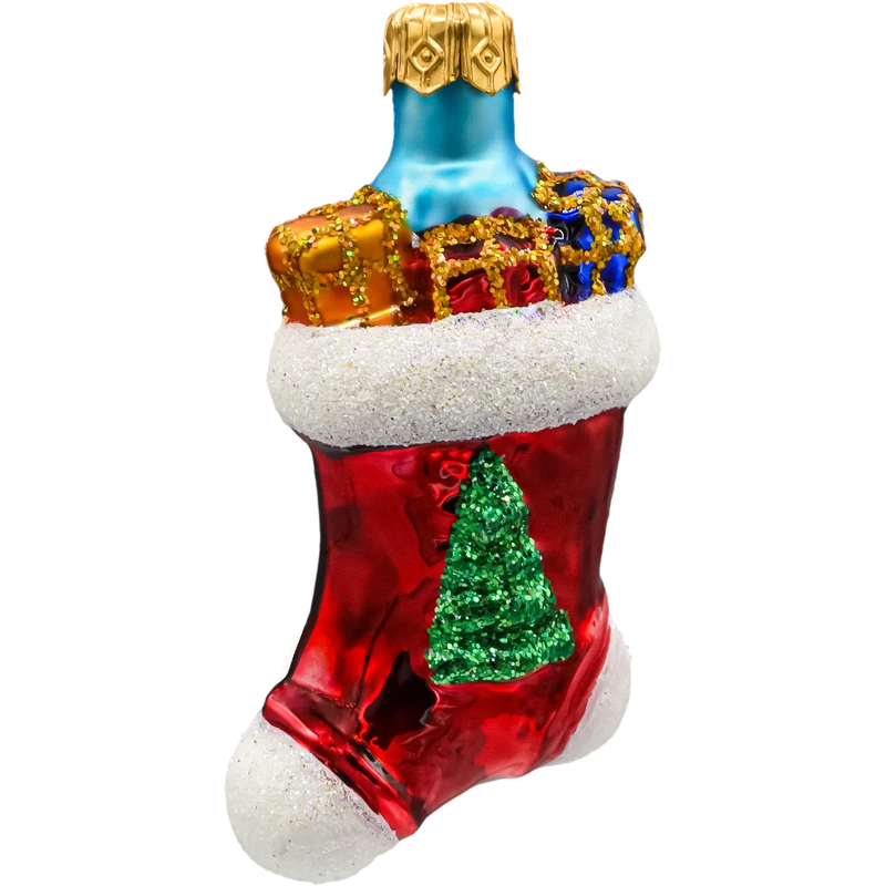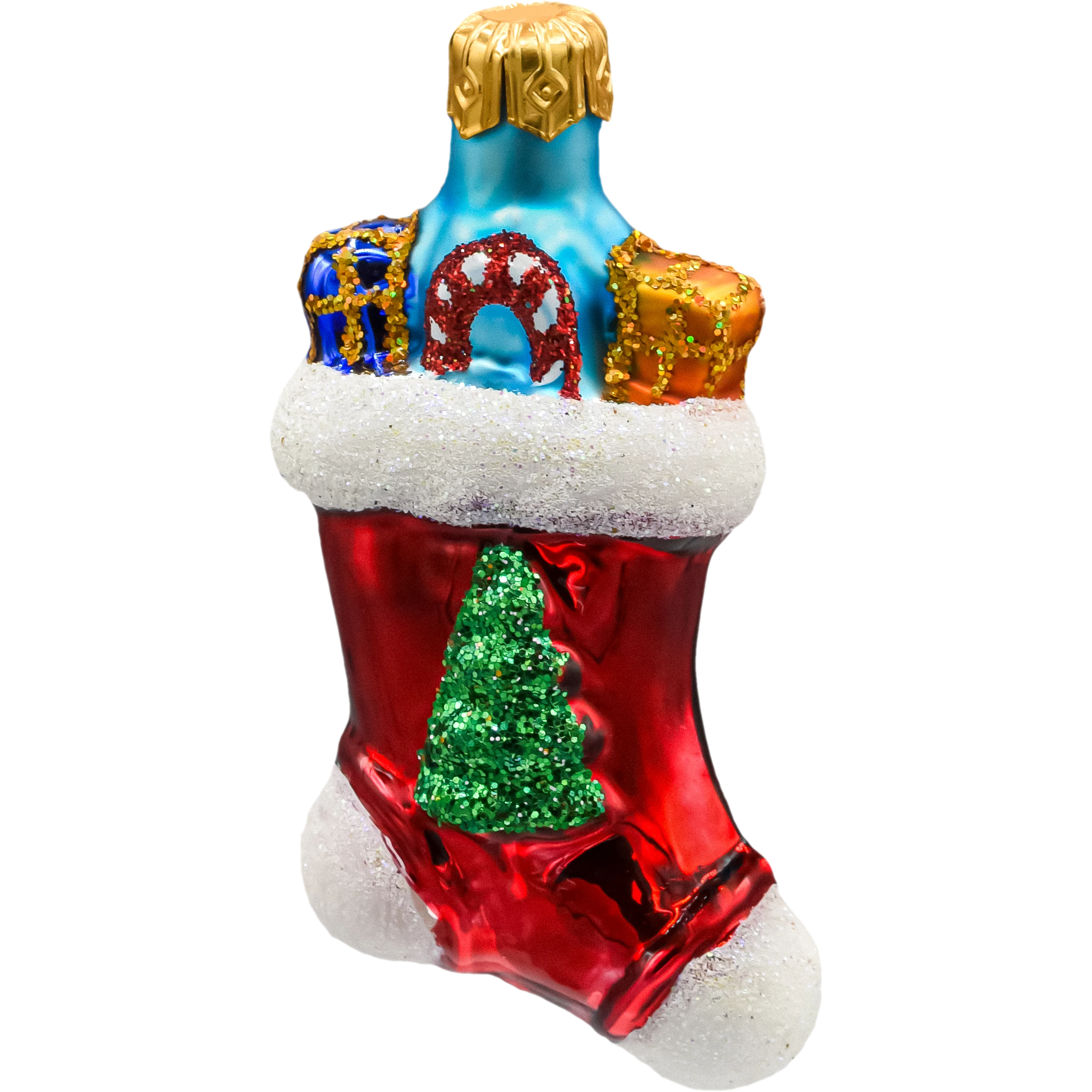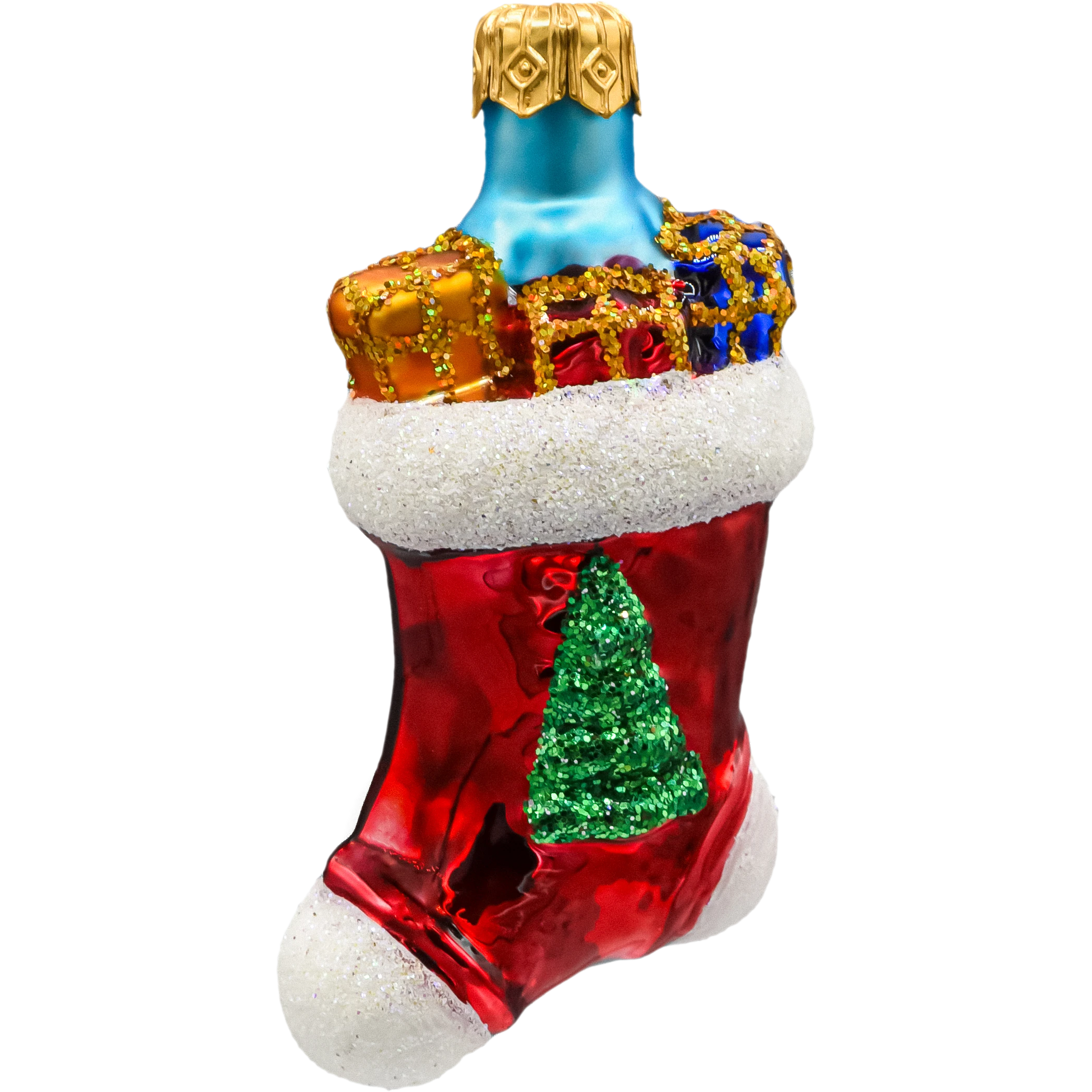 Szklana bombka choinkowa w kształcie świątecznej skarpety z prezentami i choinką. Ręcznie malowana bombka figurka ze szkła dmuchanego – klasyczna, błyszcząca ozdoba bożonarodzeniowa w stylu retro i glamour. Idealna na choinkę, do kolekcji lub na prezent.