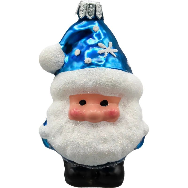 Postać Mikołaja skrzata przykuwa uwagę wyrazistą, dziecięcą buzią z rumieńcami oraz gęstą, białą brodą wykonaną z iskrzącego brokatu. Jego szpiczasta czapka w intensywnym błękicie ozdobiona jest brokatowymi płatkami śniegu, które nadają bombce świąteczny, bajkowy charakter. Całość uzupełniają czarne buciki oraz srebrna koronka u góry, umożliwiająca zawieszenie ozdoby na choince.