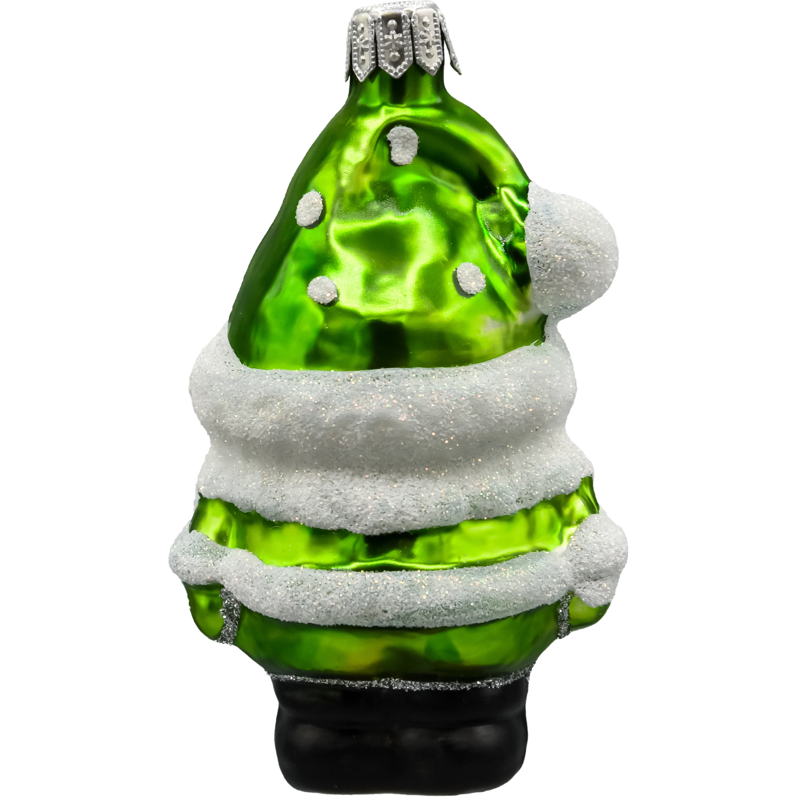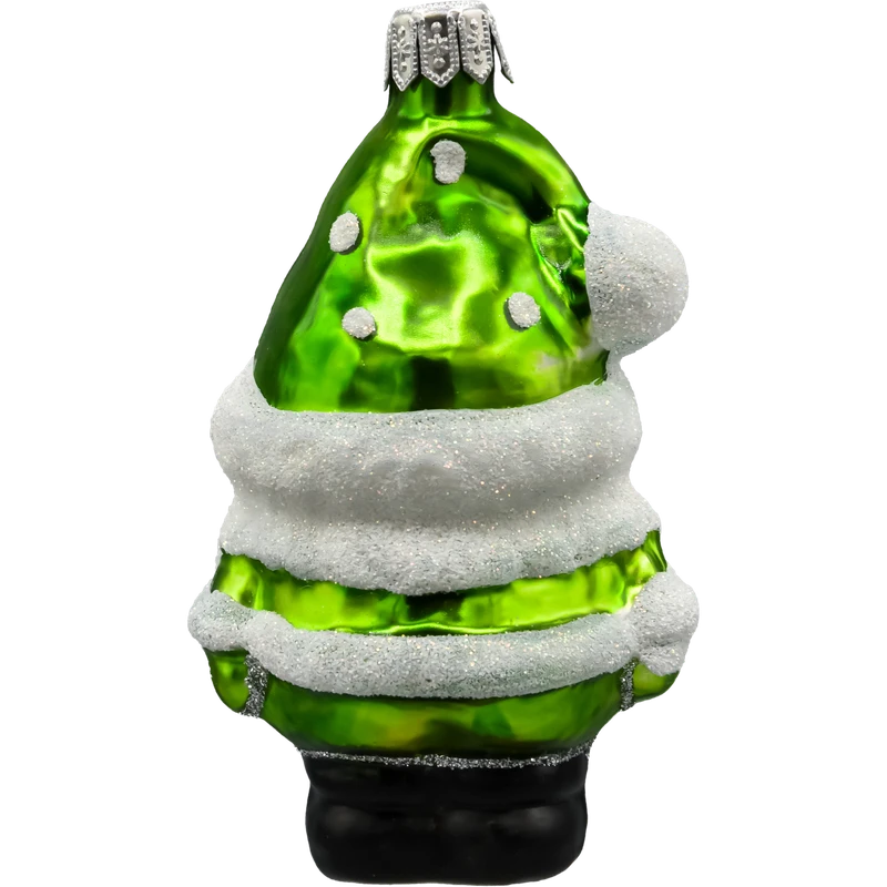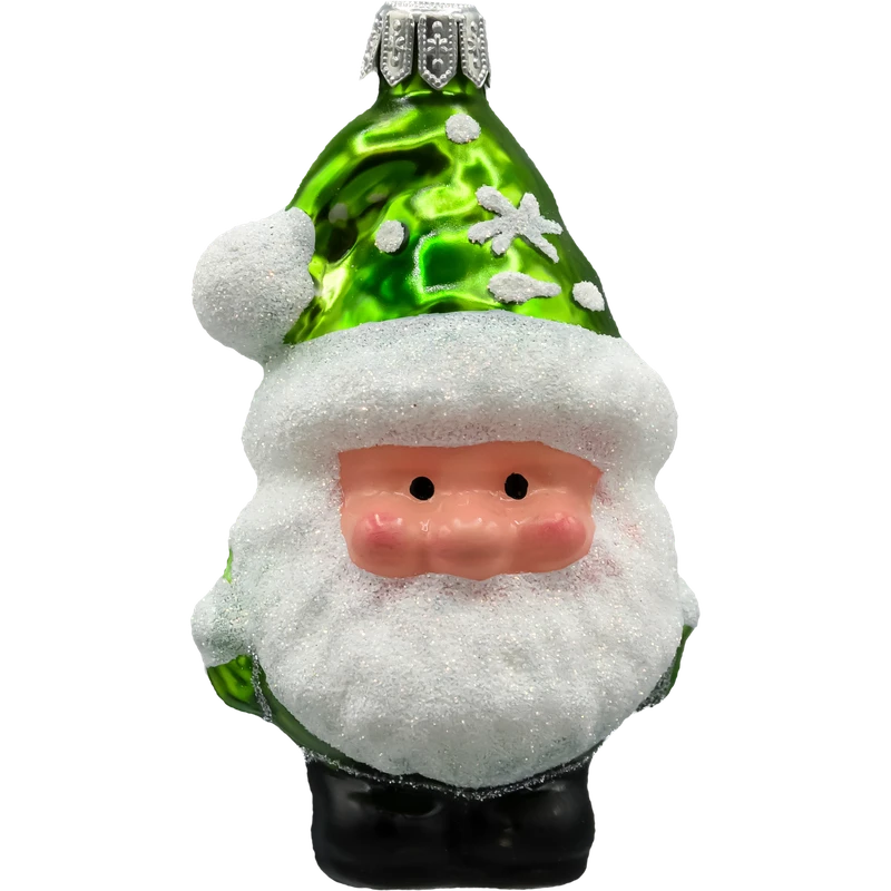 Ręcznie malowana szklana bombka Świąteczny Skrzat Mikołaj w zielonym stroju – wyjątkowa ozdoba choinkowa z brokatem. Dmuchane szkło, produkt polski. Idealny prezent świąteczny!