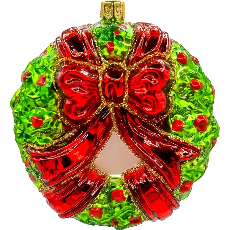 Bombka „Świąteczny wieniec z czerwoną kokardą” to klasyczna ozdoba choinkowa, która wprowadza do domu wyjątkową atmosferę świąt Bożego Narodzenia. Ręcznie wykonana z najwyższej jakości szkła, ta bombka zachwyca bogactwem szczegółów i intensywną kolorystyką. Zielony wieniec zdobiony czerwonymi jagodami i otulony lśniącą kokardą tworzy harmonijną kompozycję, która doskonale wpisuje się w tradycyjne dekoracje świąteczne.