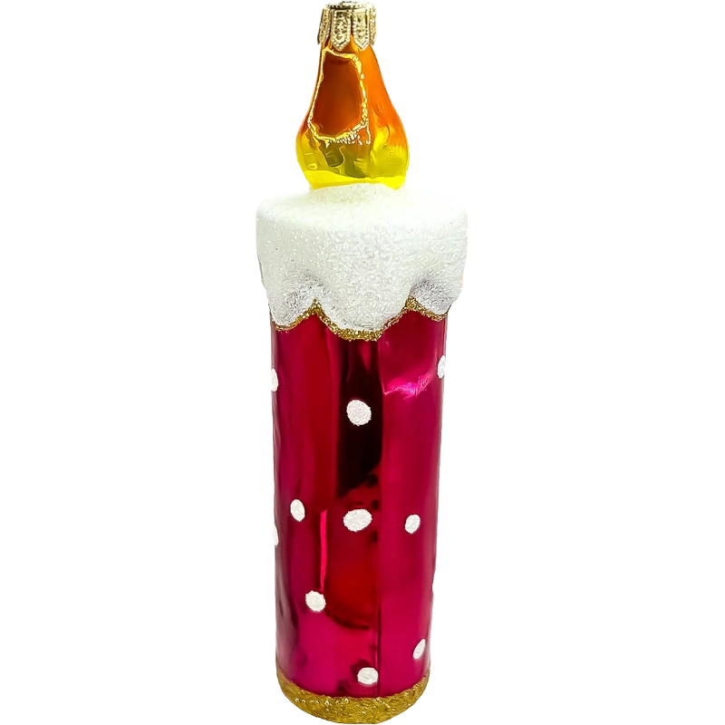 Bombka w formie świecy wyróżnia się eleganckim i realistycznym wykonaniem. Głęboka czerwień korpusu ozdoby podkreślona białym, brokatowym śniegiem, wprowadza klimat zimowej przytulności. Na szczycie bombki widnieje kunsztownie odwzorowany płomień w ciepłych odcieniach żółci i pomarańczy, co nadaje jej wyjątkowego charakteru.