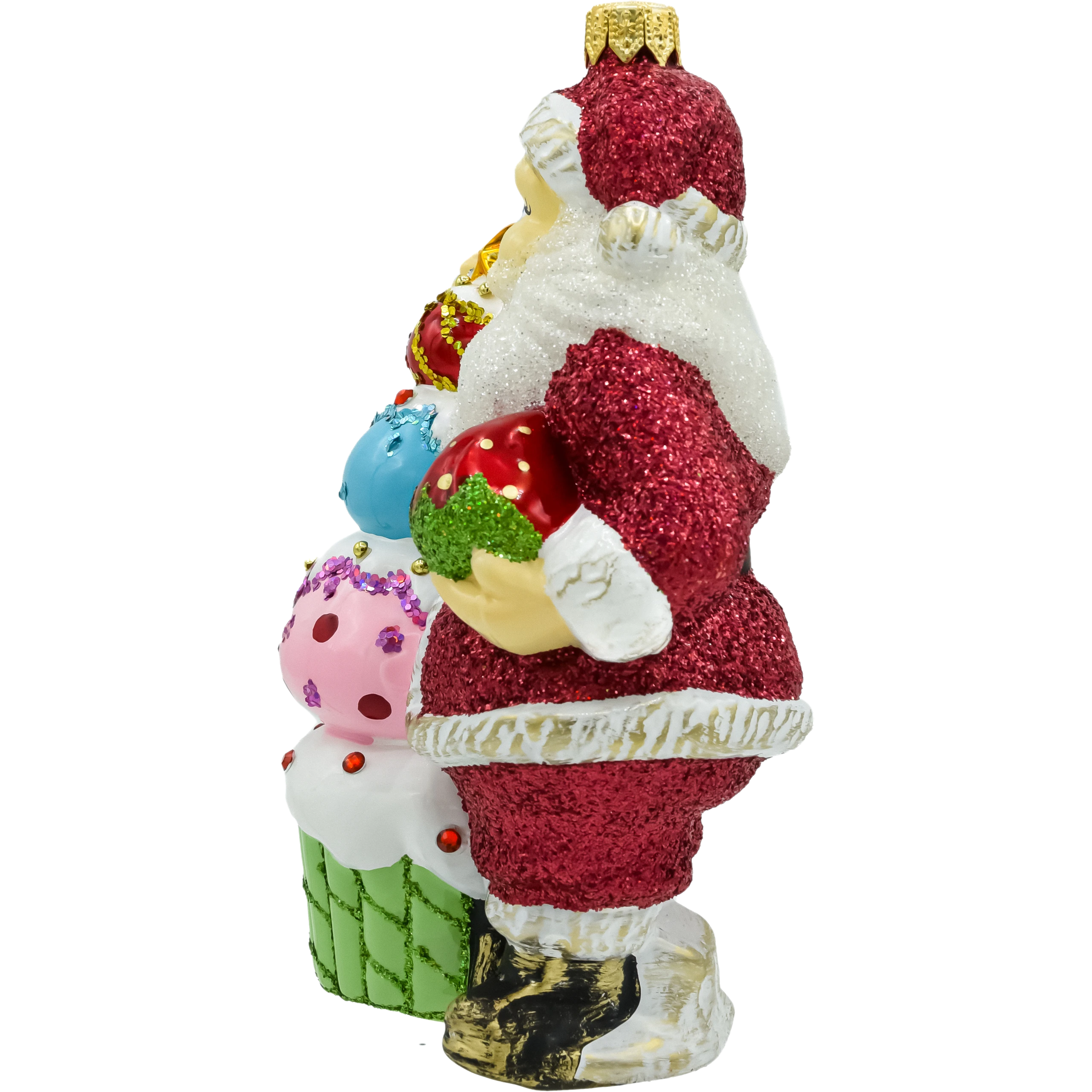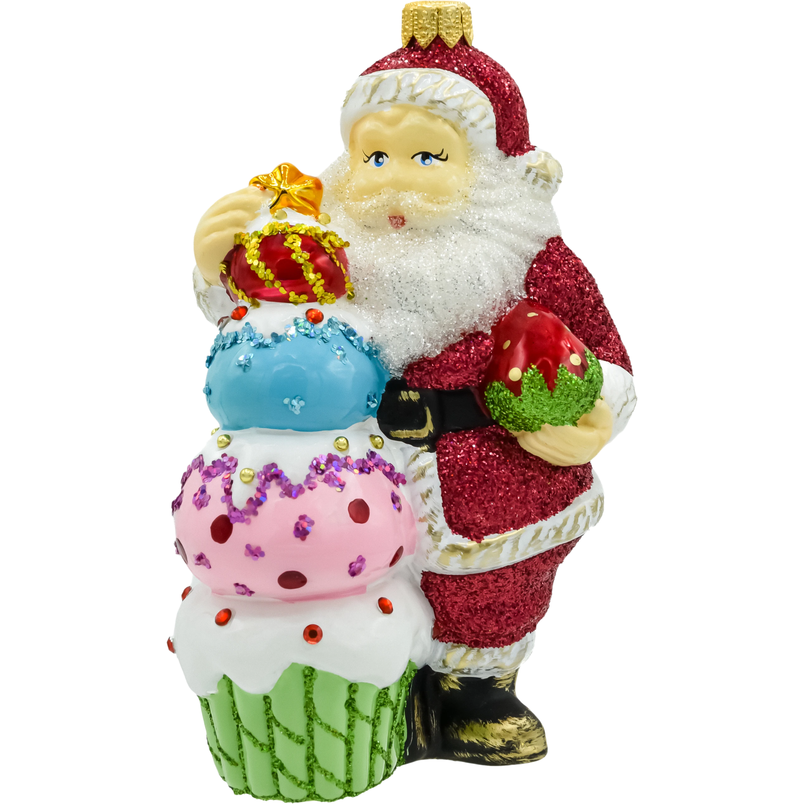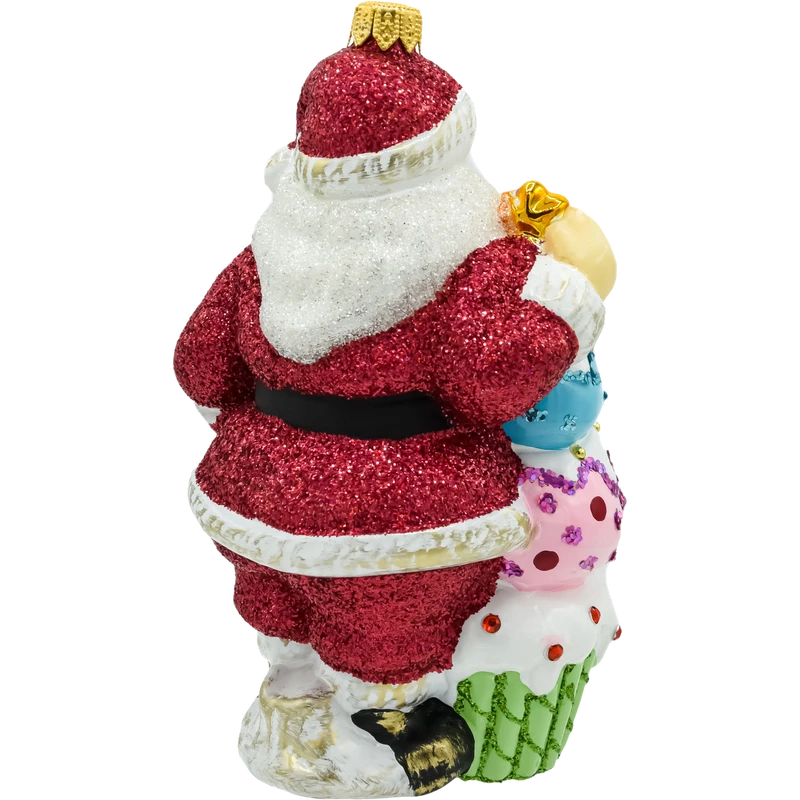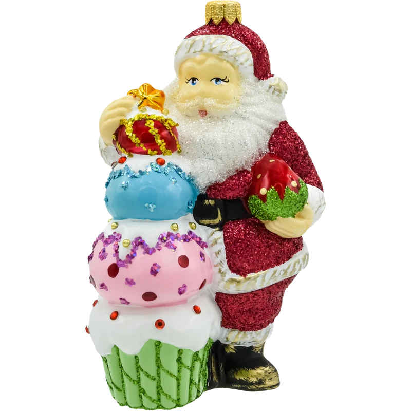 W tej wyjątkowej bombce szklanej Święty Mikołaj przybiera rolę cukiernika – z radością prezentuje kolorową piramidę bajecznych babeczek udekorowanych brokatem, koralikami i połyskującymi zdobieniami. Ta ręcznie wykonana dekoracja wprowadza na choinkę nie tylko świąteczny klimat, ale i odrobinę zabawnego uroku rodem z cukierni.