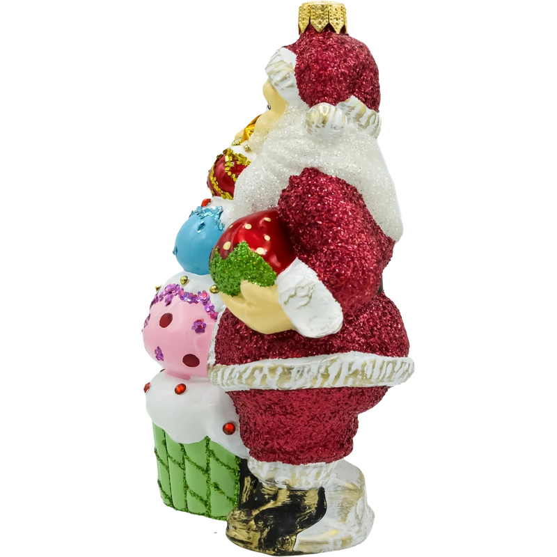 Mikołaj ubrany jest w klasyczny czerwony strój pokryty błyszczącym brokatem, a w jednej dłoni trzyma dorodną truskawkę – jakby właśnie szykował deser dla dzieci. Bombka zachwyca soczystymi kolorami: malinowym, pistacjowym, różowym, błękitnym i białym, z detalami ozdobionymi złotem i cekinami.