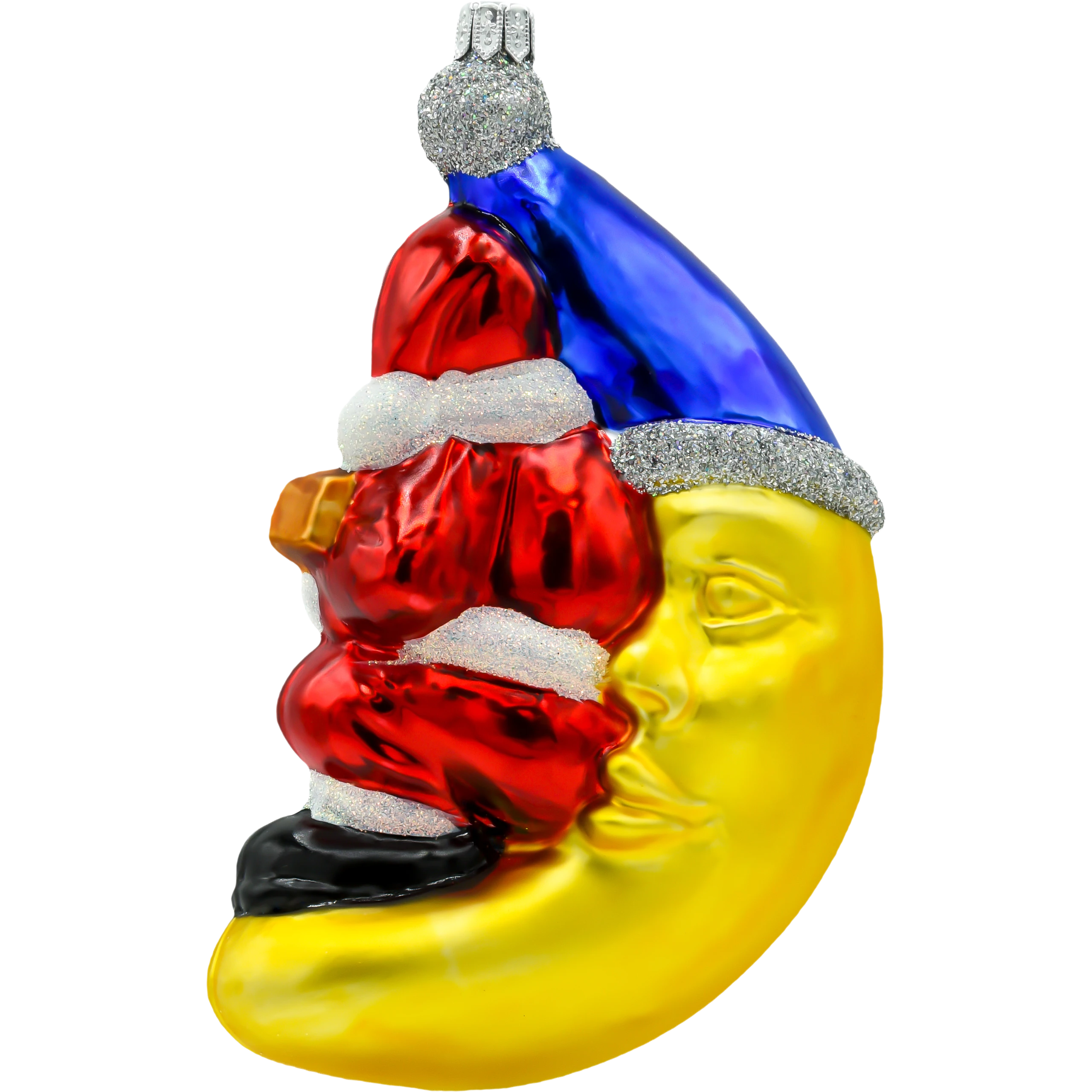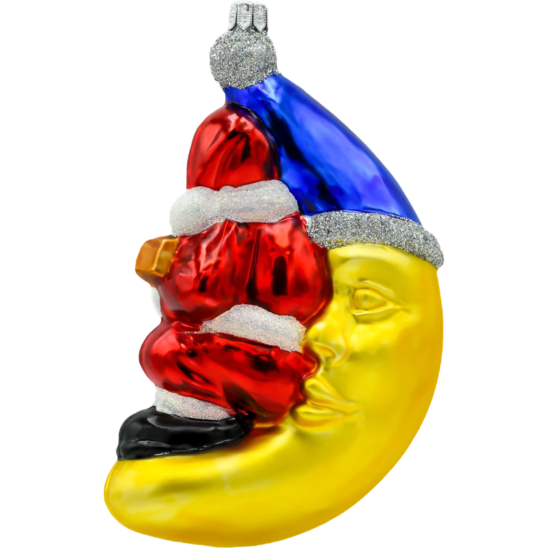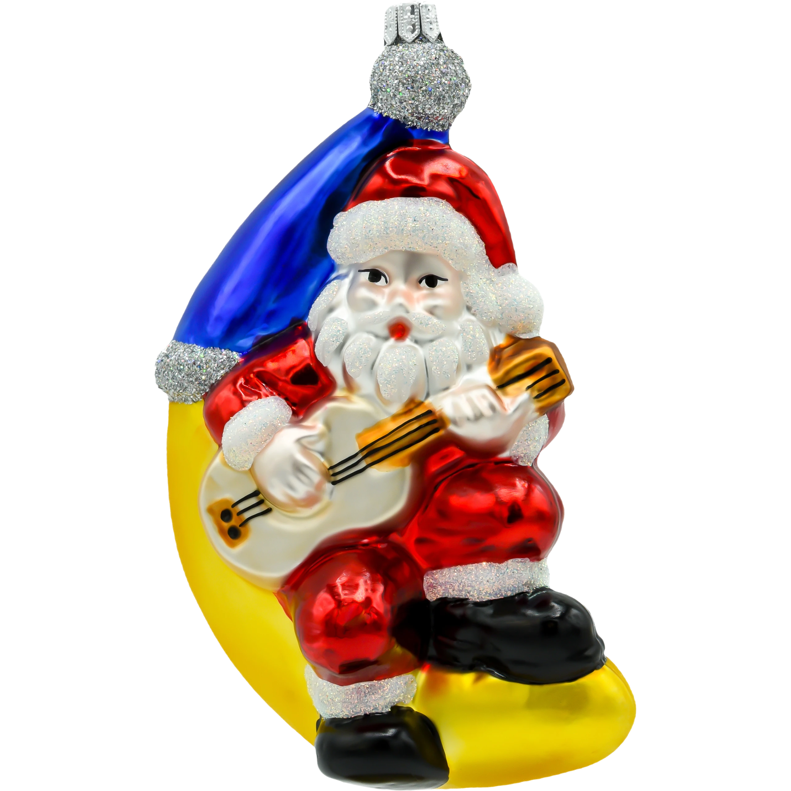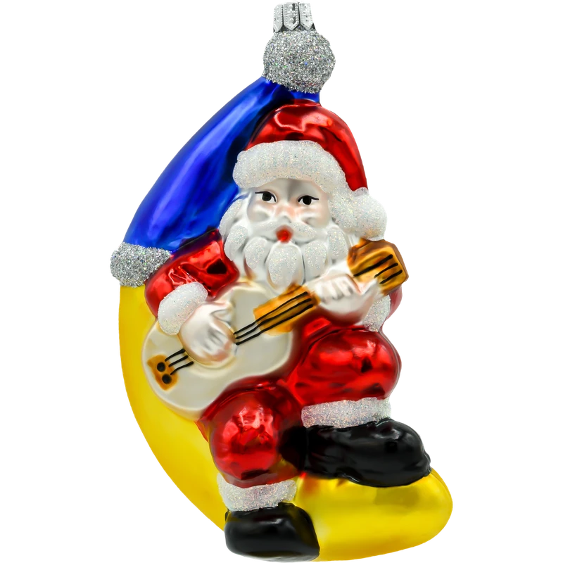 Wprowadź do swojego domu odrobinę świątecznej magii z nutą muzycznego humoru dzięki tej nietypowej bombce przedstawiającej Świętego Mikołaja siedzącego na księżycu i grającego na gitarze. Wykonana z najwyższej jakości szkła i ręcznie malowana, bombka przyciąga uwagę szczegółami – klasyczny strój Mikołaja, złoty księżyc oraz srebrzyste brokatowe akcenty tworzą unikalną kompozycję, która doda Twojej choince wyjątkowego charakteru.