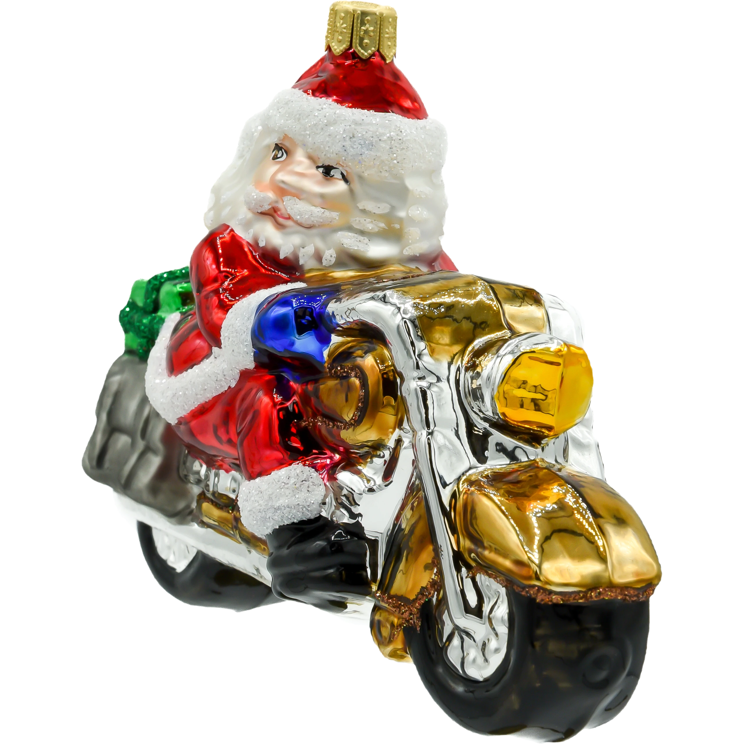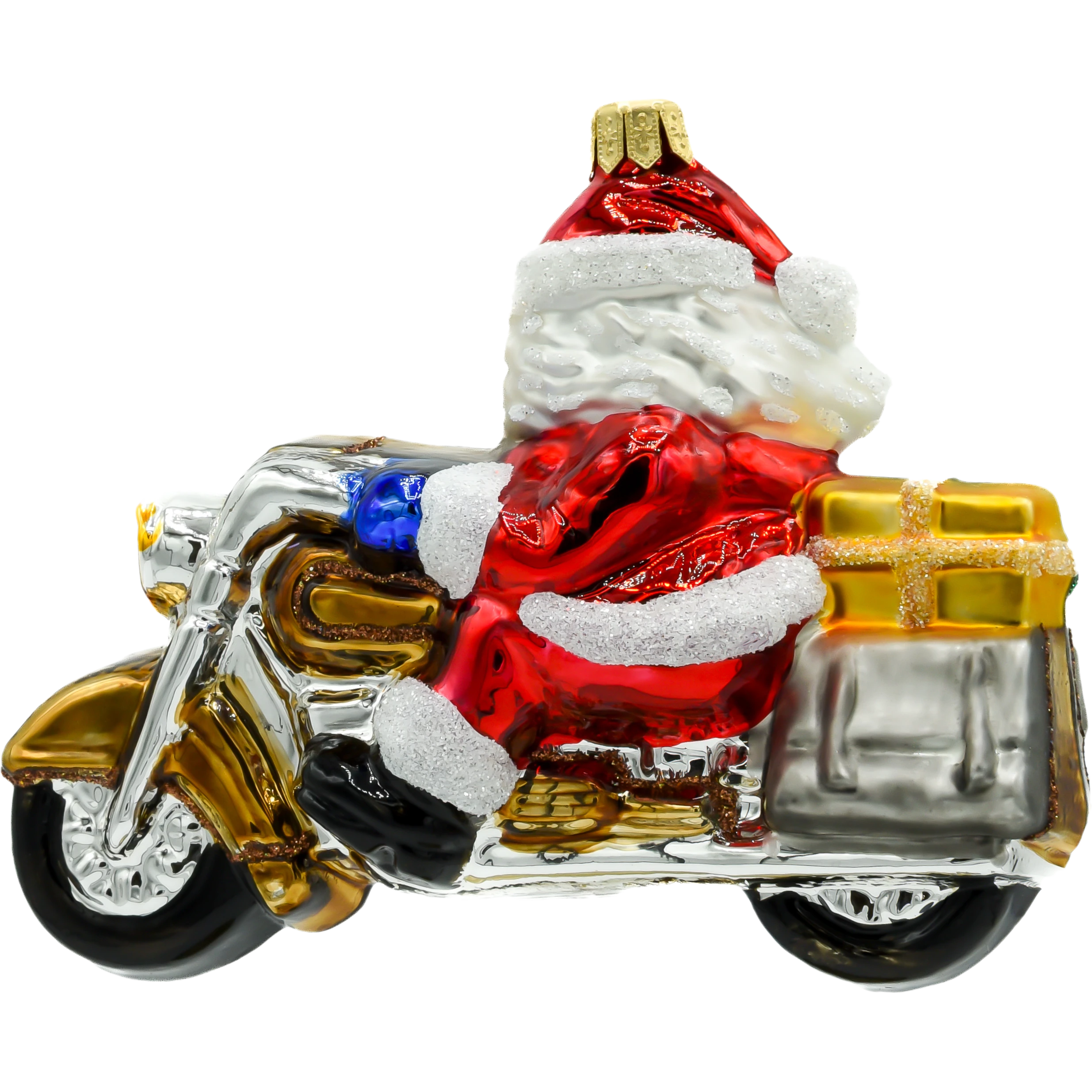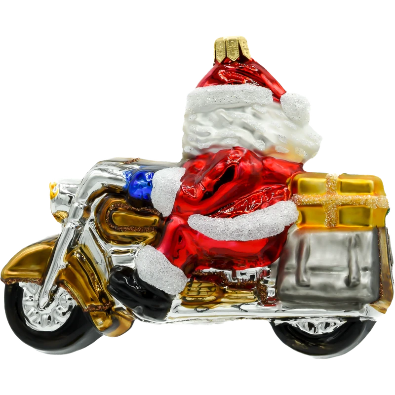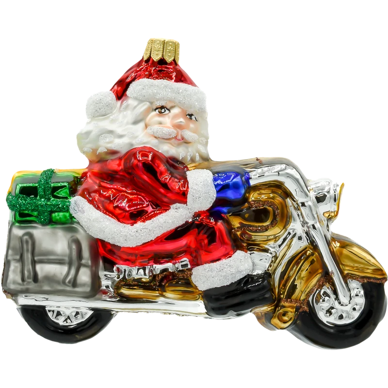 Bombka „Święty Mikołaj na motocyklu” została stworzona przez doświadczonych rzemieślników, którzy z wielką starannością odwzorowali każdy detal tej unikalnej ozdoby. Mikołaj ubrany w tradycyjny czerwony strój, ozdobiony białym brokatem, siedzi na stylizowanym, lśniącym motocyklu z detalami w odcieniach złota, srebra i czerni. Jego uśmiechnięta twarz i radosny wyraz dodają bombce ciepłego, świątecznego charakteru. Za Mikołajem znajduje się worek z prezentami, co podkreśla jego świąteczną misję. Elementy motocykla, takie jak lusterka, reflektor i wydechy, są precyzyjnie zdobione, co nadaje całości realistycznego wyglądu.