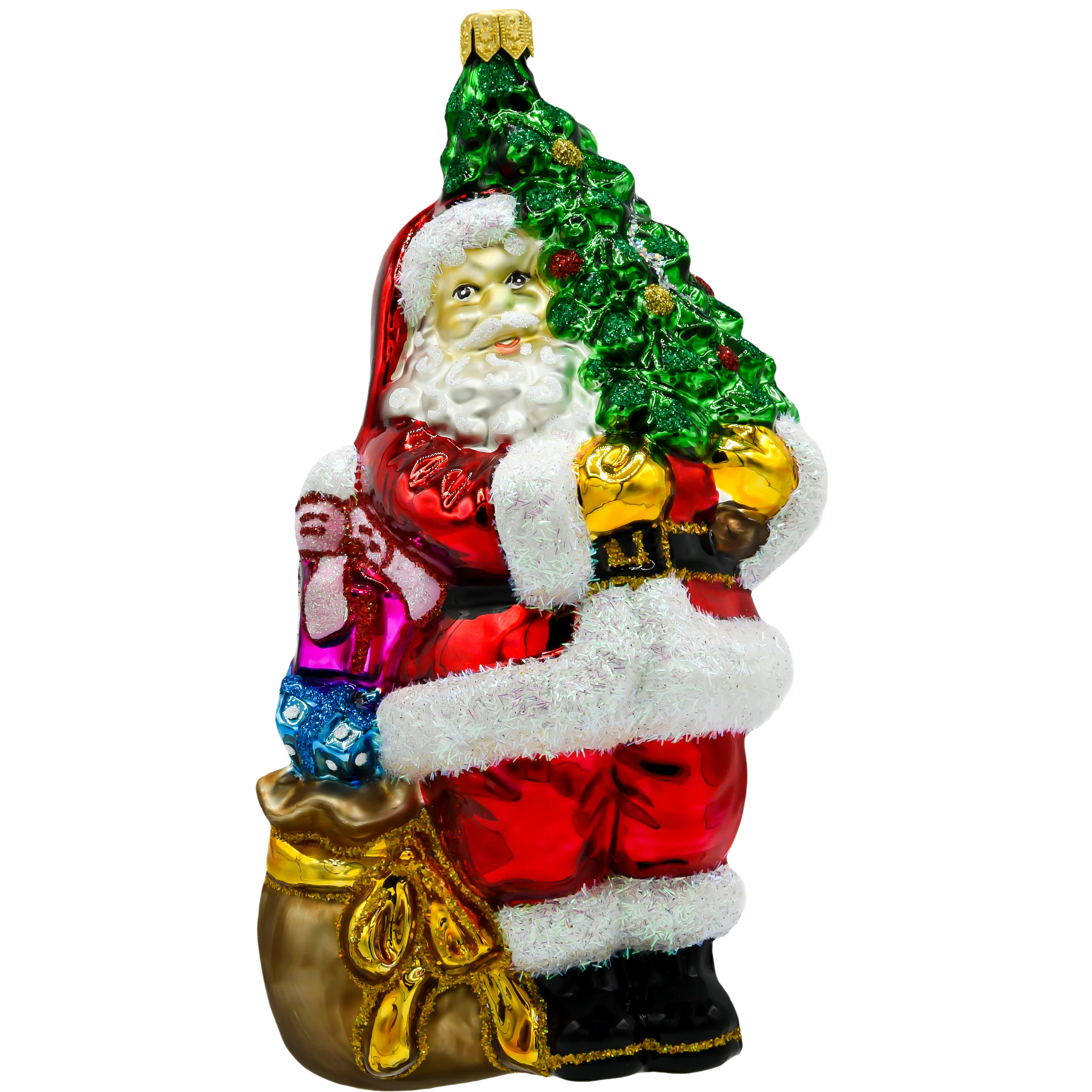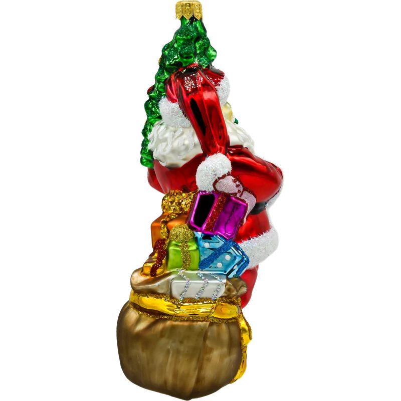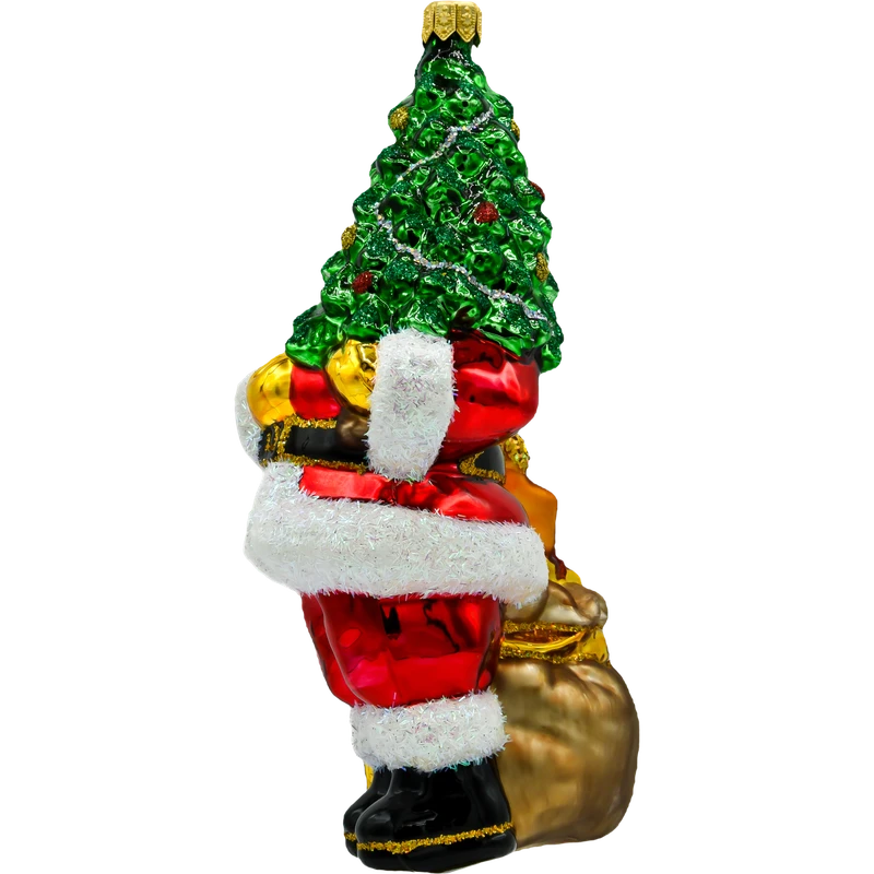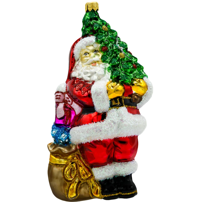 Wprowadź do swojego świątecznego wystroju odrobinę magii z ręcznie malowaną szklaną bombką „Święty Mikołaj z ciemnozieloną choinką”. Ta piękna ozdoba przedstawia klasycznego Świętego Mikołaja trzymającego bogato udekorowaną choinkę. Wyraziste kolory, takie jak czerwień stroju Mikołaja i soczysta zieleń choinki, w połączeniu z mieniącymi się detalami, sprawiają, że bombka ta staje się prawdziwą ozdobą każdej choinki.