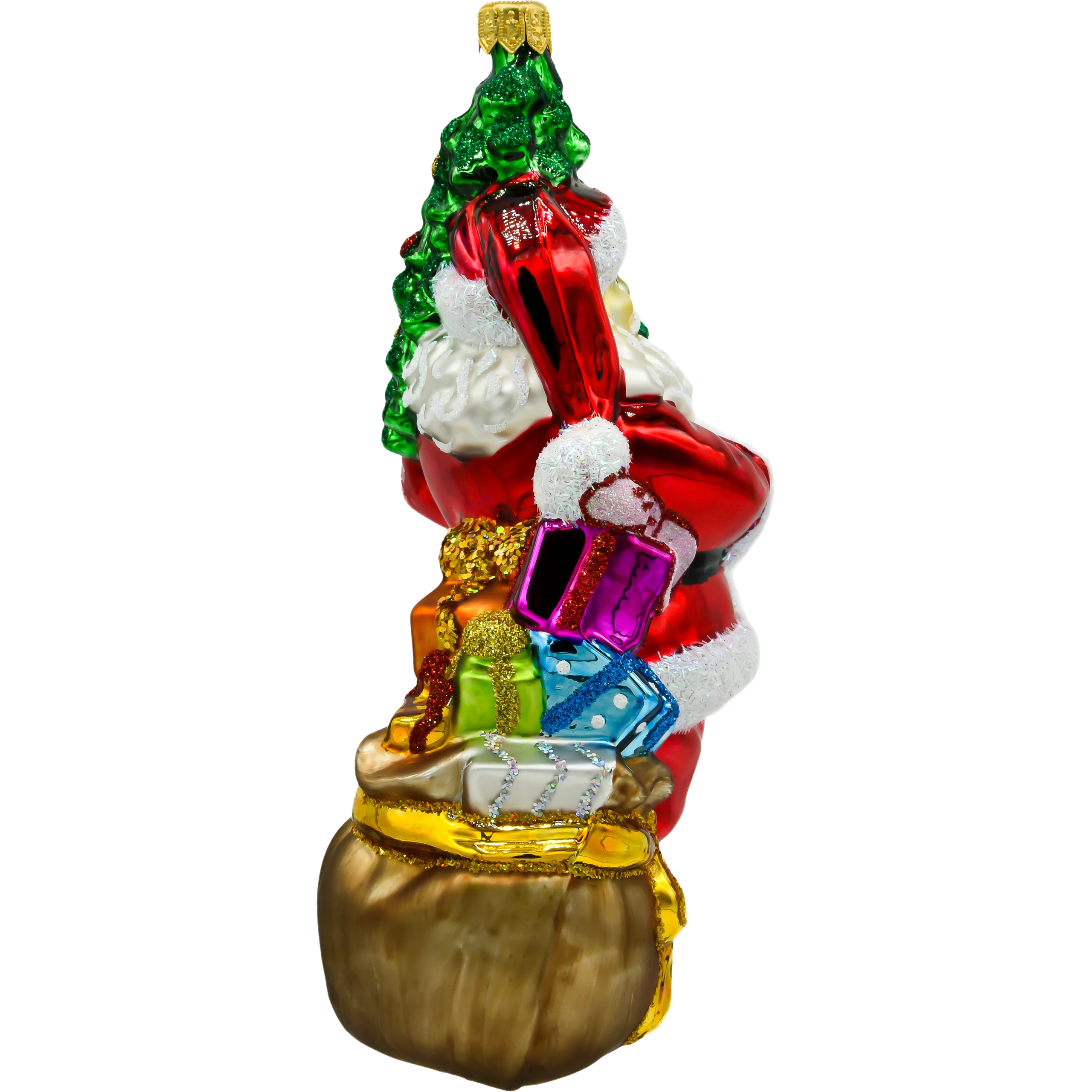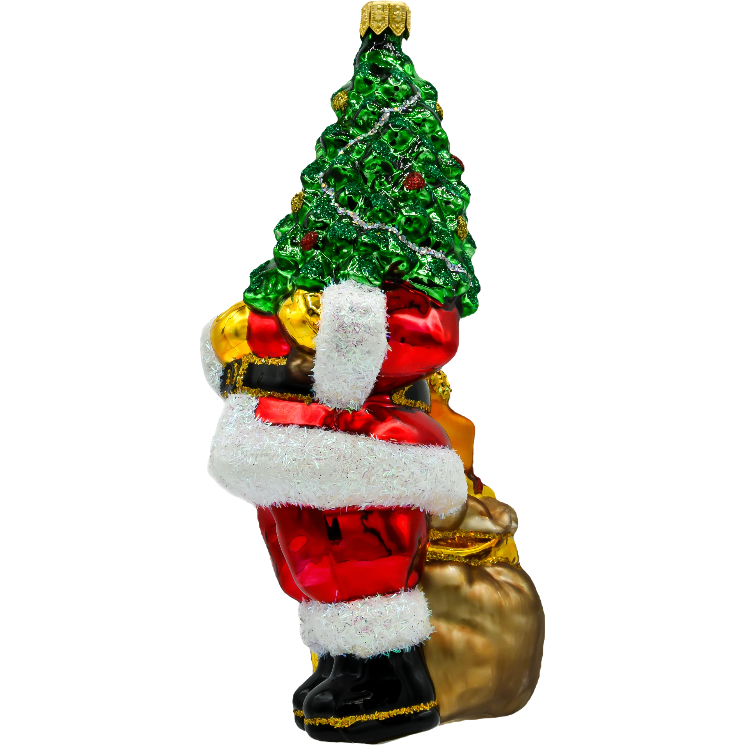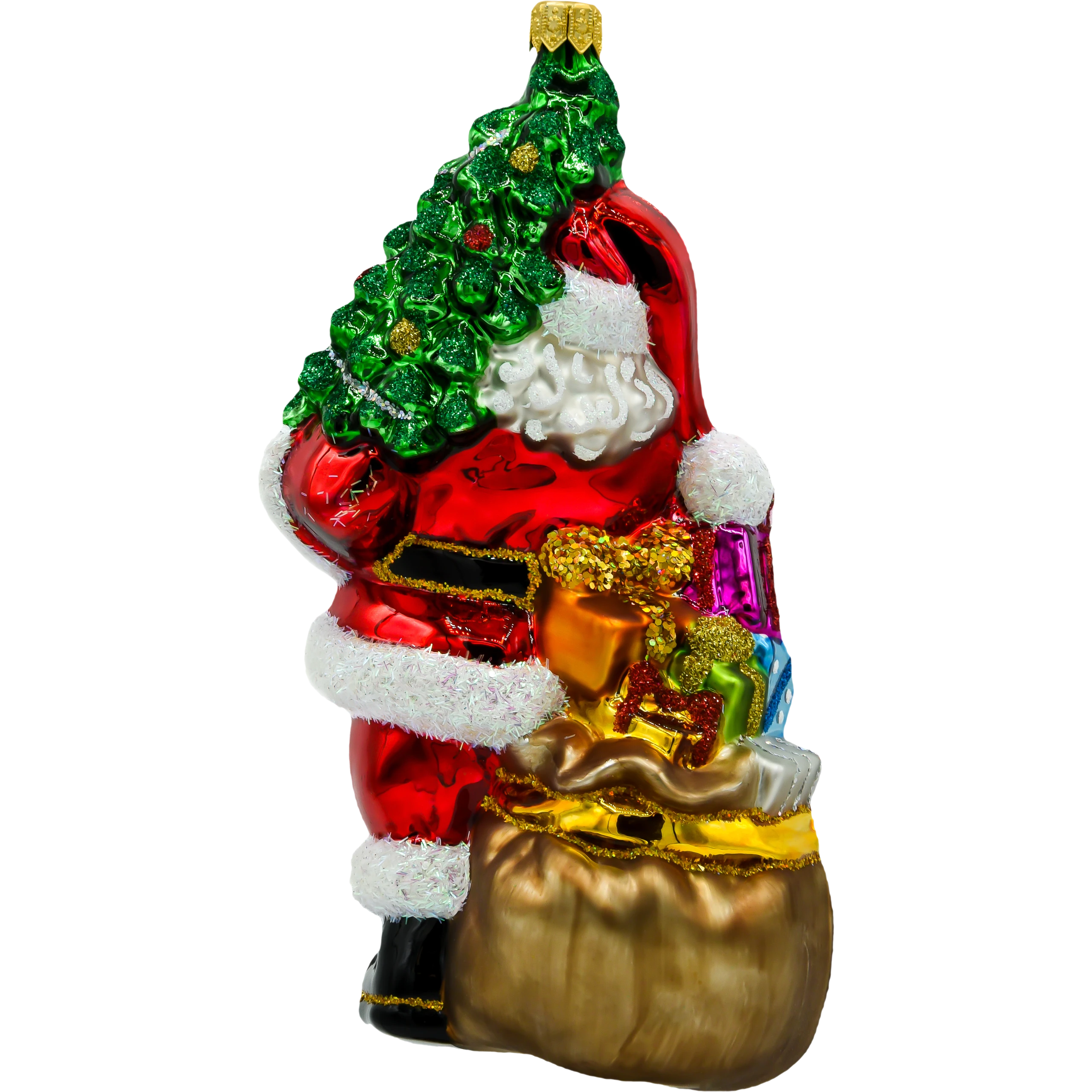 Wprowadź do swojego świątecznego wystroju odrobinę magii z ręcznie malowaną szklaną bombką „Święty Mikołaj z ciemnozieloną choinką”. Ta piękna ozdoba przedstawia klasycznego Świętego Mikołaja trzymającego bogato udekorowaną choinkę. Wyraziste kolory, takie jak czerwień stroju Mikołaja i soczysta zieleń choinki, w połączeniu z mieniącymi się detalami, sprawiają, że bombka ta staje się prawdziwą ozdobą każdej choinki.