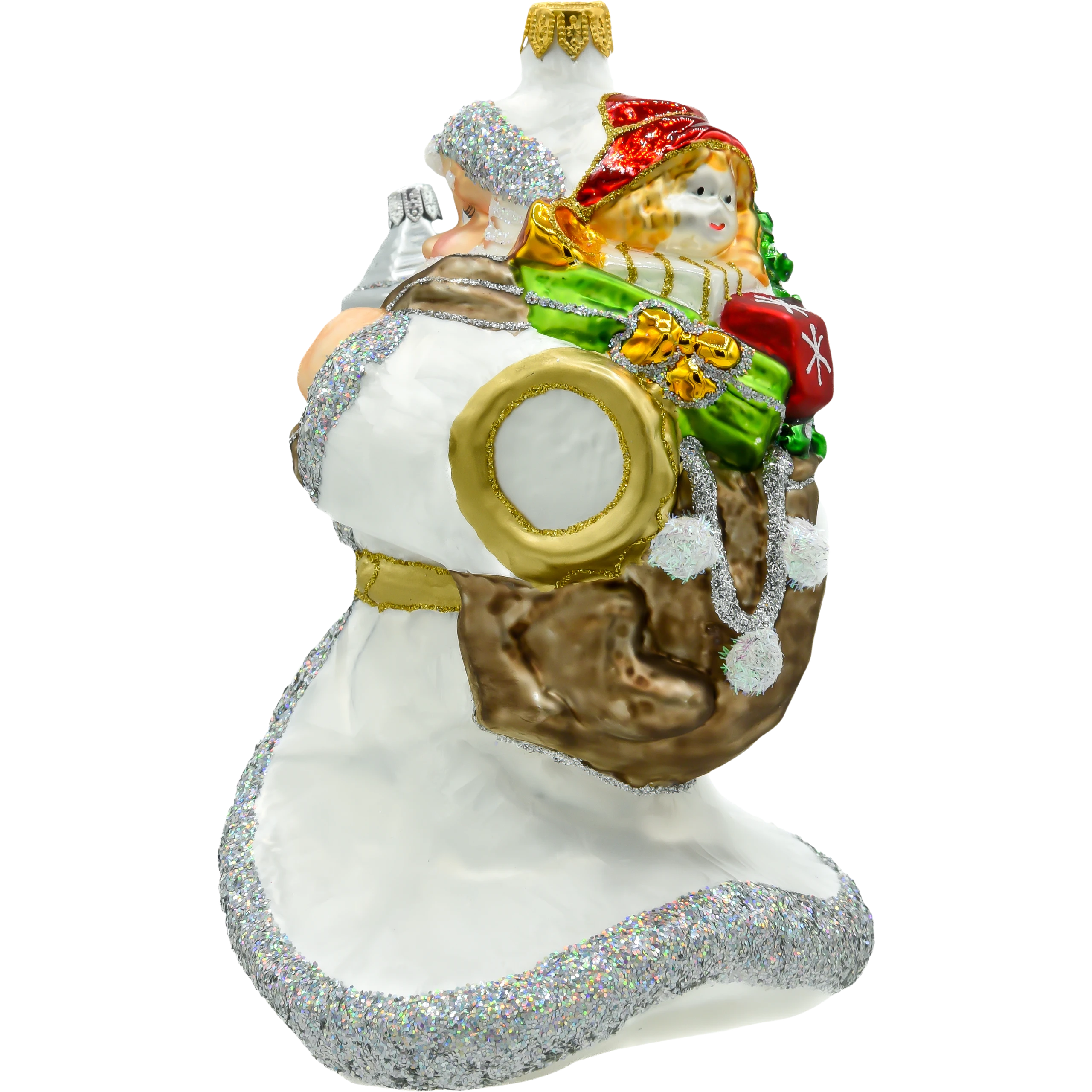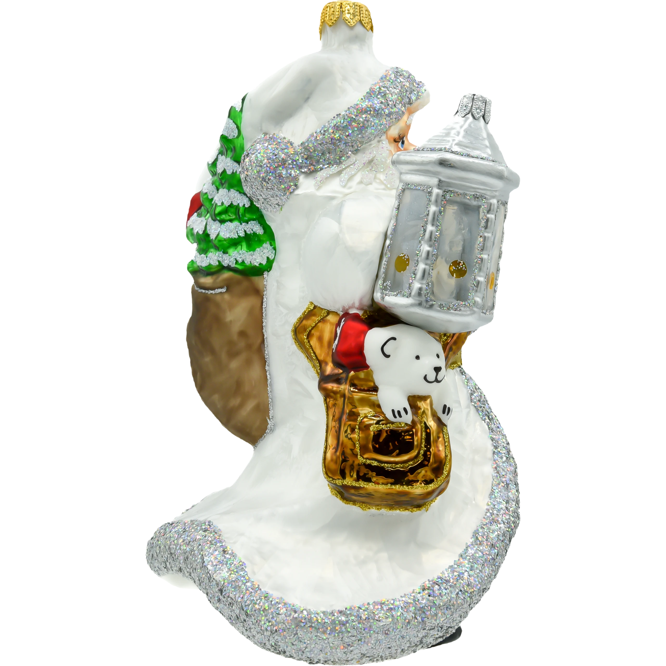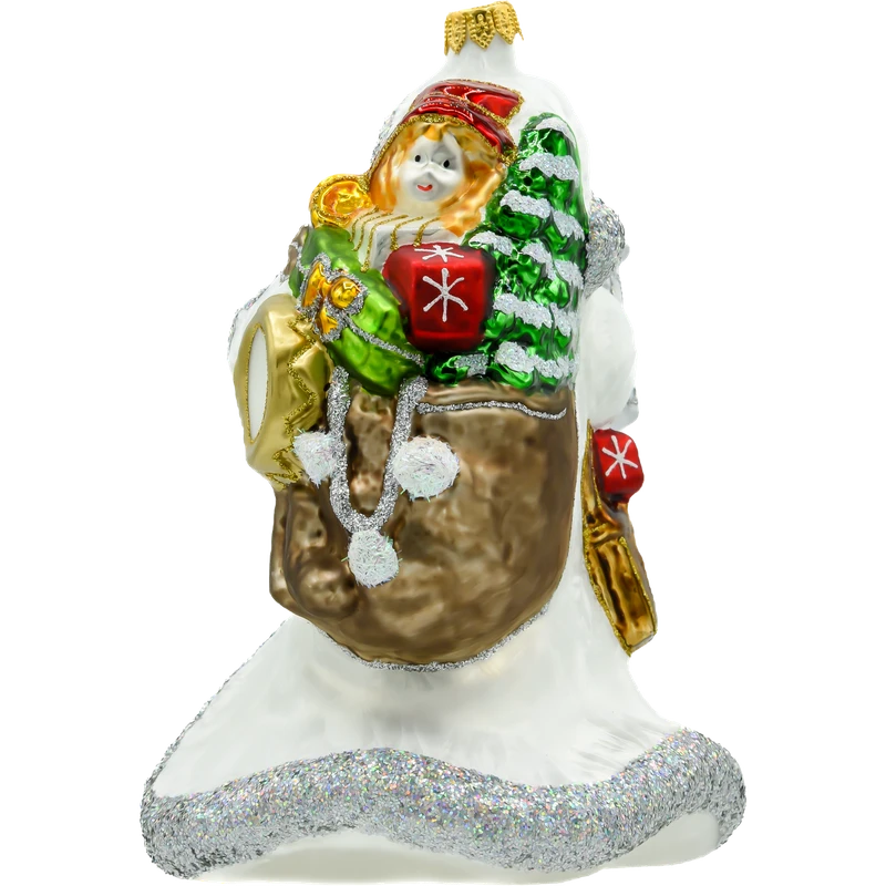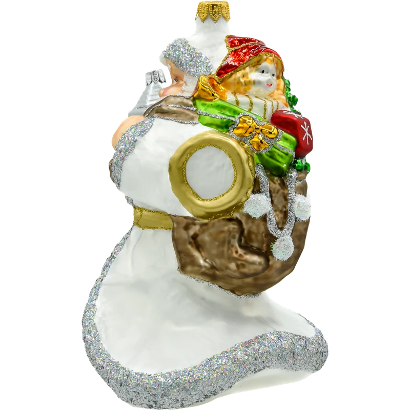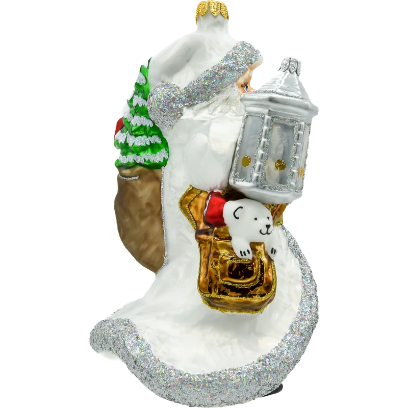 Design: Postać Świętego Mikołaja w białej szacie, trzymającego srebrzystą latarenkę, zdobiona brokatem, co nadaje jej wyjątkowego blasku.