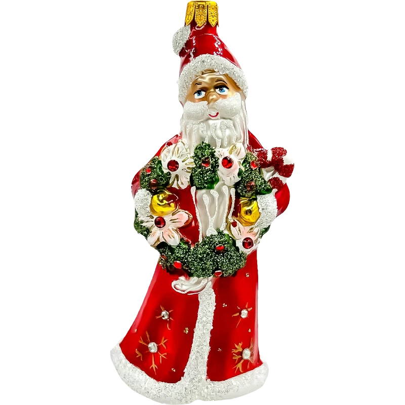 Dodaj wyjątkowego świątecznego uroku swojej choince dzięki bombce przedstawiającej Świętego Mikołaja z bogato zdobionym wieńcem świątecznym. To ręcznie wykonane dzieło sztuki idealnie łączy tradycję i elegancję, wprowadzając magię Bożego Narodzenia do Twojego domu.