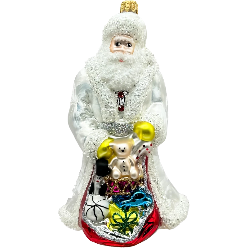 Elegancka bombka szklana przedstawiająca Świętego Mikołaja w białej, brokatowej szacie, niosącego wypełniony po brzegi worek z kolorowymi prezentami. Bogato zdobiona i pełna detali bombka stanie się centralnym punktem świątecznych dekoracji, wprowadzając do Twojego domu wyjątkową atmosferę.