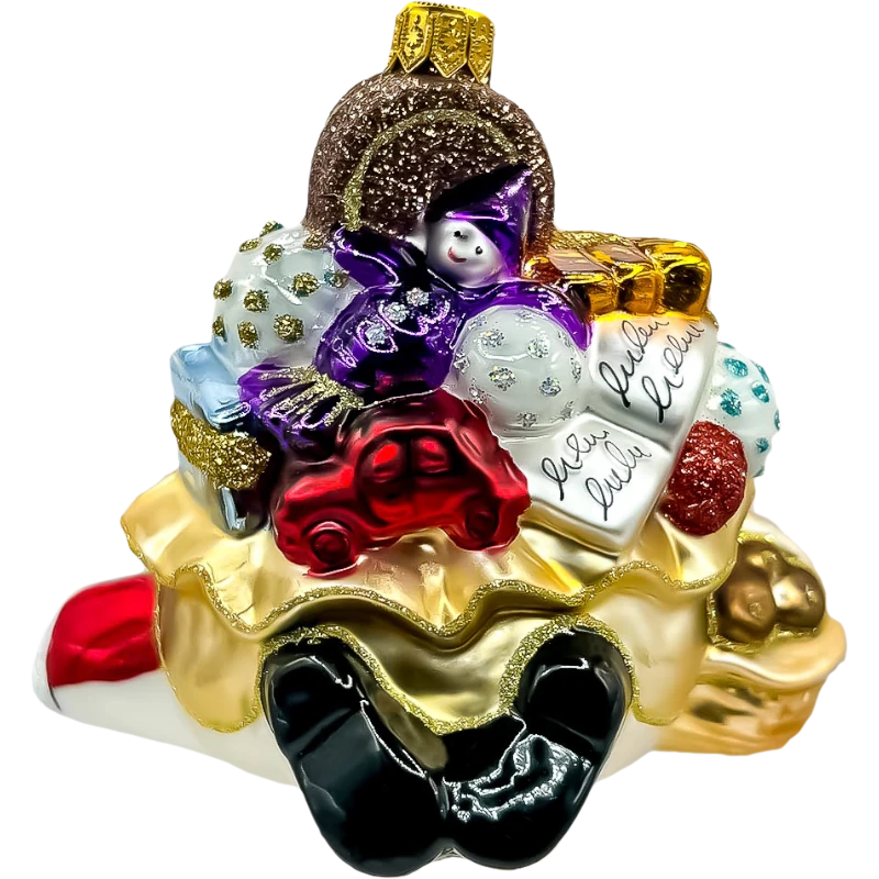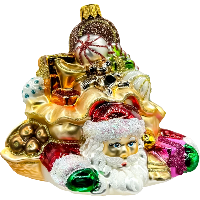 Ta wyjątkowa, ręcznie malowana bombka szklana to kwintesencja świątecznej magii, która zachwyci każdego miłośnika tradycyjnych dekoracji bożonarodzeniowych. Bombka przedstawia Świętego Mikołaja, zanurzonego pośród mnóstwa prezentów i słodyczy, co tworzy niepowtarzalną kompozycję pełną detali i kolorów. Wykonana z wysokiej jakości szkła, bombka odznacza się precyzją wykonania, a intensywne barwy i błyszczące akcenty nadają jej elegancji i blasku, idealnego na świąteczne drzewko.