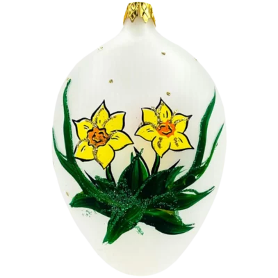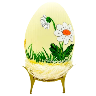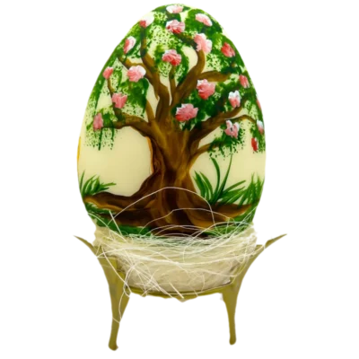 Przezroczysta ozdoba w kształcie jajka. Przedstawia uroczego zajączka wielkanocnego jedzącego pyszną czekoladkę ukrytą w wielkanocnej pisance. Zajączek przesiaduje na małej, zielonej polanie pełnej kolorowych kwiatów.