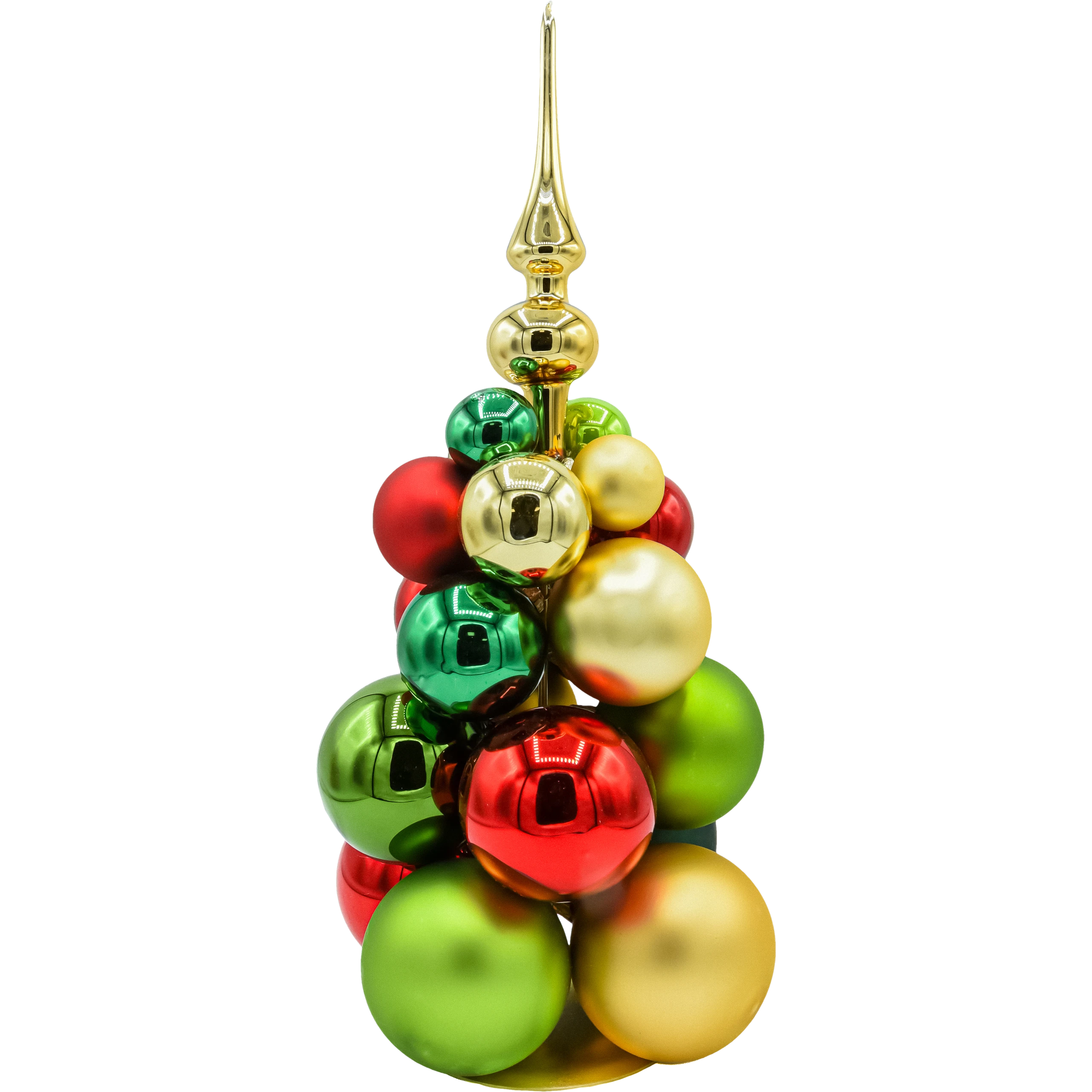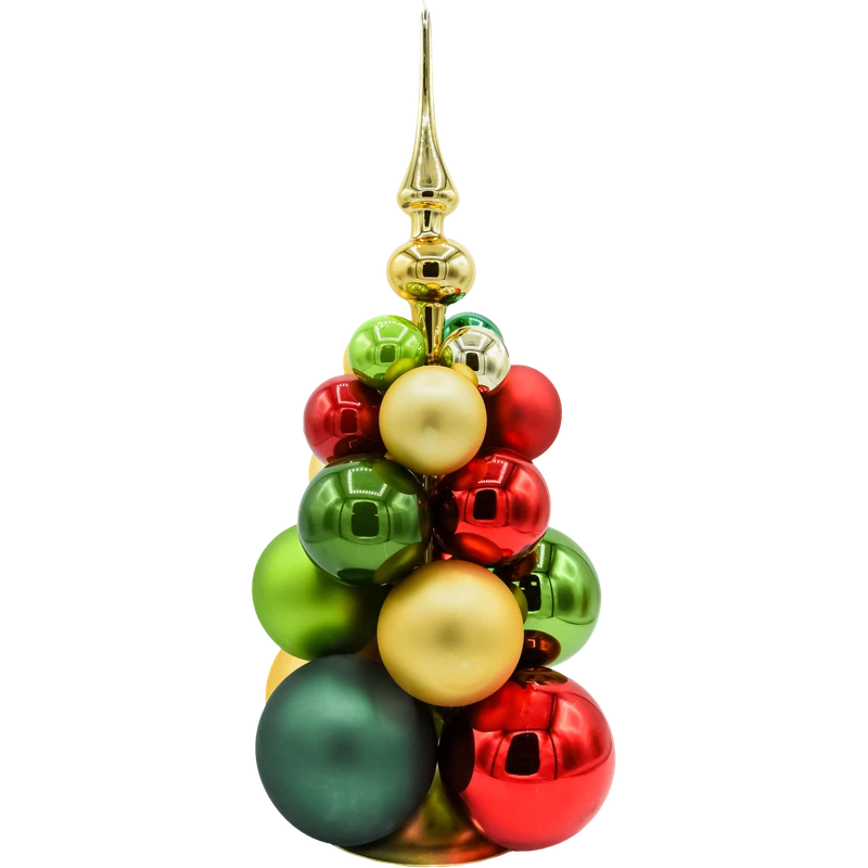 fektowna, stojąca szklana choinka złożona z bombek o różnych średnicach w klasycznych barwach czerwieni, zieleni i złota. Smukły, błyszczący złoty szpic wieńczy kompozycję, nadając jej elegancji w stylu glamour. To gotowa dekoracja świąteczna – nie wymaga żadnego montażu ani dodatkowego oświetlenia, a mimo to pięknie odbija światło lampek i świec, tworząc biżuteryjny połysk.