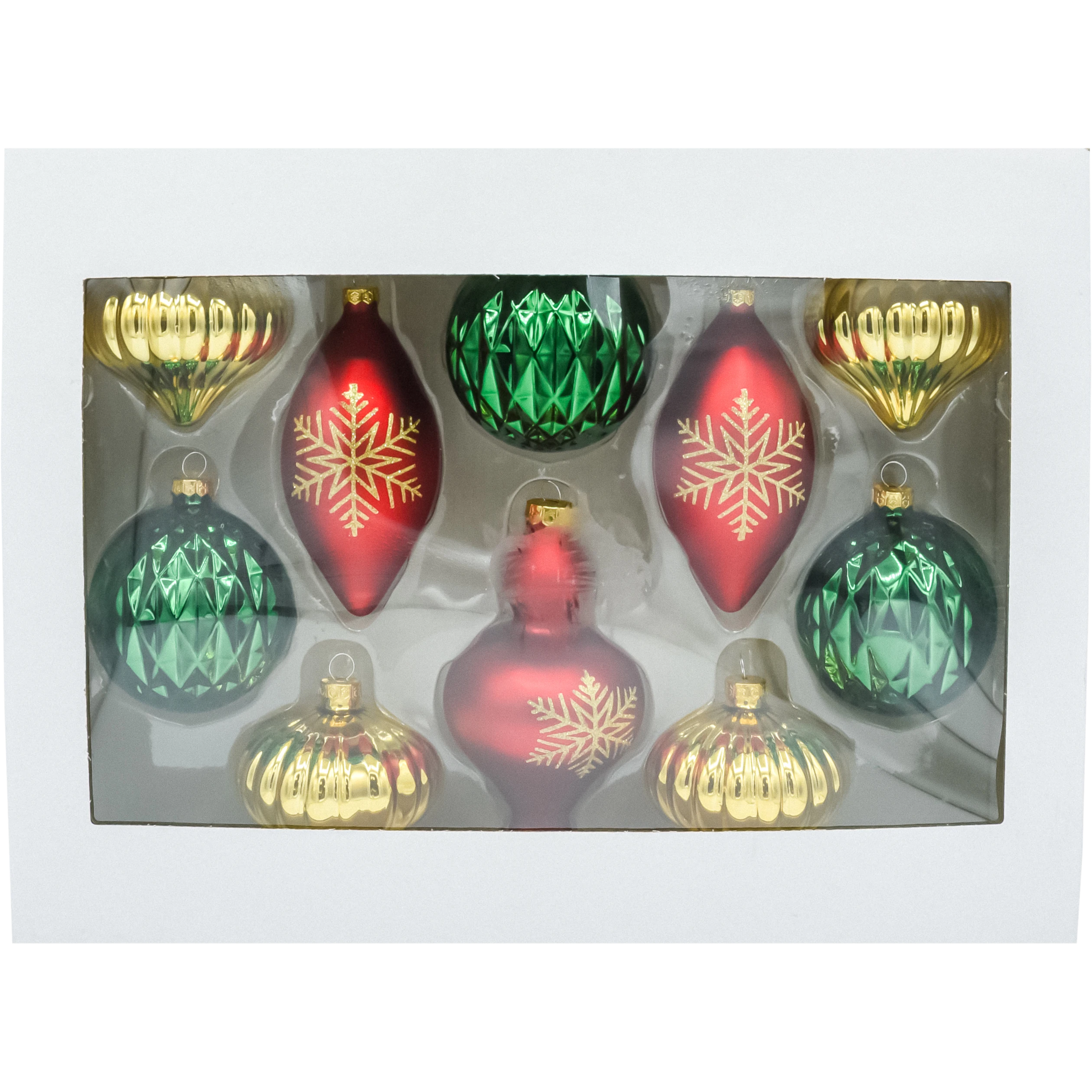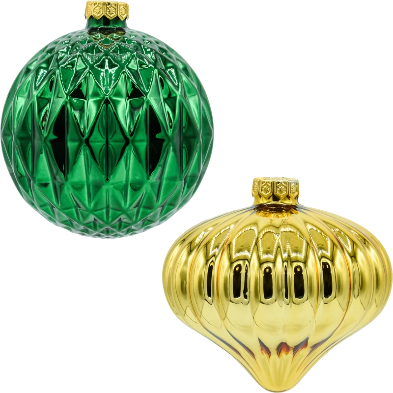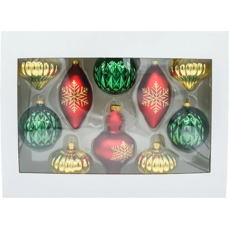 Zestaw bombek choinkowych 10 szt. w klasycznej palecie czerwień–zieleń–złoto. W komplecie różne kształty: fasetowane zielone kule, złote karbowane „cebule”, smukłe czerwone krople i czerwona cebulka – wszystkie z brokatowymi śnieżynkami i eleganckimi wykończeniami (mat, połysk, faktura). Lekkie, wytrzymałe, gotowe do powieszenia. Idealne bombki na choinkę, do stroików i wieńców, także jako prezent świąteczny.
