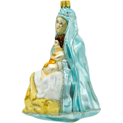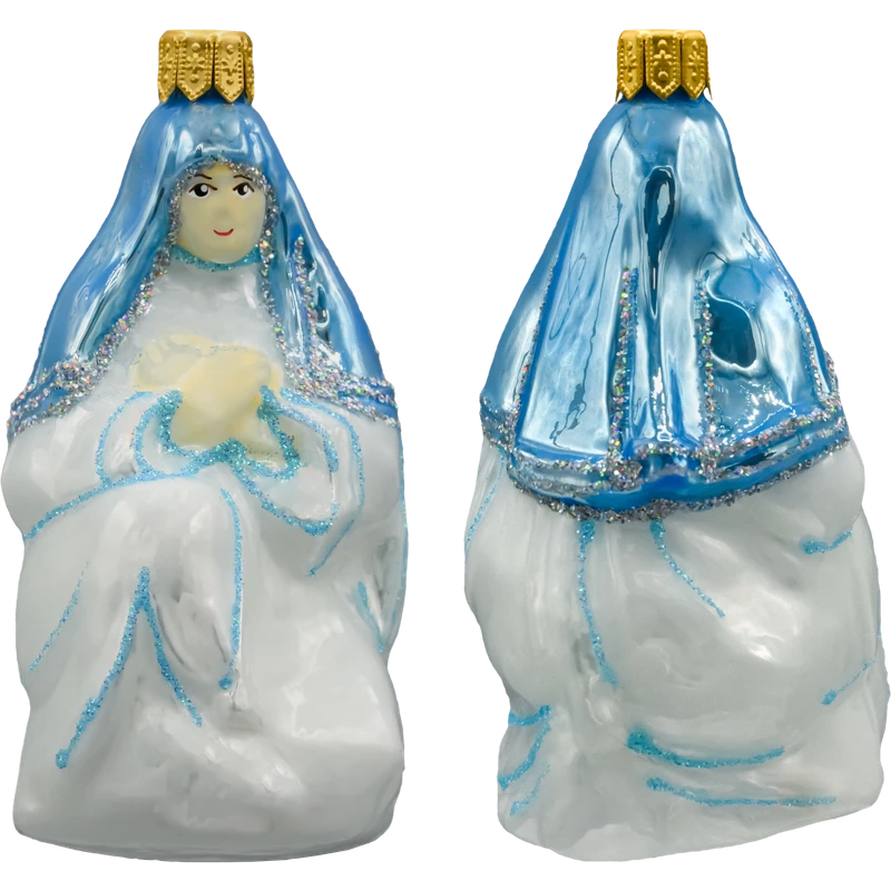 Szklana figurka Maryi w białej szacie i błękitnym welonie, ozdobionym połyskującym brokatem. Jej dłonie złożone są do modlitwy, twarz delikatna, pełna spokoju. Symbol macierzyńskiej miłości i czułości.