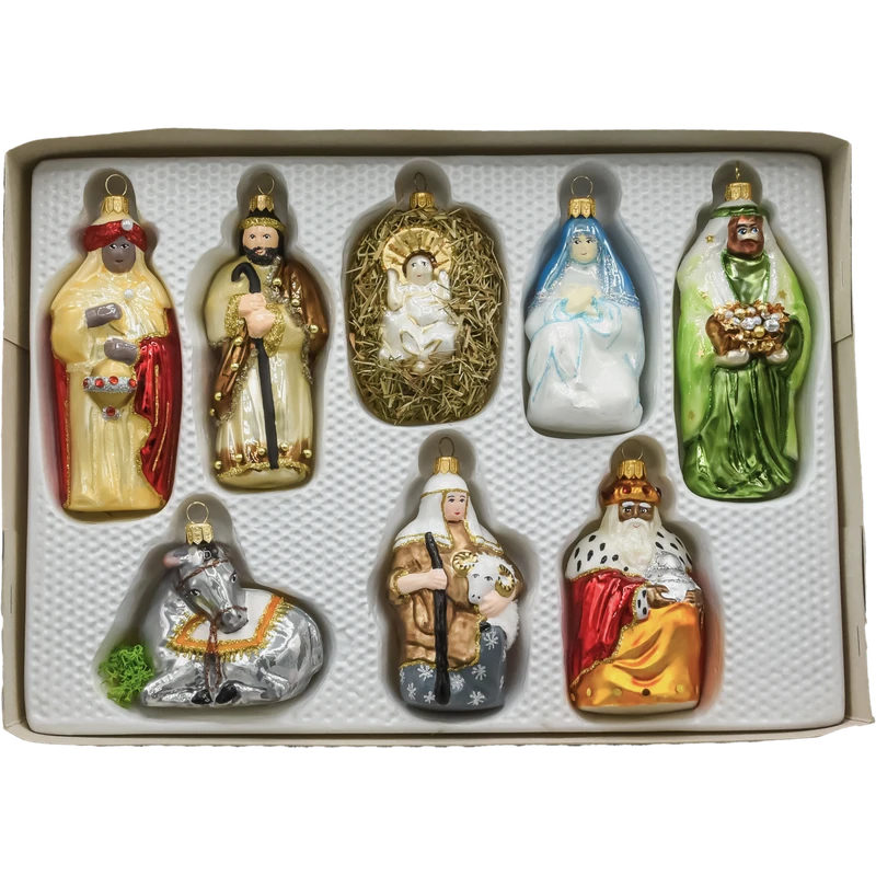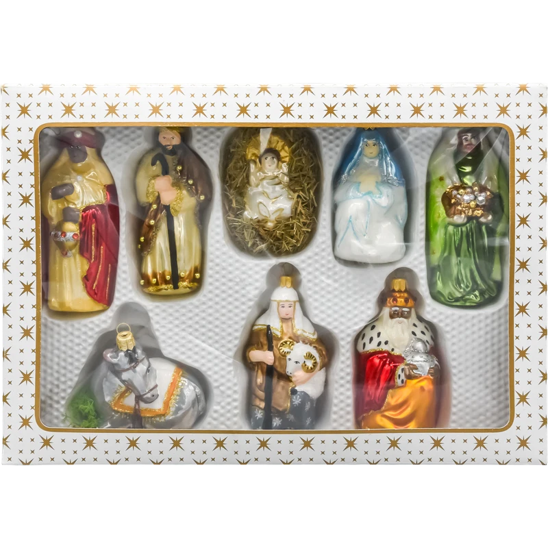 Szklany zestaw bombek szopka bożonarodzeniowa – 8 ręcznie malowanych figurek ze szkła dmuchanego: Dzieciątko Jezus, Maryja, Józef, Trzej Królowie, pasterz i wołek. Idealna ozdoba choinkowa w eleganckim pudełku.