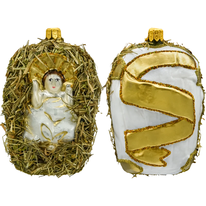 Bombka przedstawia leżące Dzieciątko Jezus w aureoli z brokatu, umieszczone w żłóbku wyściełanym naturalnym sianem. Złote zdobienia i realistyczna stylizacja tworzą piękne centrum całej sceny.