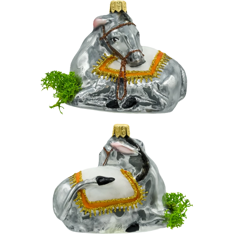 Leżący wołek wykonany ze szkła o metalicznym połysku, z realistycznym umaszczeniem i siankiem u boku. Posiada uprząż ozdobioną brokatową lamówką w kolorze złoto-pomarańczowym.