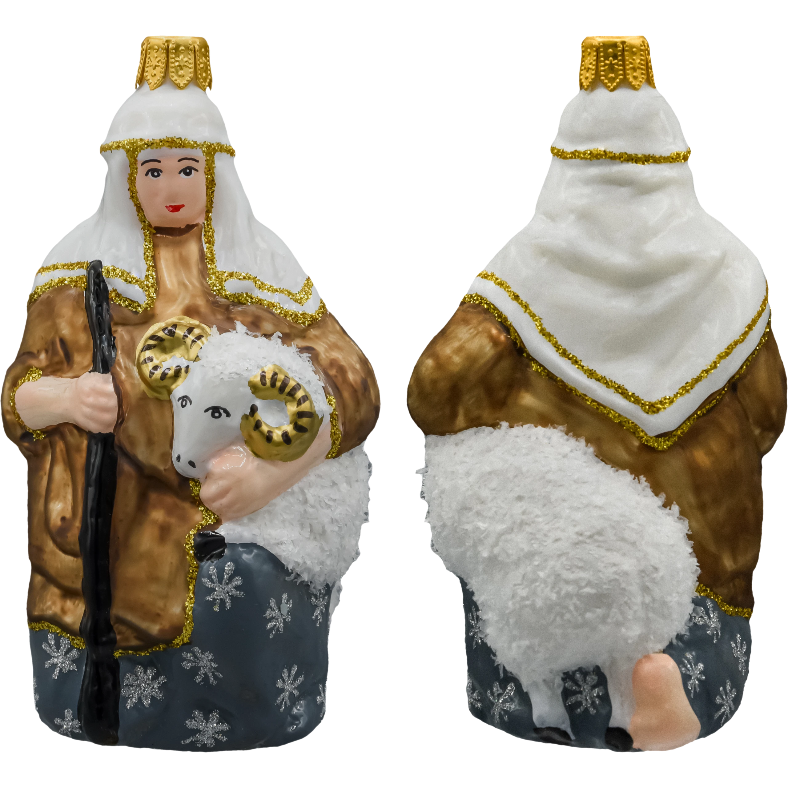 Ciepła postać pasterza z laską pasterską i białym barankiem przytulonym do piersi. Jego szaty w odcieniach beżu i złota są ozdobione brokatem i srebrnymi płatkami śniegu.