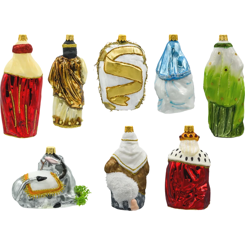Ten wyjątkowy zestaw 8 szklanych bombek to pełna, elegancka szopka bożonarodzeniowa wykonana z najwyższej jakości szkła dmuchanego i dekorowana ręcznie. Każda figurka została stworzona z troską o detale – od ekspresji twarzy po brokatowe i złocone wykończenia, które pięknie odbijają światło lampek choinkowych.