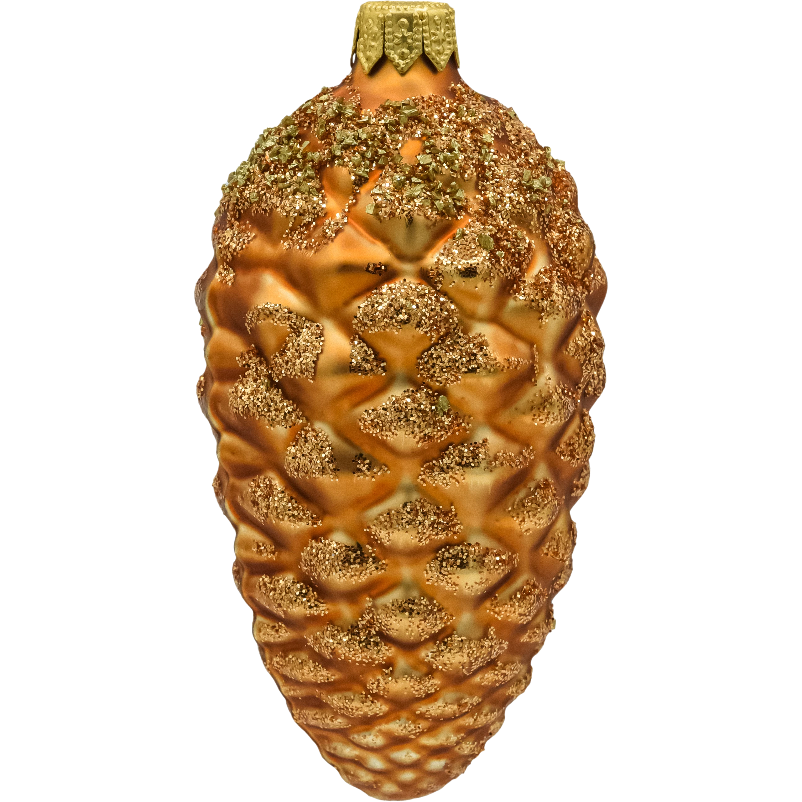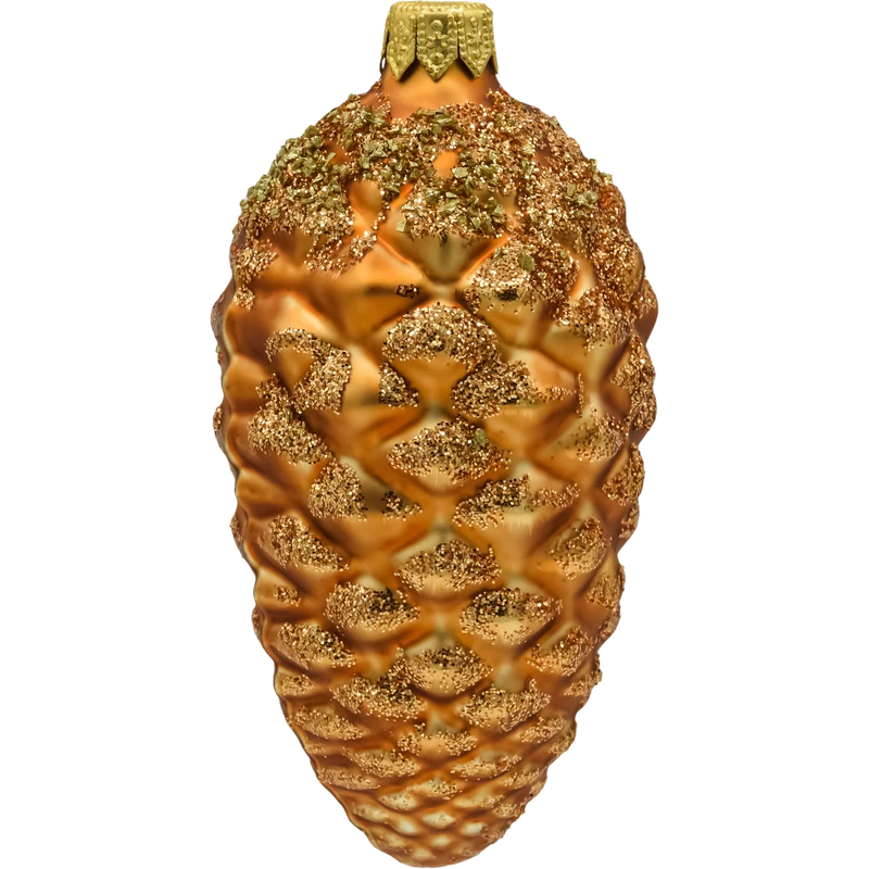 Szklana bombka choinkowa w kształcie szyszki, ręcznie dekorowana złotym brokatem. Idealna do eleganckich, naturalnych aranżacji świątecznych. Stylowa ozdoba w kolorze miedziano-złotym.