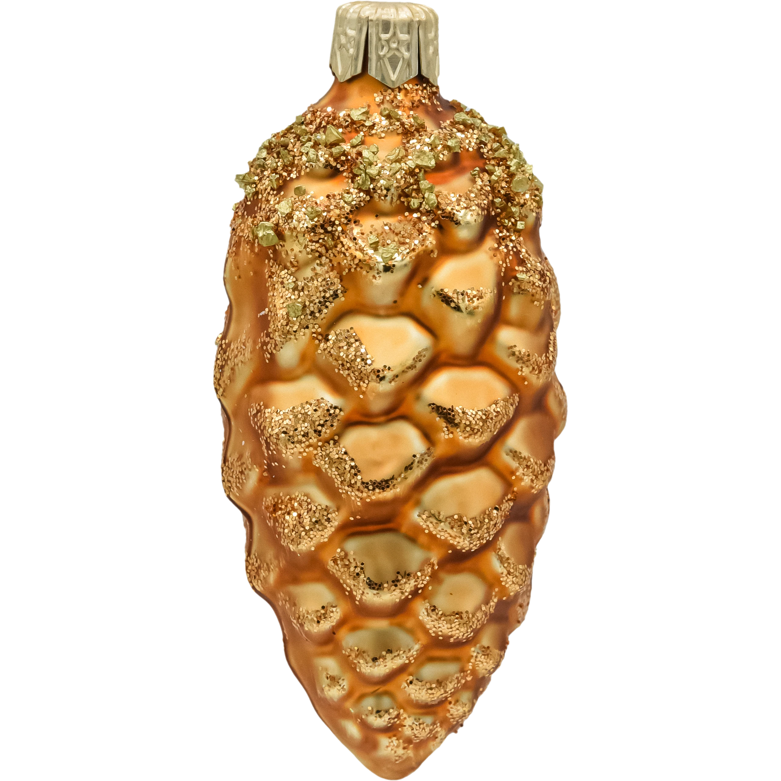 Szklana bombka choinkowa szyszka w kolorze brązowo-złotym – ręcznie malowana ozdoba świąteczna z brokatem. Elegancka dekoracja choinkowa w stylu glamour i vintage.