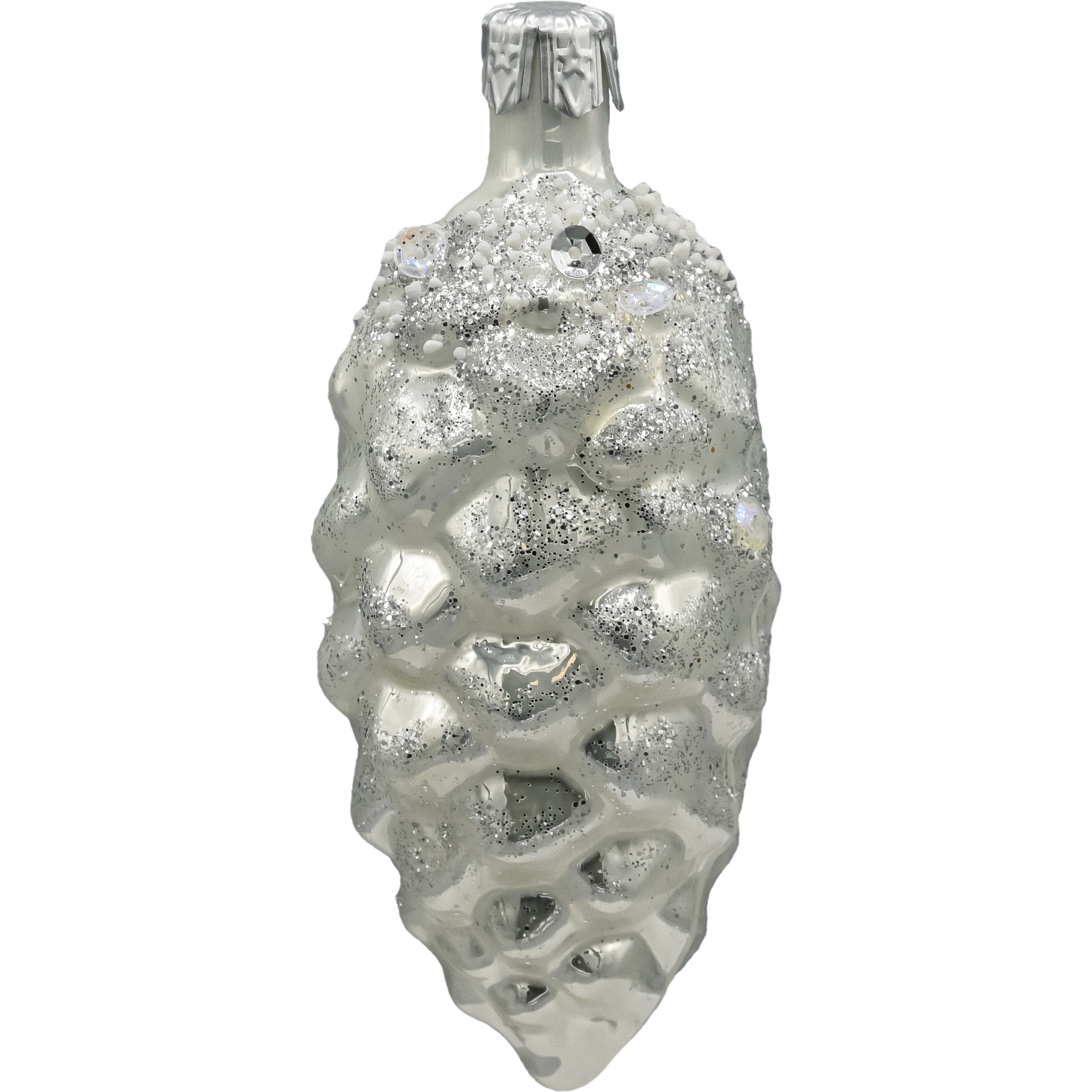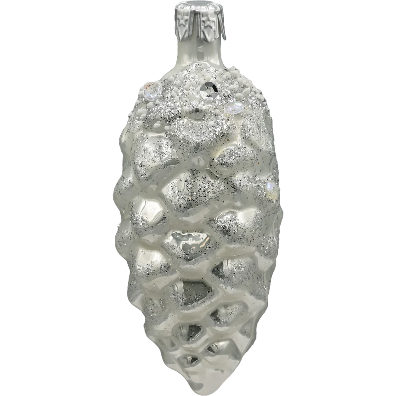 Szklana bombka choinkowa szyszka srebrna z brokatem i kryształkami – elegancka ozdoba bożonarodzeniowa