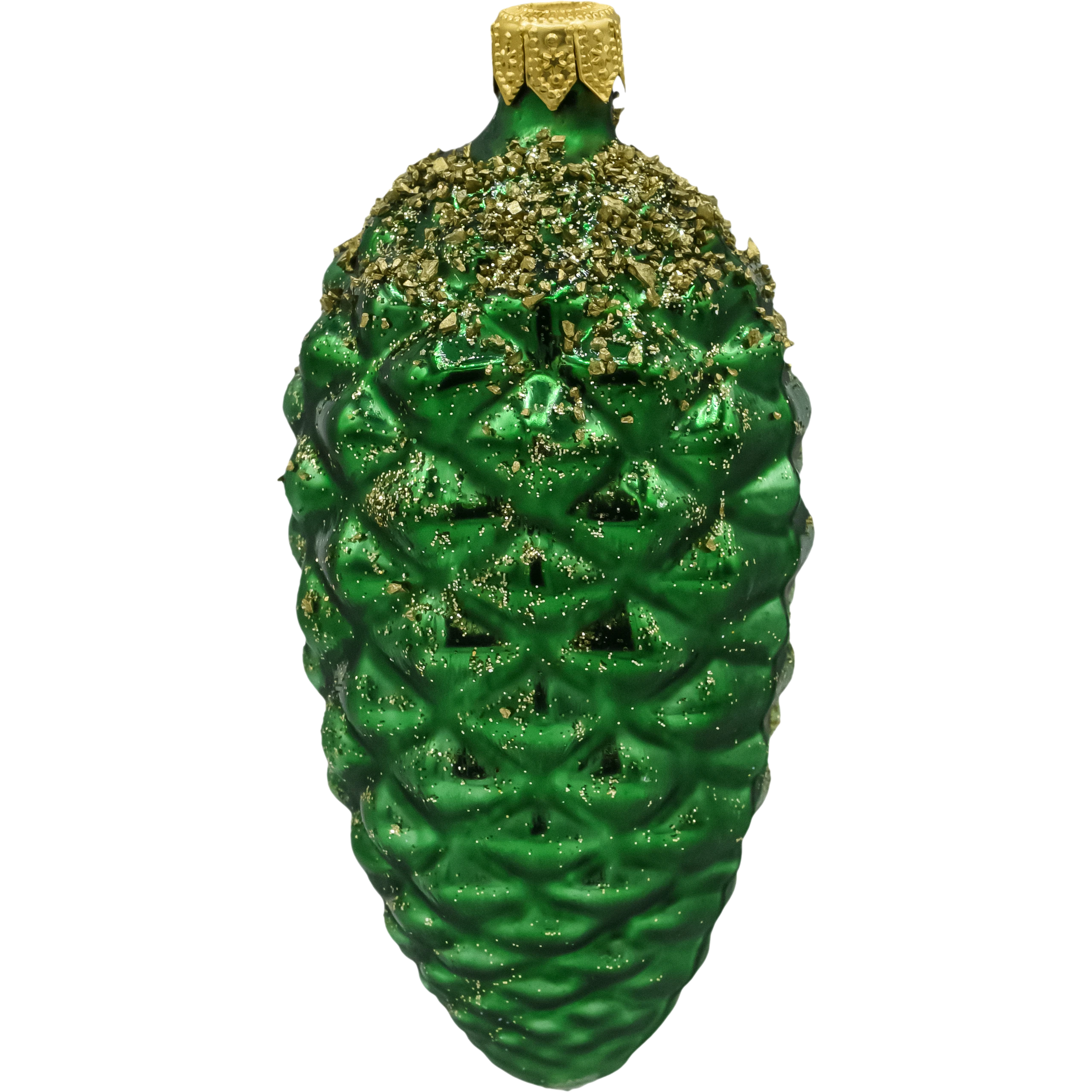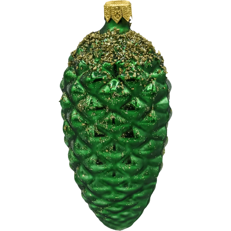 Szklana bombka choinkowa w kształcie zielonej dużej szyszki z brokatem – elegancka ozdoba świąteczna idealna do naturalnych i klasycznych dekoracji bożonarodzeniowych.