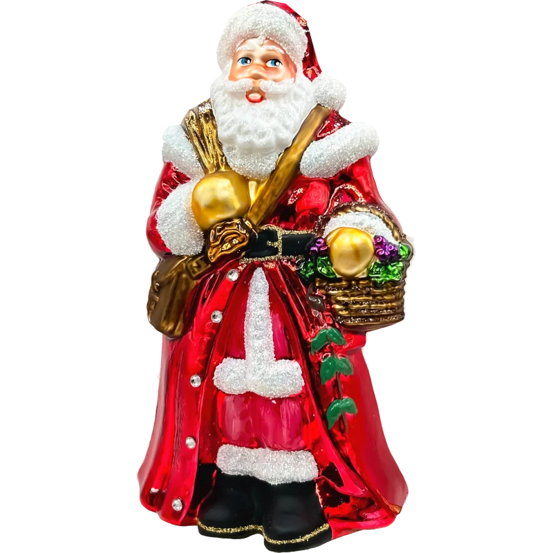 Bombka wykonana jest z wysokiej jakości szkła, co zapewnia jej trwałość i elegancki blask. Mikołaj ubrany w charakterystyczny czerwony płaszcz ozdobiony białym futerkiem trzyma w jednej ręce worek z prezentami, a w drugiej kosz pełen kolorowych upominków. Detale takie jak brokatowe wykończenia i starannie malowane elementy sprawiają, że bombka ta stanie się wyjątkową ozdobą Twojej choinki.