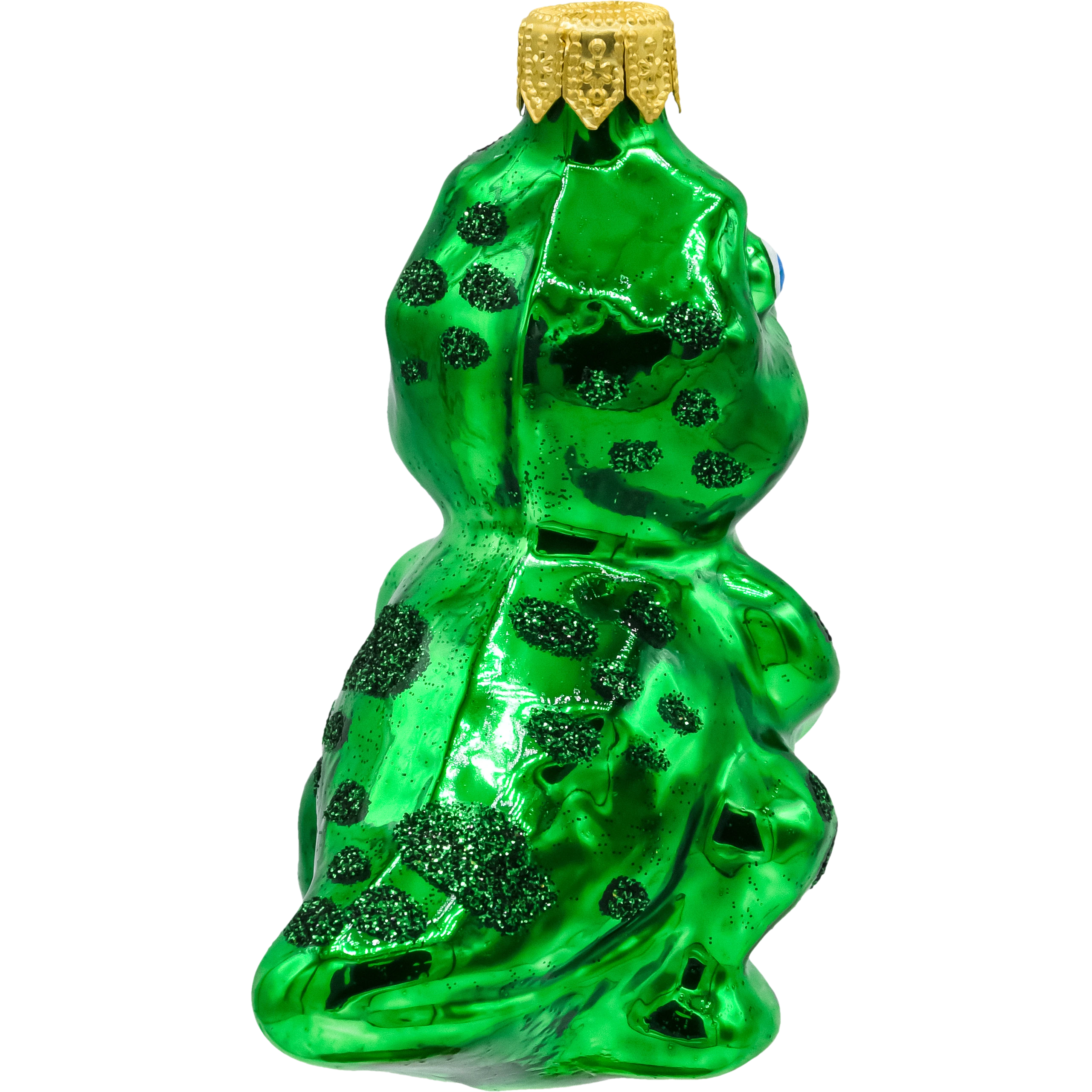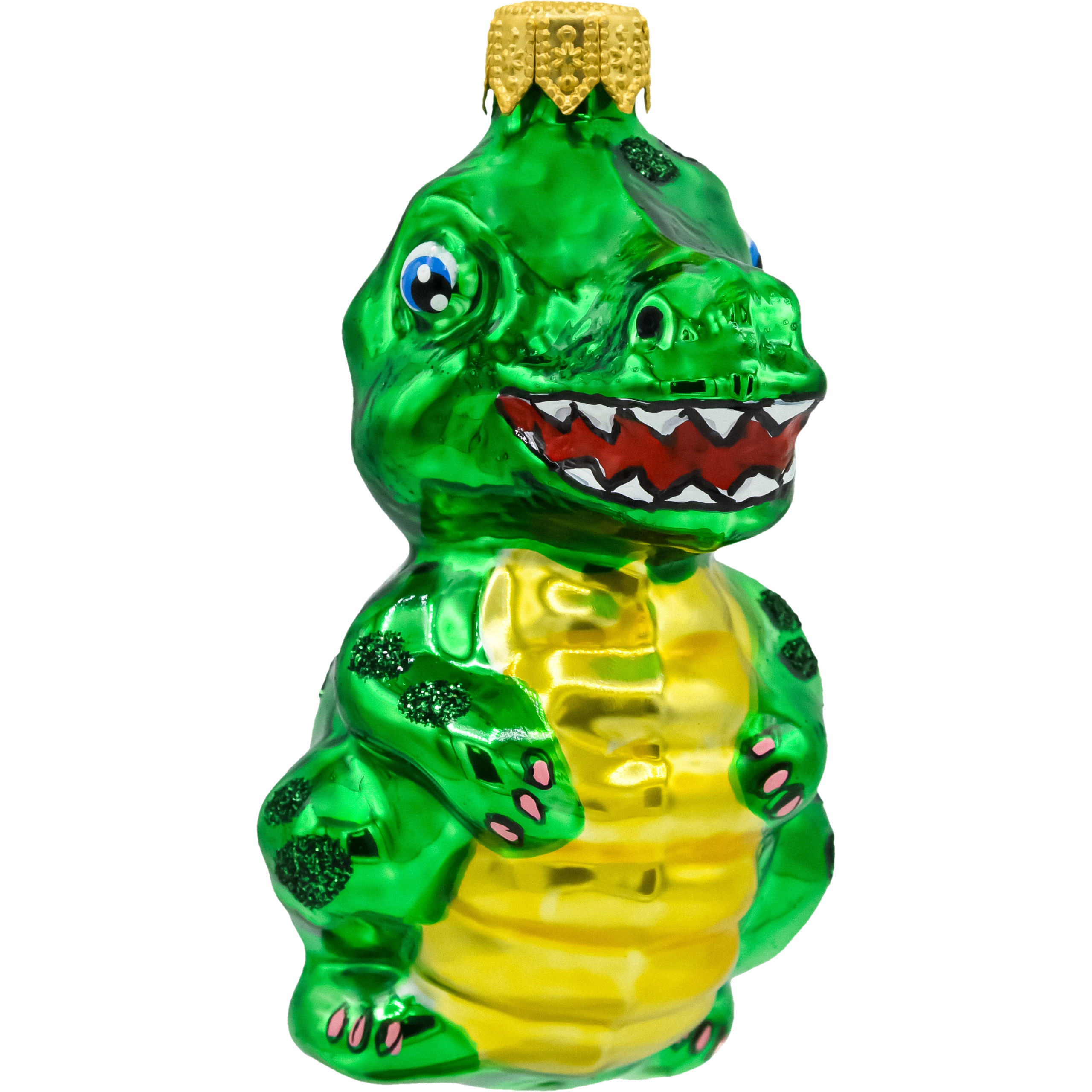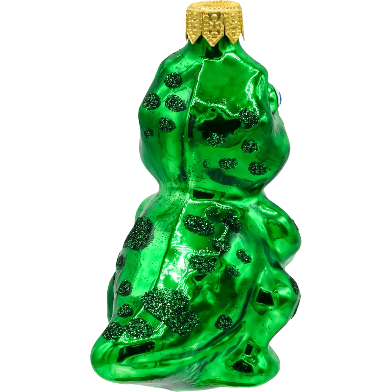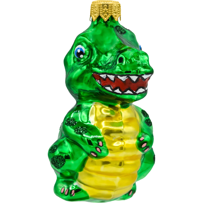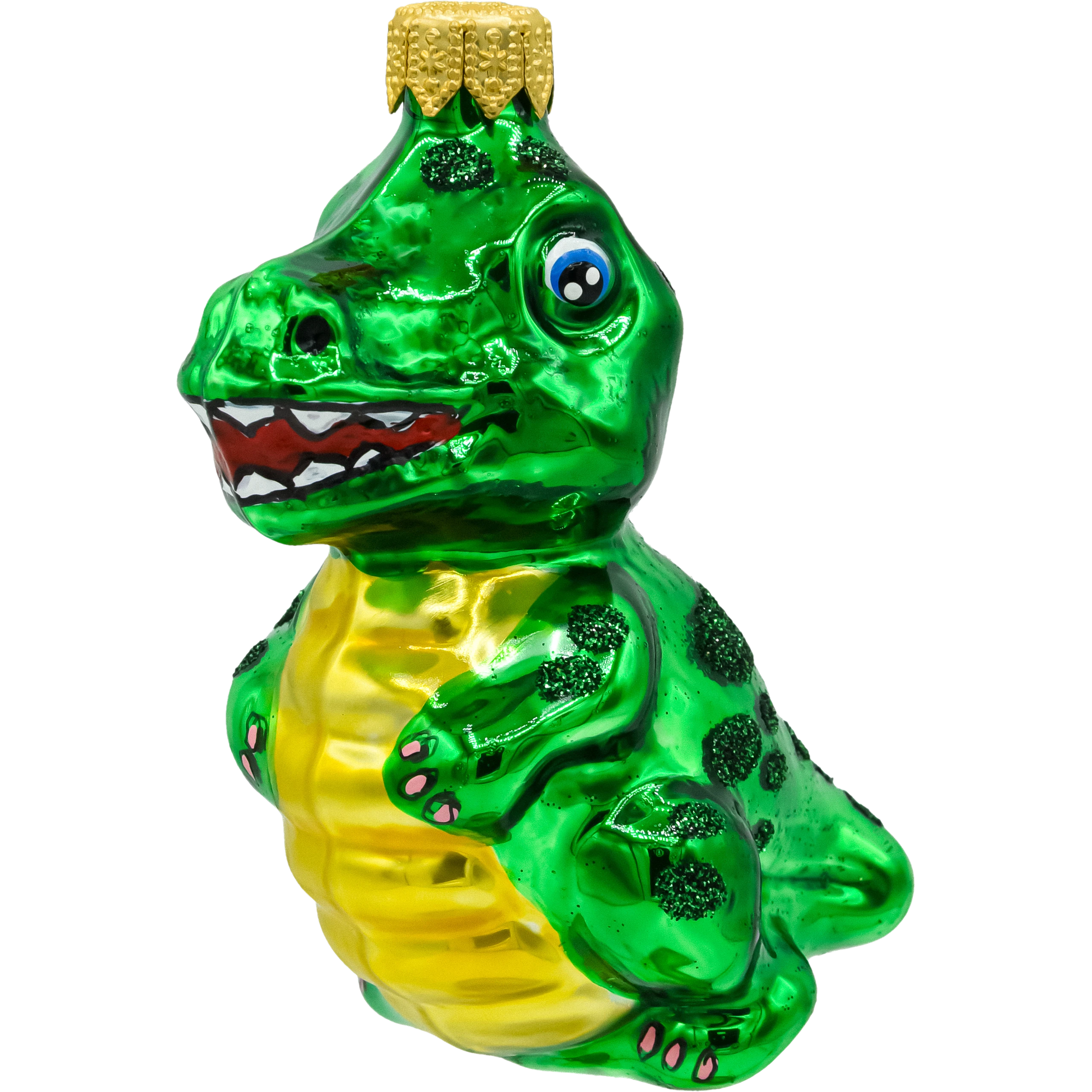 Ten uroczy tyranozaur, wykonany z najwyższą precyzją, zachwyca intensywnym zielonym kolorem, połyskującymi elementami oraz wyrazistymi białymi zębami w szerokim uśmiechu. Detale takie jak błyszczące, brokatowe plamki na ciele oraz malowane pazurki. Bombka została wykonana ręcznie z dmuchanego szkła.