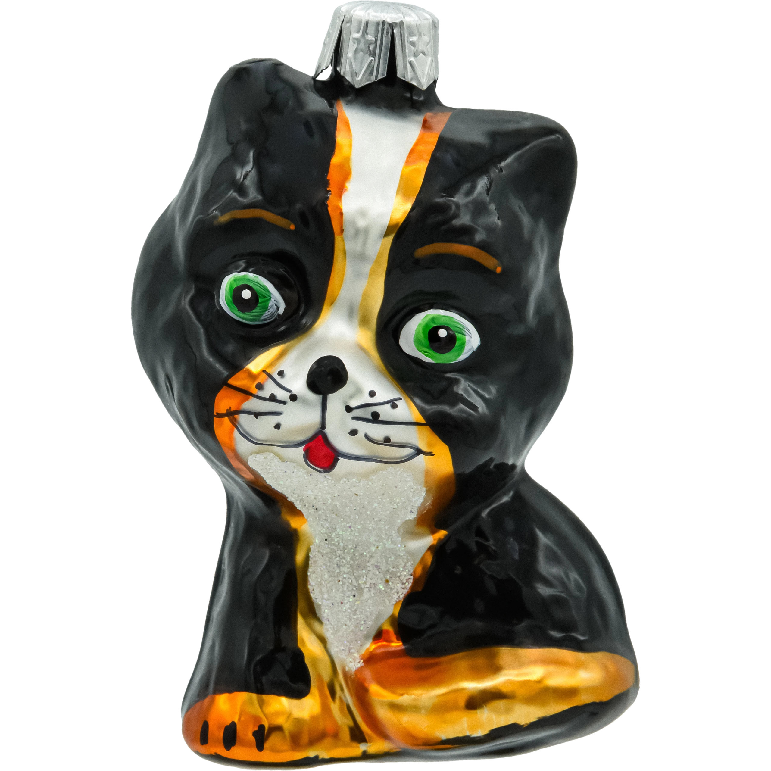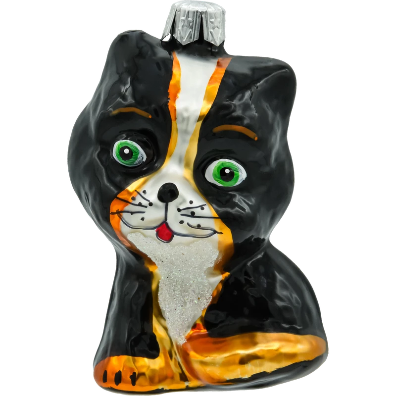 Wykonana z wysokiej jakości szkła, ozdoba przedstawia kota o dużych, zielonych oczach i uśmiechniętym pyszczku. Starannie wykonane detale, takie jak czarne futerko z białym i rudym akcentem, dodają charakteru i realistycznego wyglądu. Kot ma klasyczną, sympatyczną pozę, która przyciągnie wzrok zarówno dzieci, jak i dorosłych.