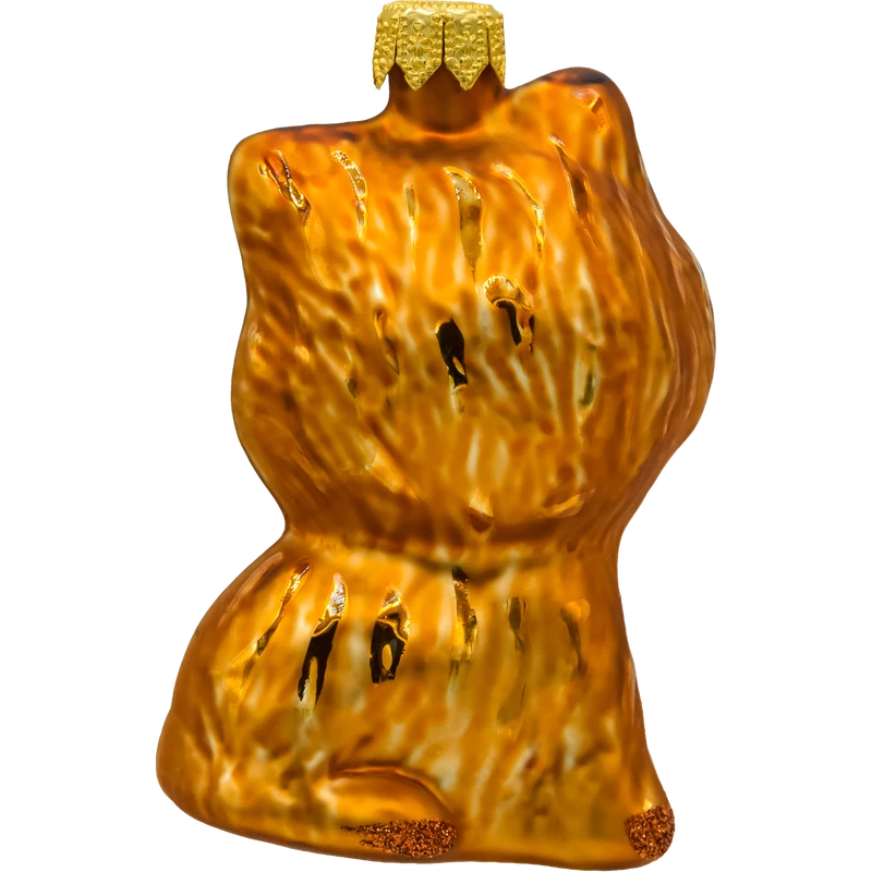 Kotek wykonany jest z wysokiej jakości szkła, a jego błyszczące brązowe futerko jest zdobione subtelnymi brokatowymi akcentami, które pięknie odbijają światło lampek choinkowych, nadając ozdobie wyjątkowego blasku.