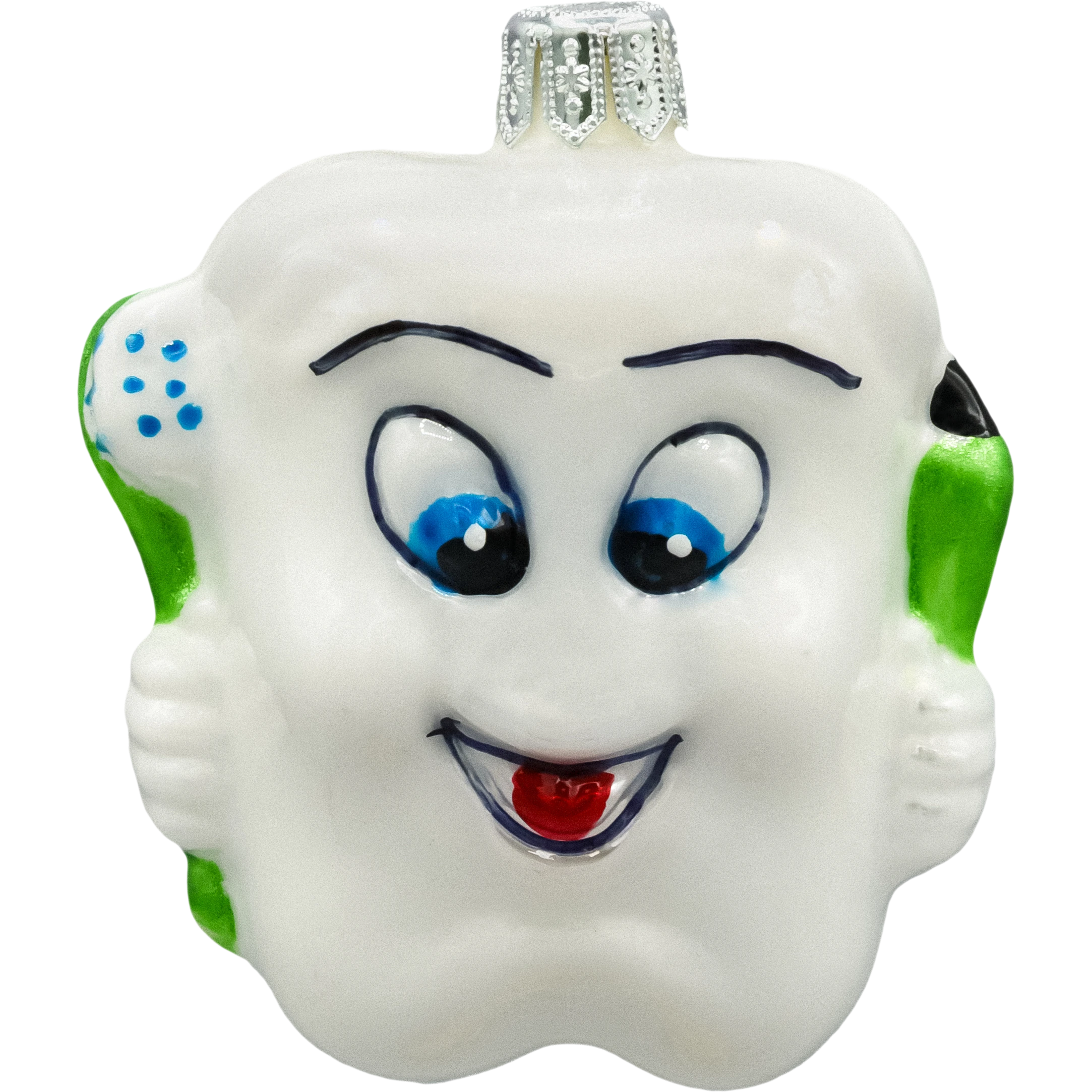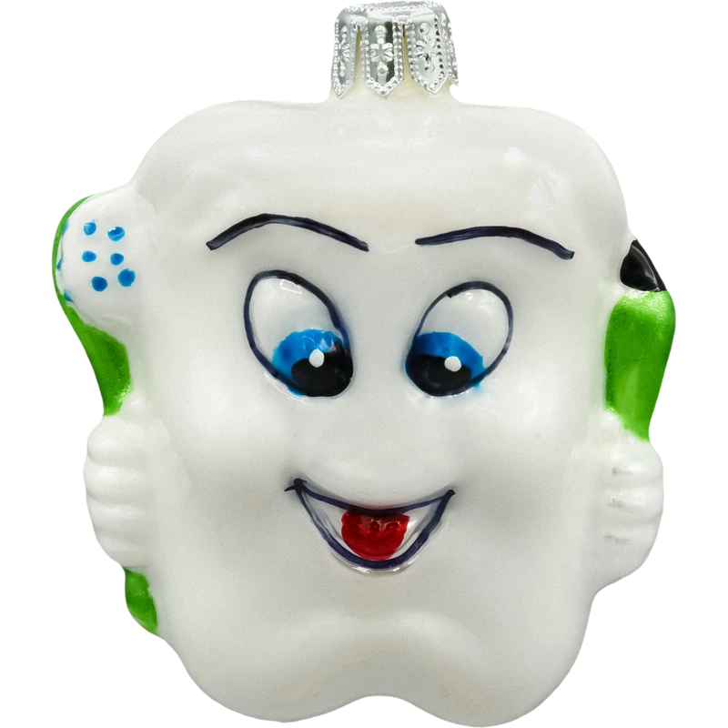Bombka przedstawia ząbek z sympatycznym wyrazem twarzy, co czyni ją doskonałym wyborem dla dzieci i osób z poczuciem humoru.