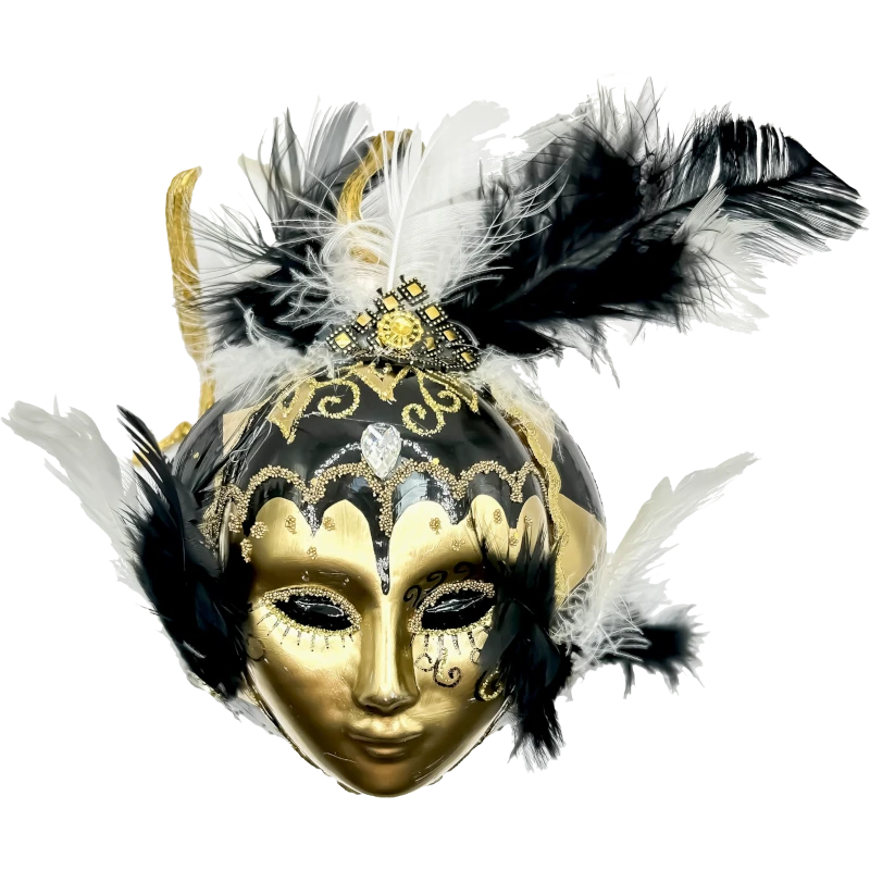 Elegancka szklana ozdoba wenecka w formie maski karnawałowej to idealny dodatek do Twoich świątecznych dekoracji lub wyjątkowych okazji, takich jak karnawał. Maska zachwyca swoim bogatym wykończeniem w złotych i czarnych kolorach, a jej luksusowy design podkreślają liczne detale, w tym pióra w kolorach białym i czarnym. Na czole znajduje się efektowny diamentowy detal, a nad nim delikatne, czarne pióra tworzące efektowną koronę.