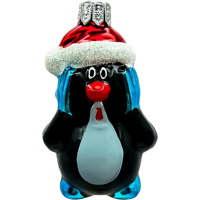 Szklana bombka w kształcie wesołego krecika w czapce Świętego Mikołaja