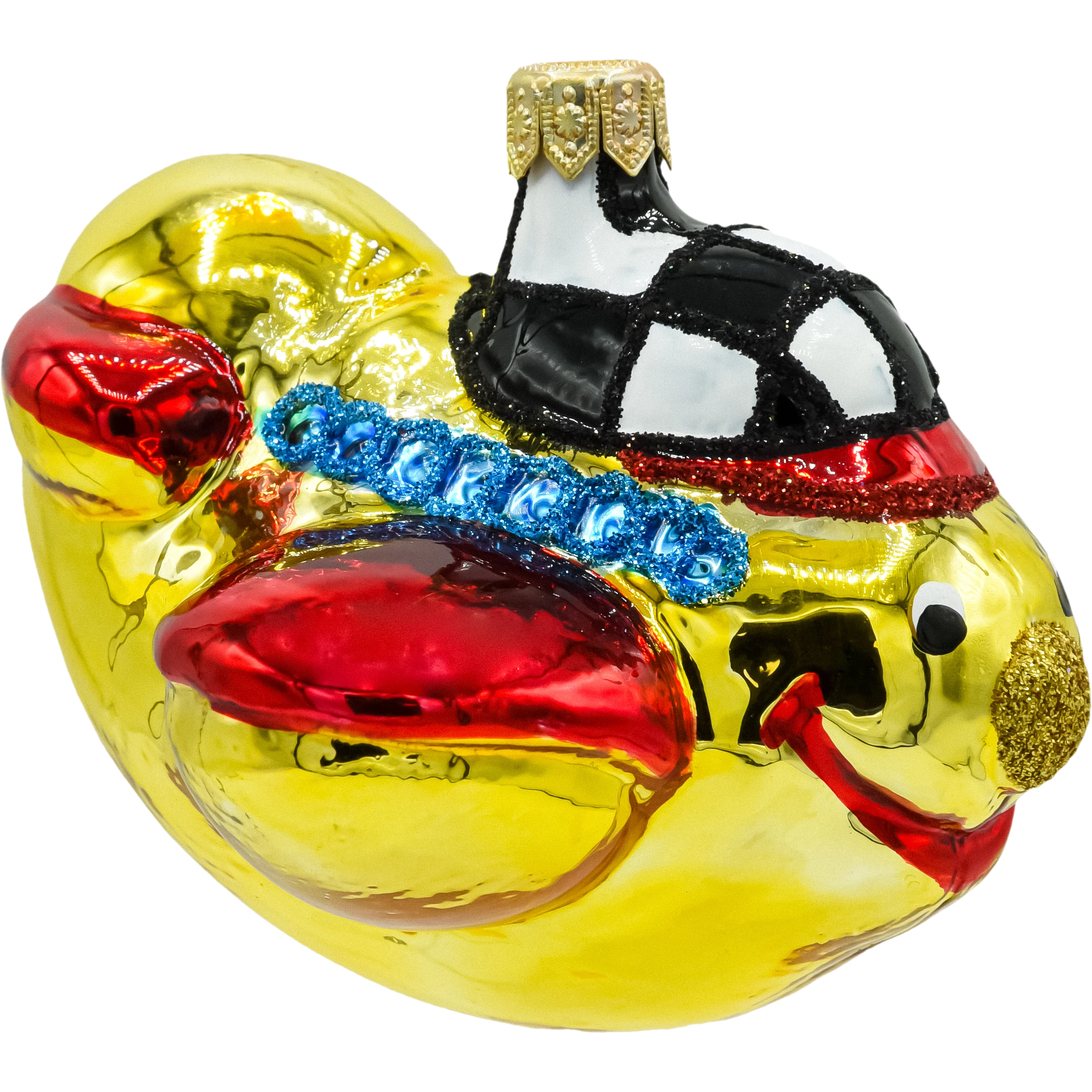 Bombka w kształcie uśmiechniętego samolotu wyróżnia się swoim radosnym wyrazem twarzy i intensywnymi kolorami, które przyciągają wzrok i rozjaśniają świąteczną atmosferę.