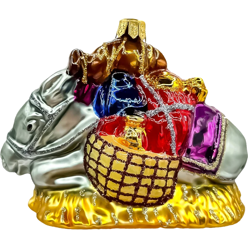Bombka „Wielbłąd z darami” została wykonana ręcznie z najwyższej jakości szkła, co zapewnia jej trwałość i niepowtarzalność. Bogata kolorystyka, od złota i srebra po intensywne czerwienie, fiolety i błękity, nadaje jej wyjątkowego blasku i elegancji. Detale, takie jak drobiazgowo odwzorowane pakunki, kosze i błyszczące ornamenty, sprawiają, że bombka wygląda jak małe dzieło sztuki. Brokatowe akcenty dodatkowo podkreślają piękno i świąteczny charakter tej ozdoby.