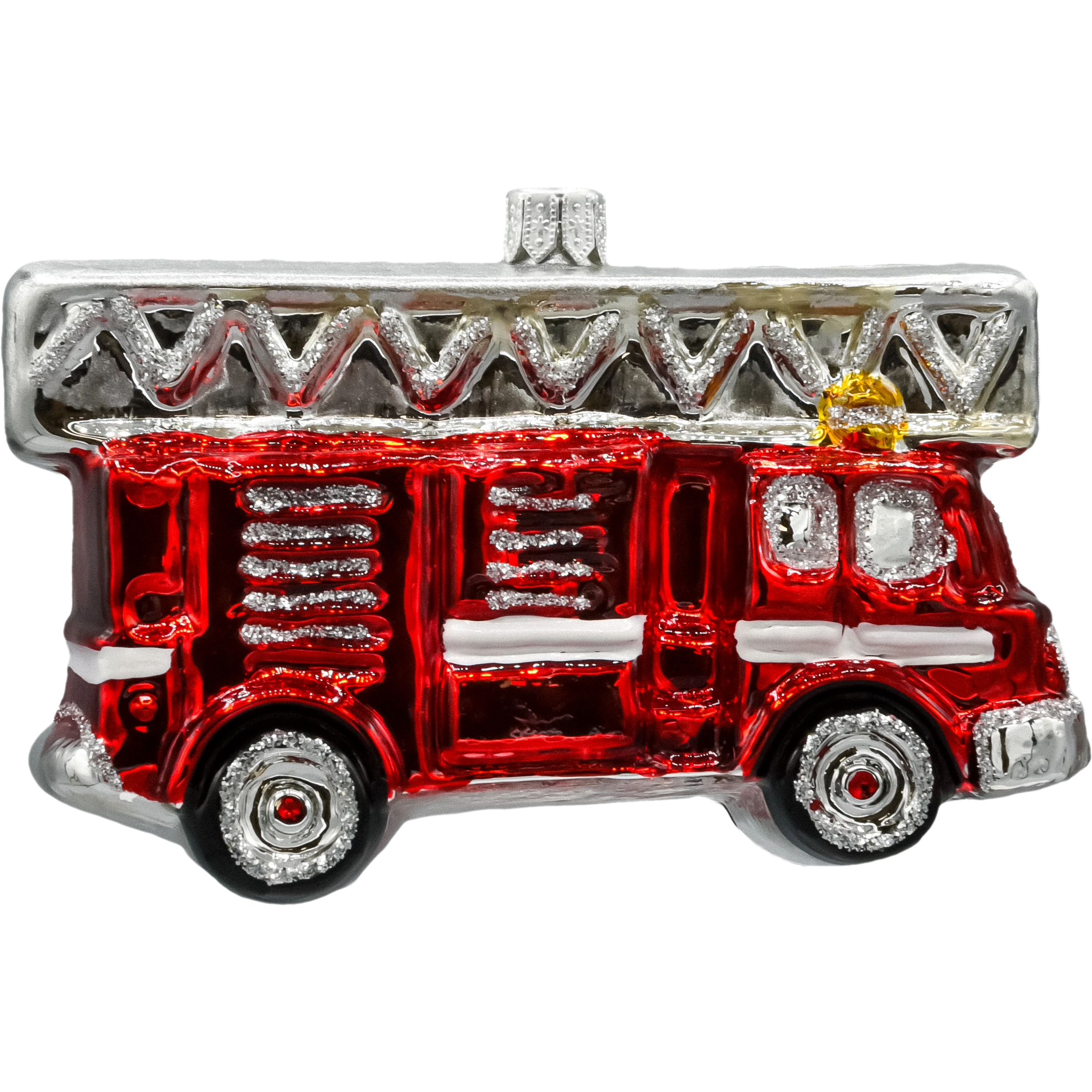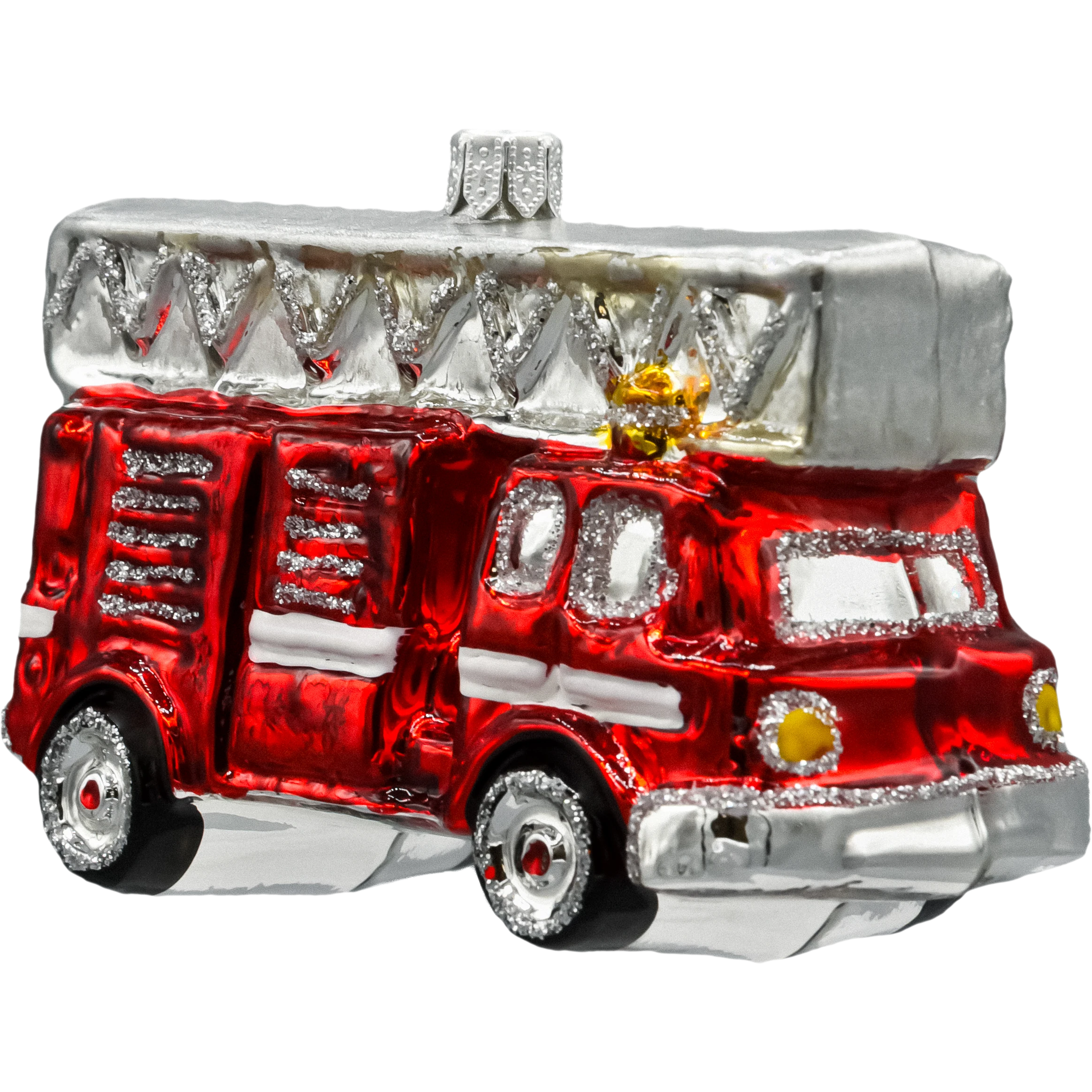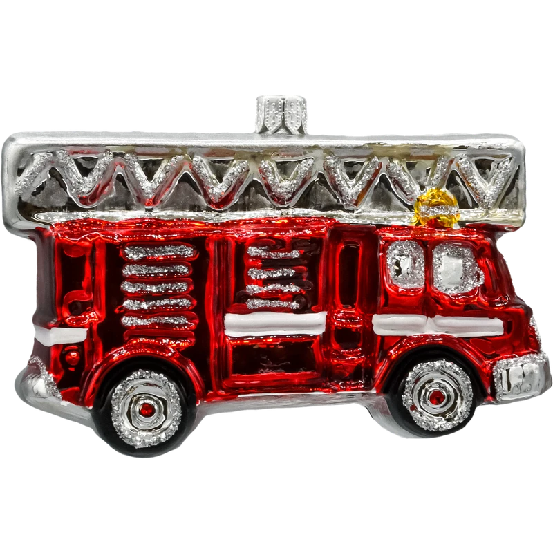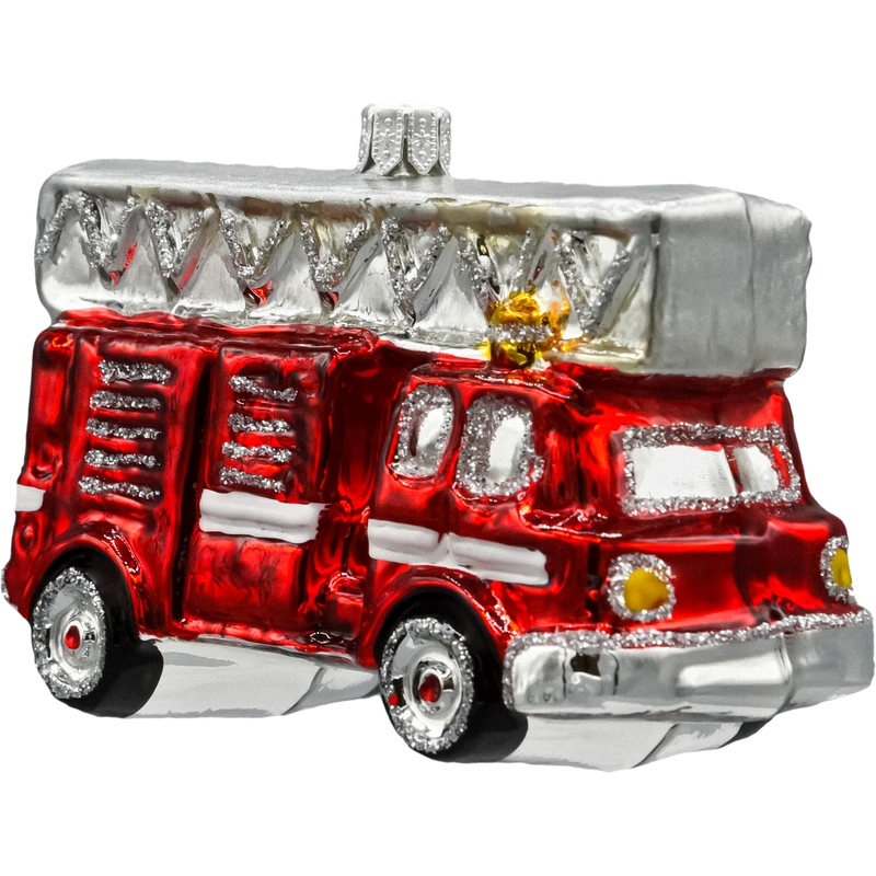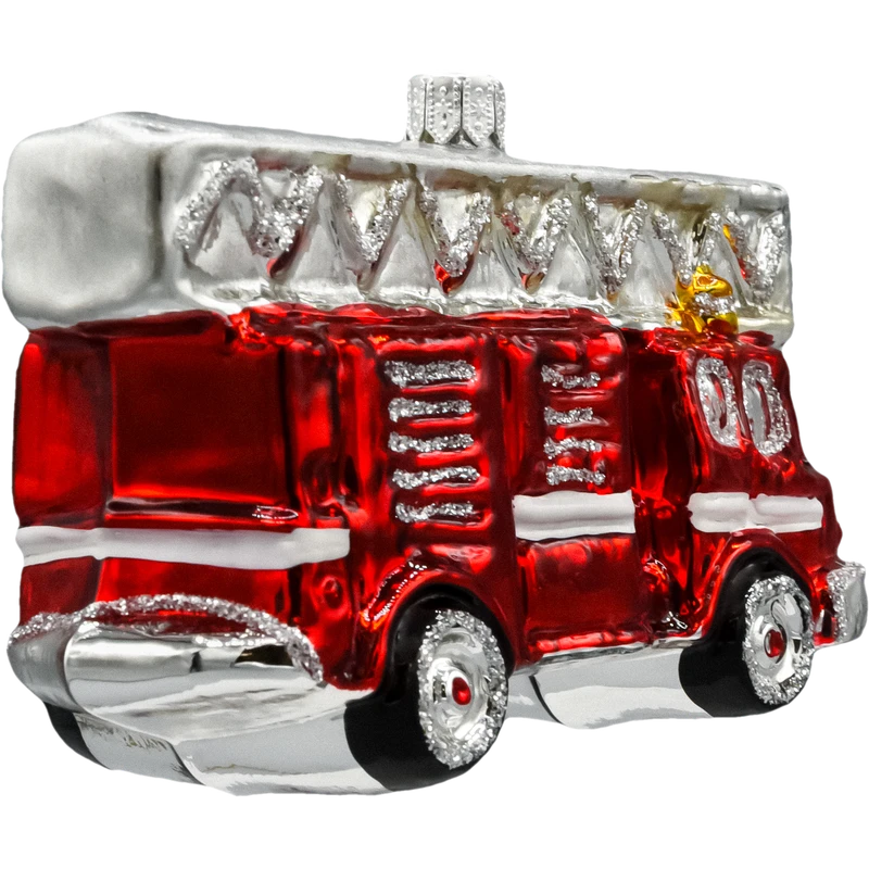 Szklana bombka choinkowa w kształcie wozu strażackiego z drabiną – ręcznie malowana ozdoba świąteczna z dmuchanego szkła. Idealna na choinkę dla dzieci i kolekcjonerów.