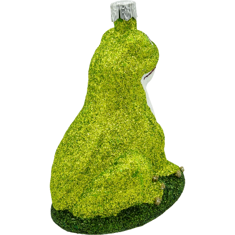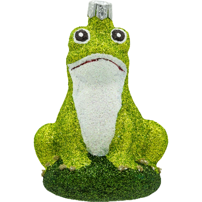 Bombka przedstawia siedzącą żabkę z szeroko otwartymi oczami, wyrażającymi zdziwienie lub lekki zawód – co dodaje jej wyjątkowego charakteru. Całość pokryta jest gęstym, zielonym i białym brokatem, który pięknie odbija światło choinkowych lampek, tworząc efekt iskrzącej się powierzchni. Żabka siedzi na brokatowej zielonej kępce, a jej wyrazista forma została ręcznie wykonana i pomalowana, co gwarantuje unikalność każdej sztuki.